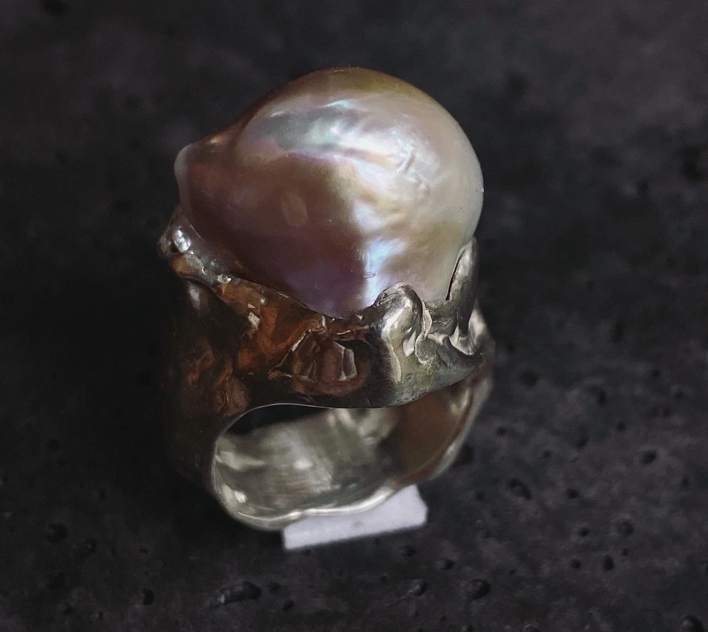 Ring featuring an amorphous shape complemented by a gray baroque pearl. Handmade from 925 sterling silver.