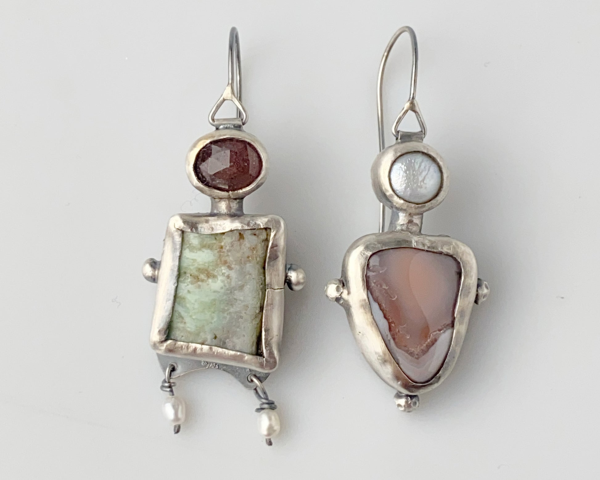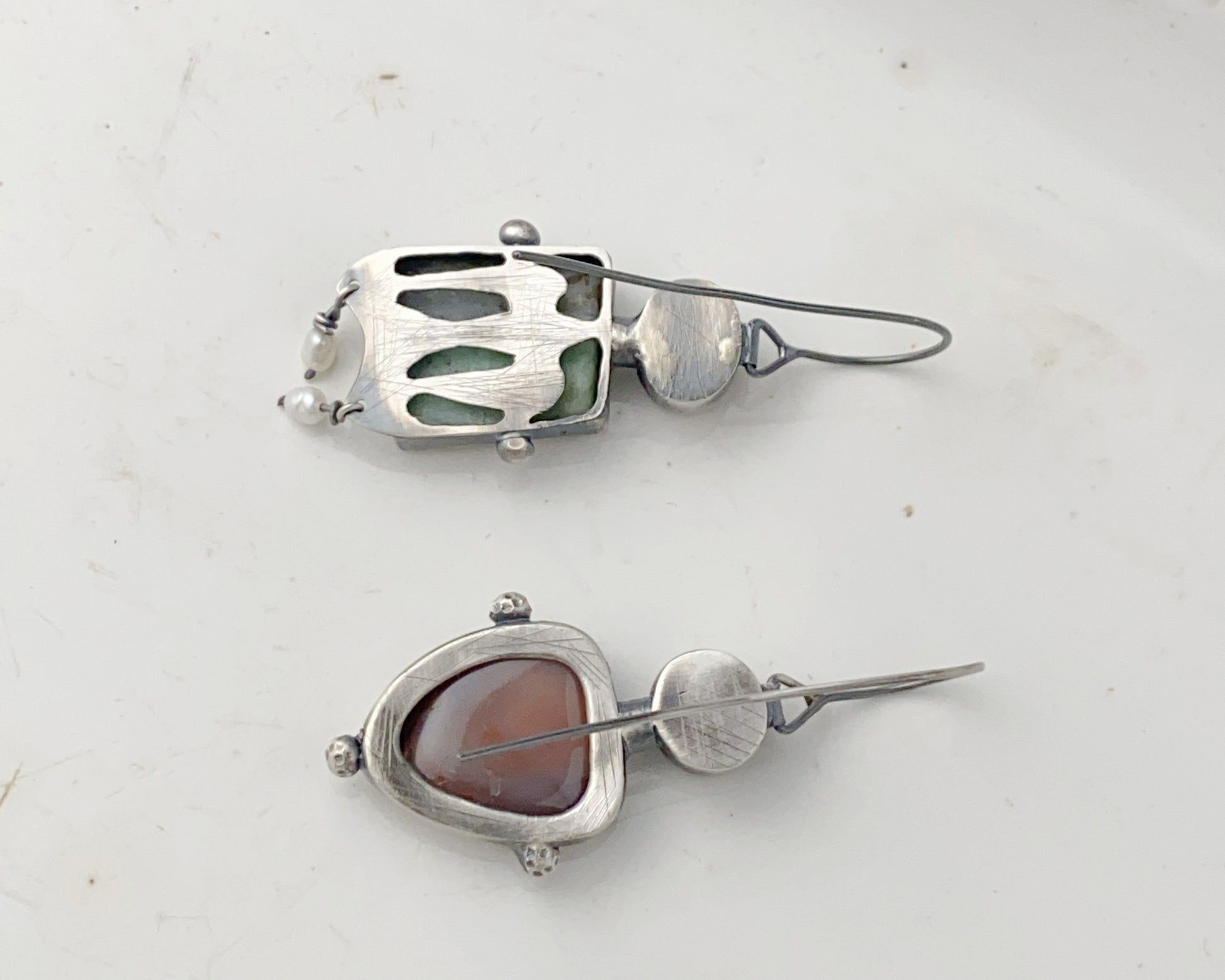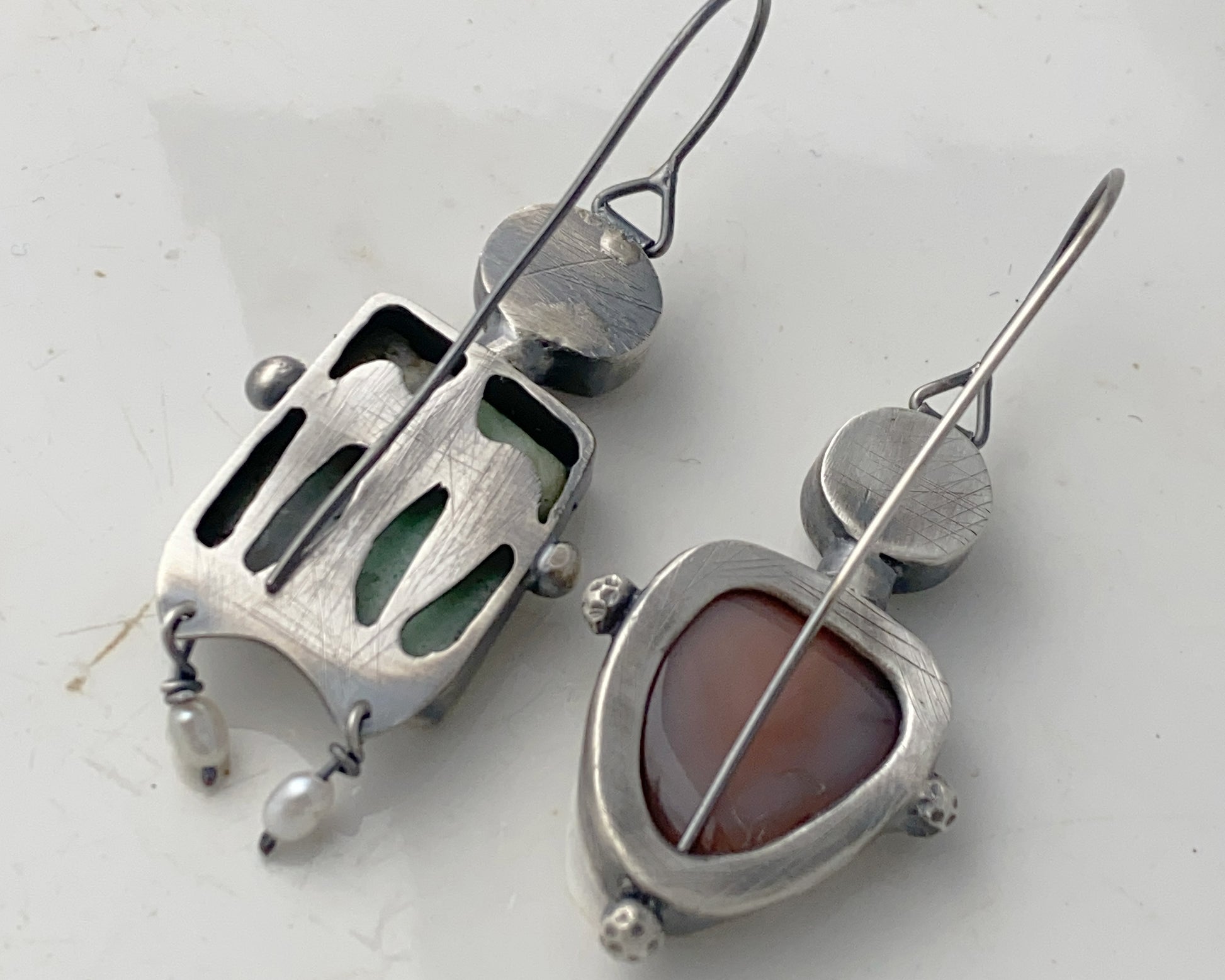 Handmade sterling silver earrings with chrysoprase, strawberry quartz, agate, and pearl. Asymmetrical design with different shapes. One earring features a rectangular green chrysoprase with strawberry quartz and pearl accents. The back side has a carved bird ornament. The second earring features agate with a large pearl. The earrings have a rich aged texture.