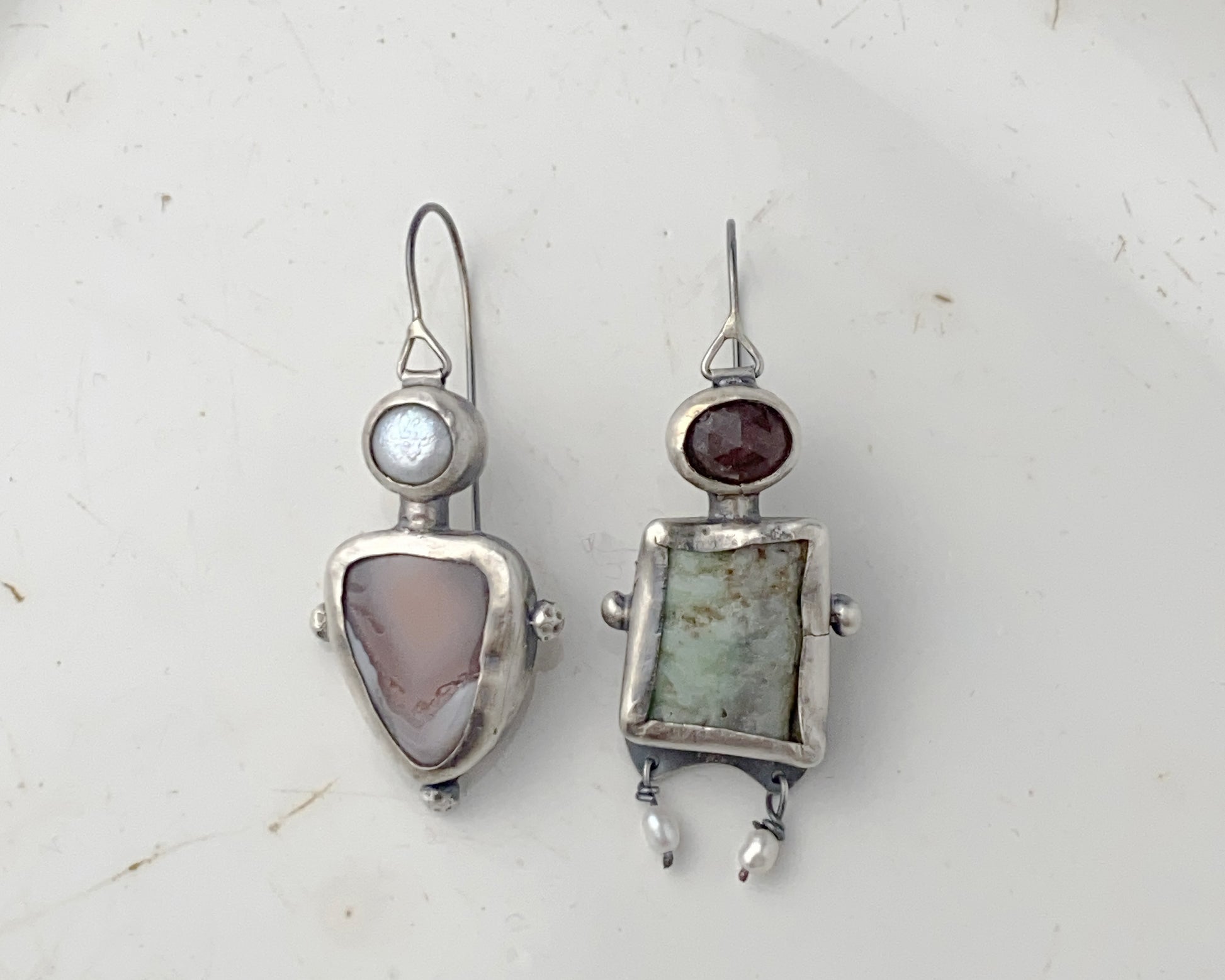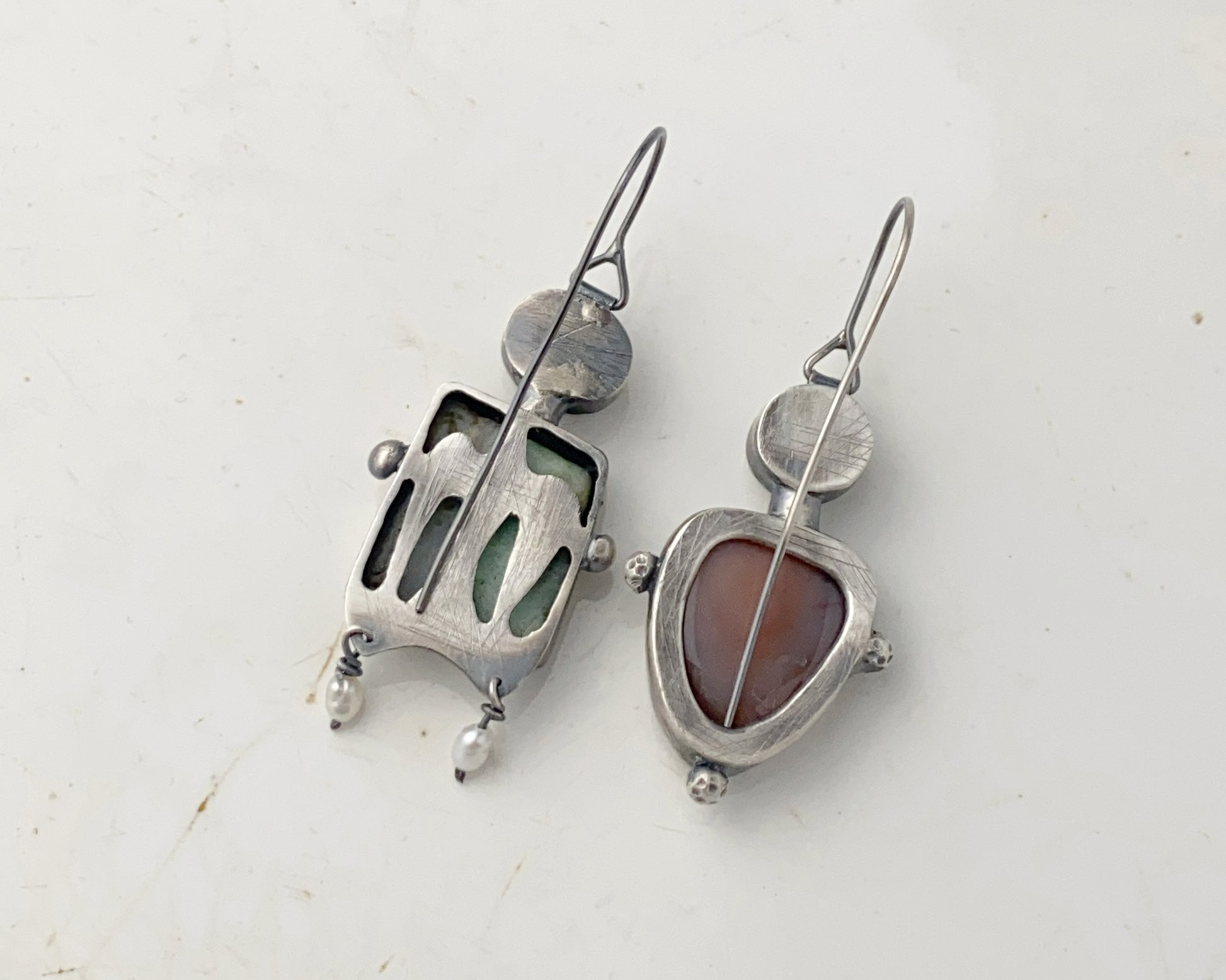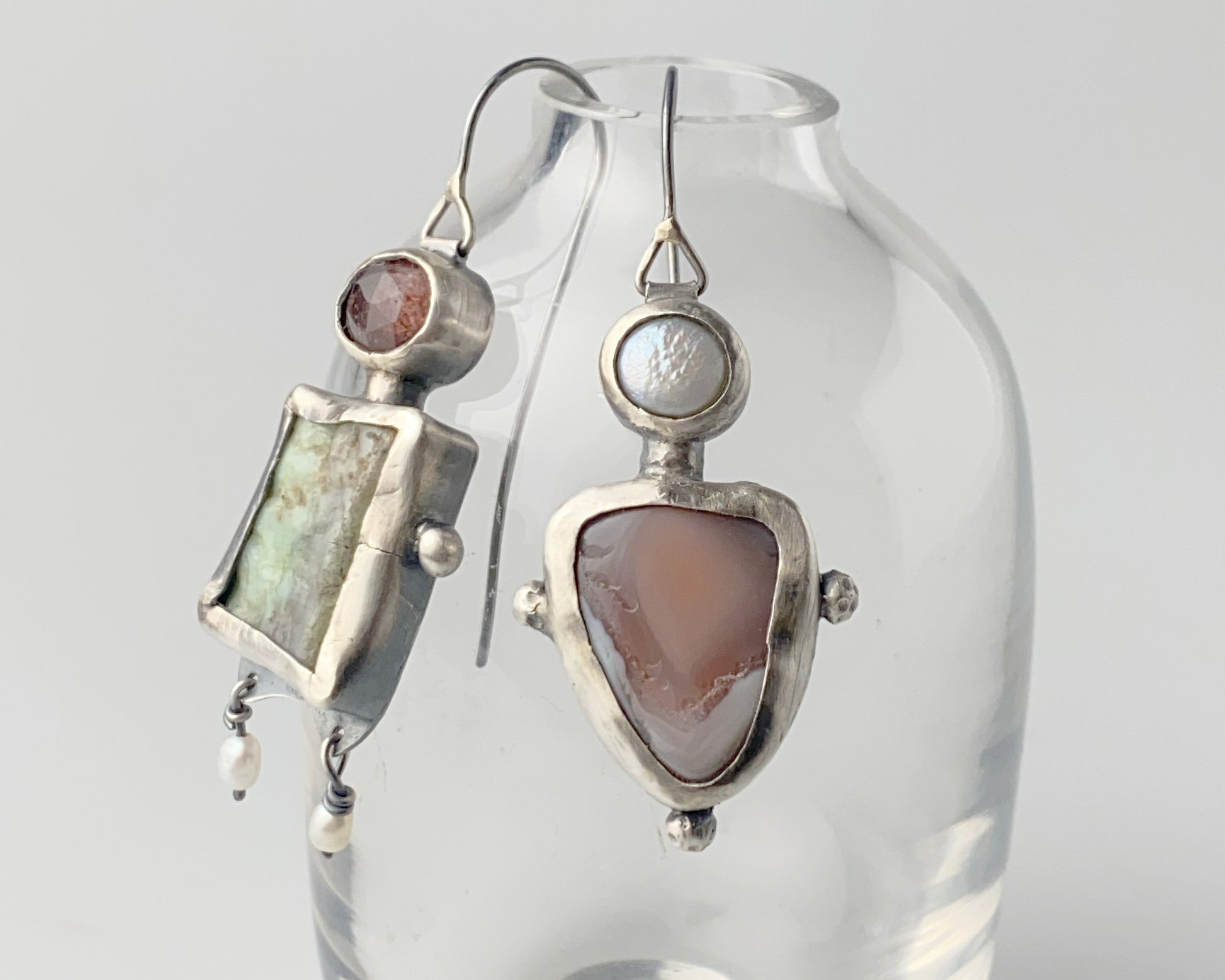 Handmade sterling silver earrings with chrysoprase, strawberry quartz, agate, and pearl. Asymmetrical design with different shapes. One earring features a rectangular green chrysoprase with strawberry quartz and pearl accents. The back side has a carved bird ornament. The second earring features agate with a large pearl. The earrings have a rich aged texture.