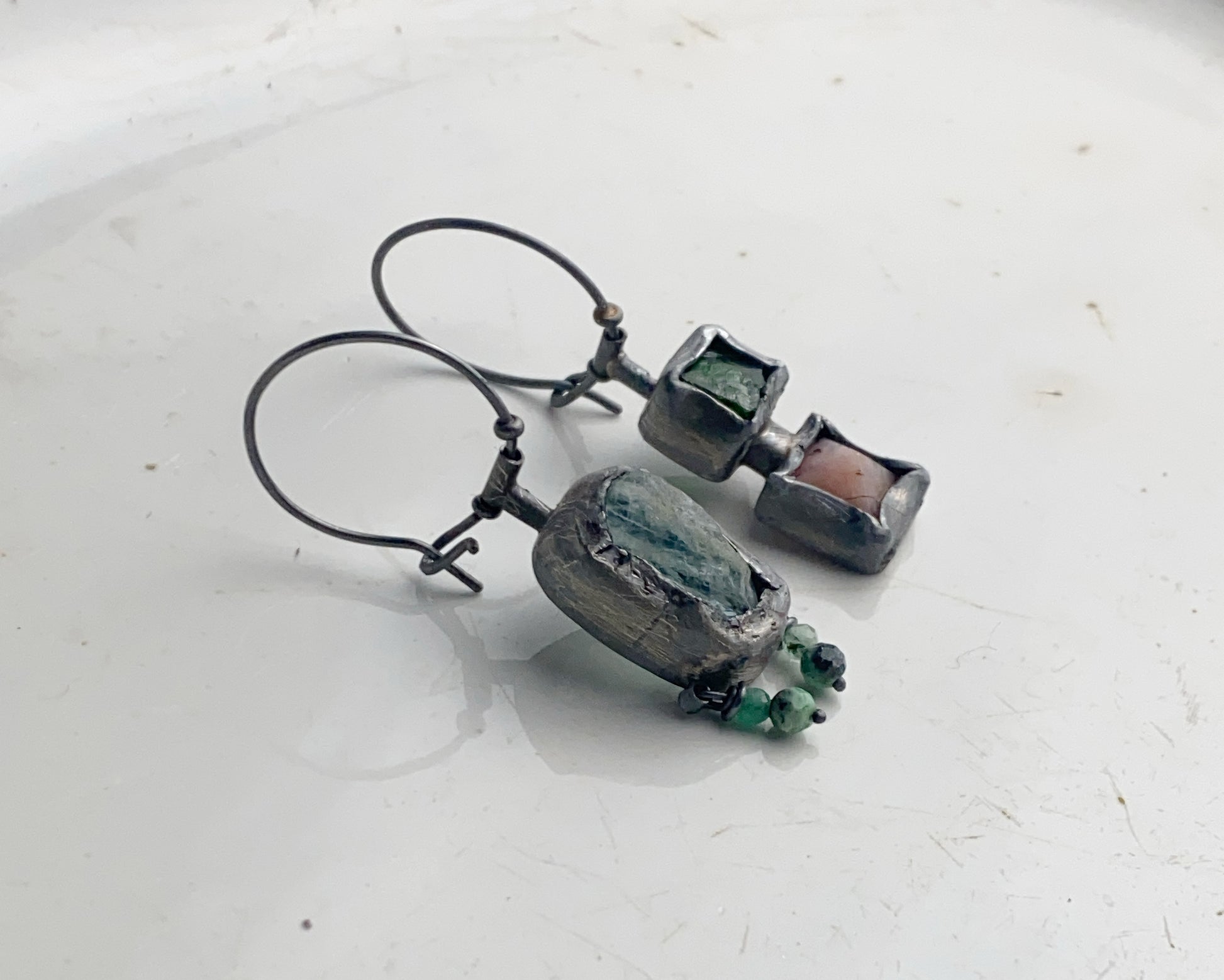 Handcrafted mismatched earrings with a raw, rustic finish. One earring features a pale aquamarine set in oxidized metal, complemented by two small emerald beads. The other combines a vivid chrome diopside with a softly shimmering pink opal, each housed in textured, hand-forged metal. The contrast in shape, color, and gemstone pairing gives the piece its distinctive asymmetrical character.