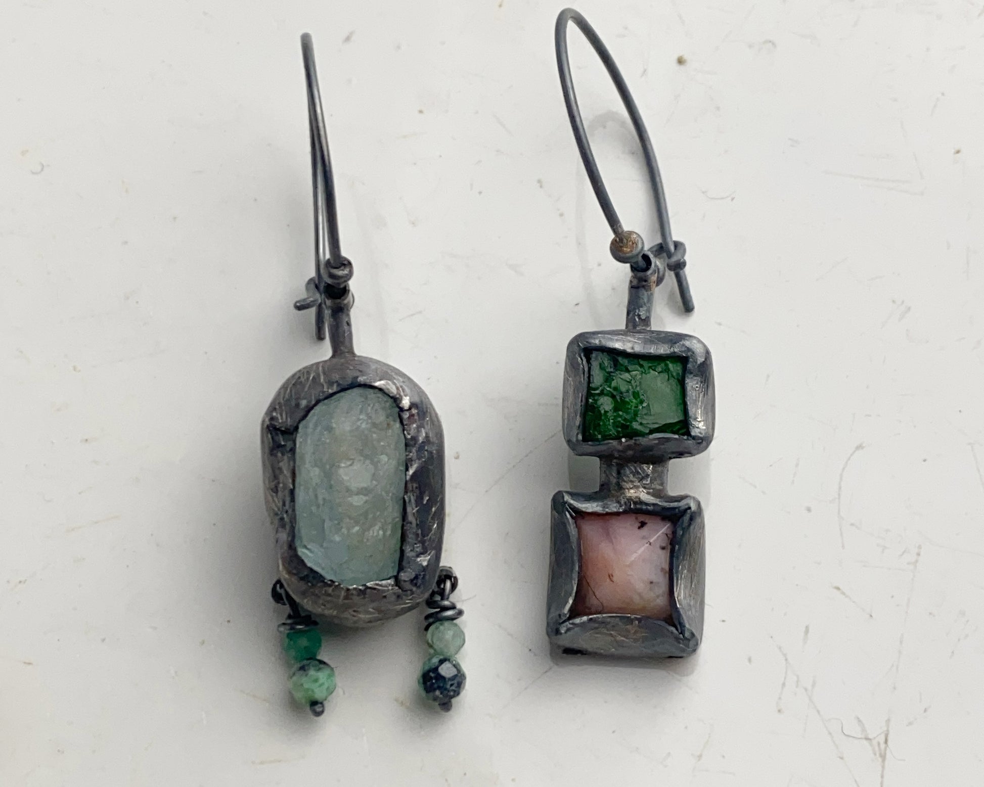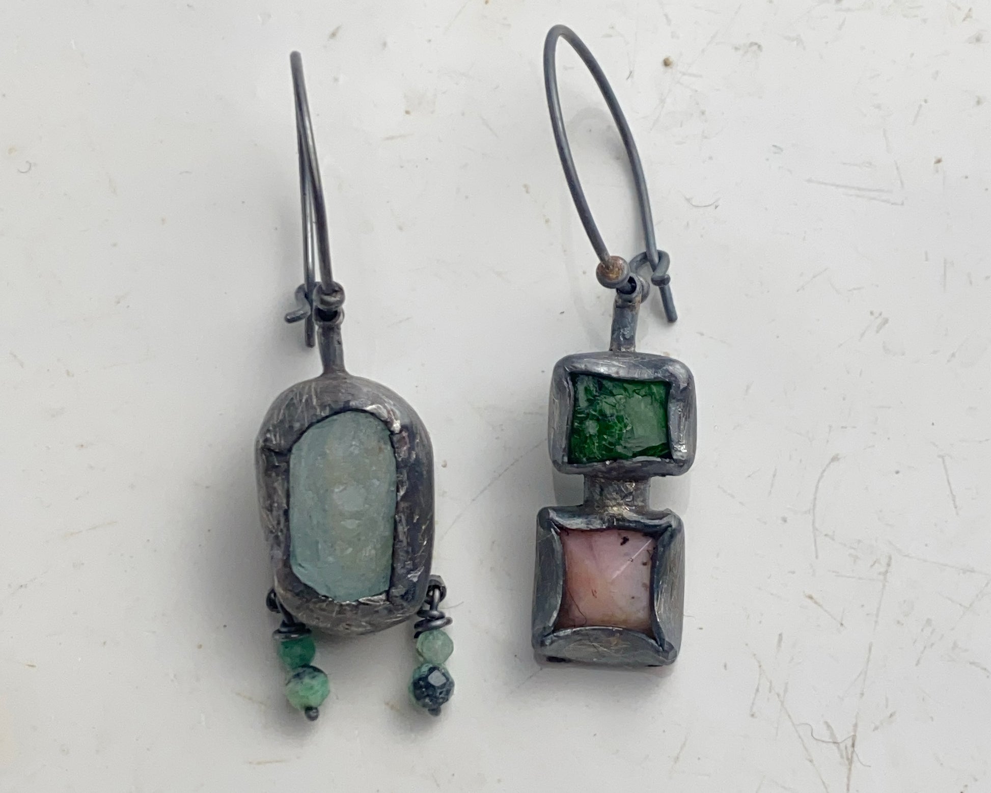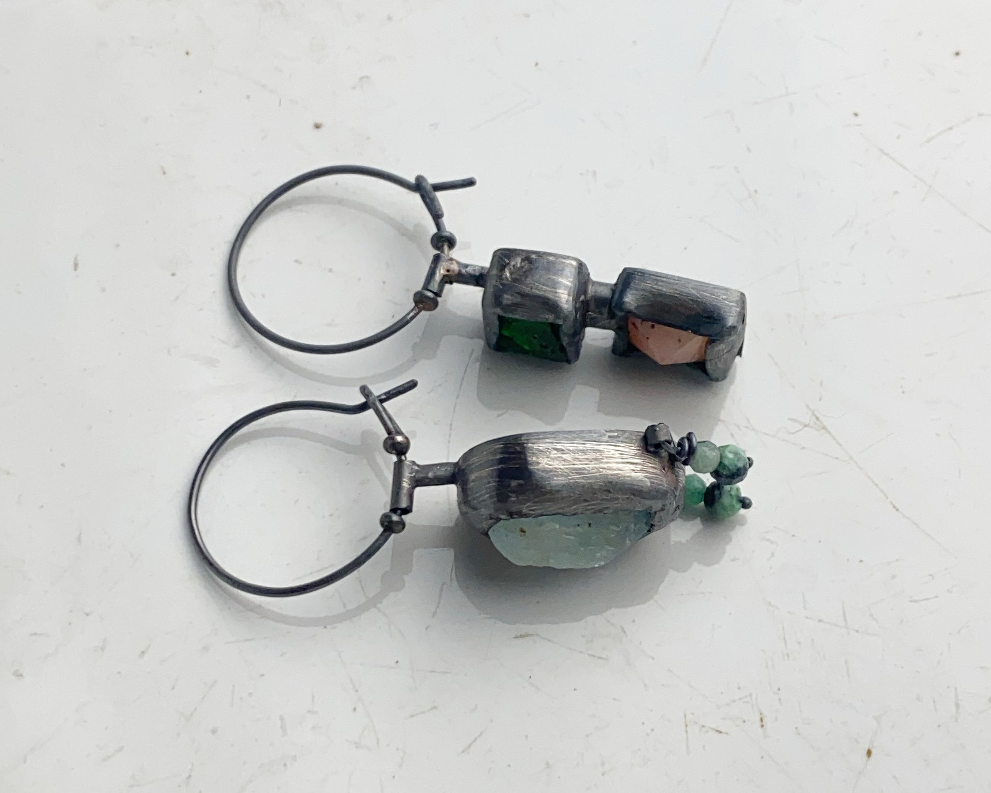 Asymmetrical Earrings with Aquamarine, Emerald, Chrome Diopside, and Pink Opal