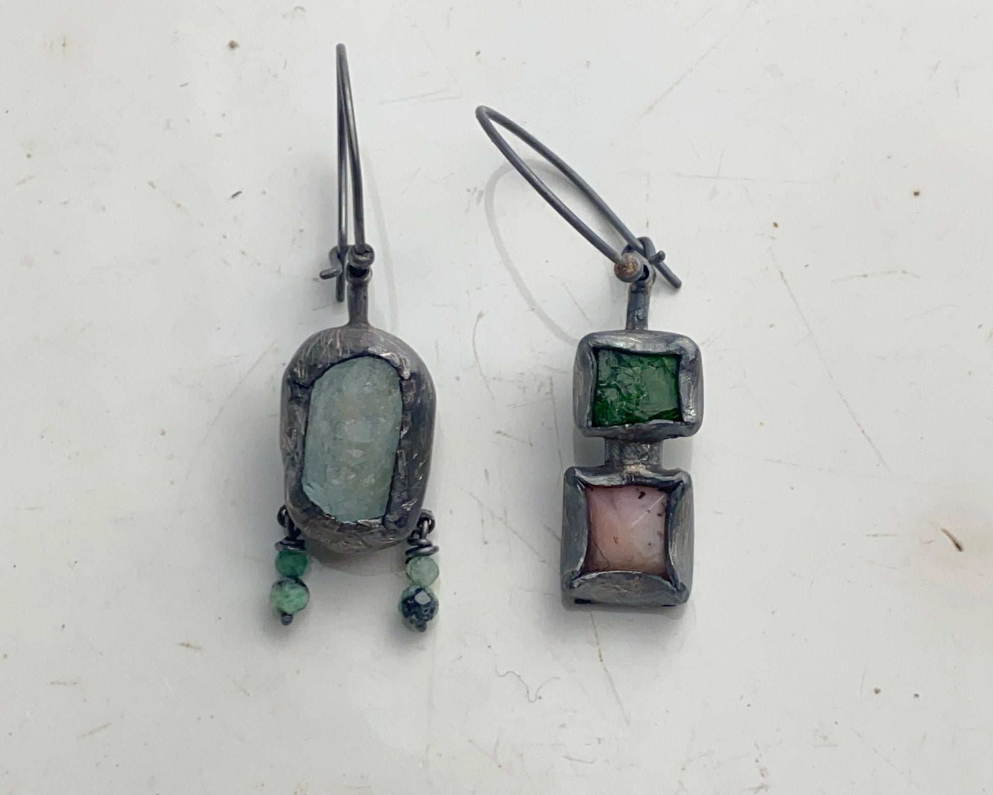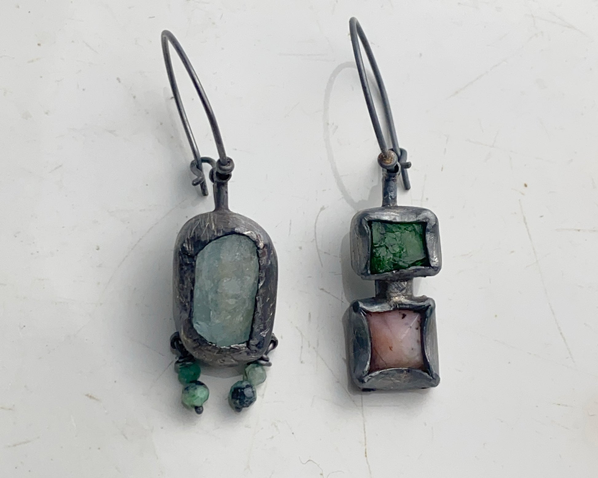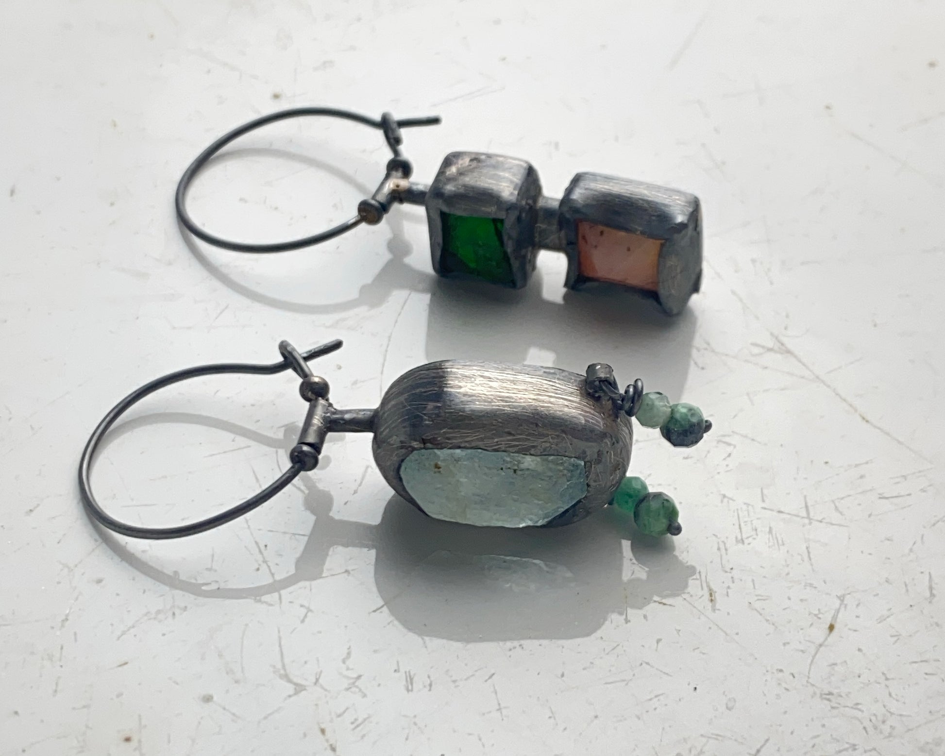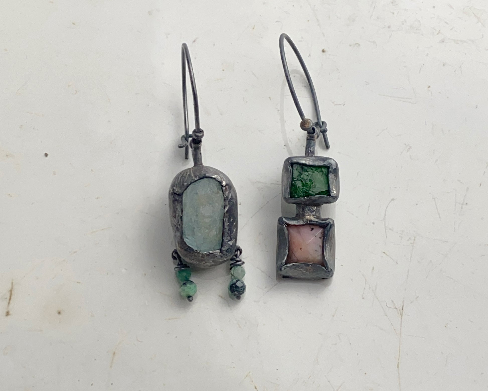 Asymmetrical Earrings with Aquamarine, Emerald, Chrome Diopside, and Pink Opal