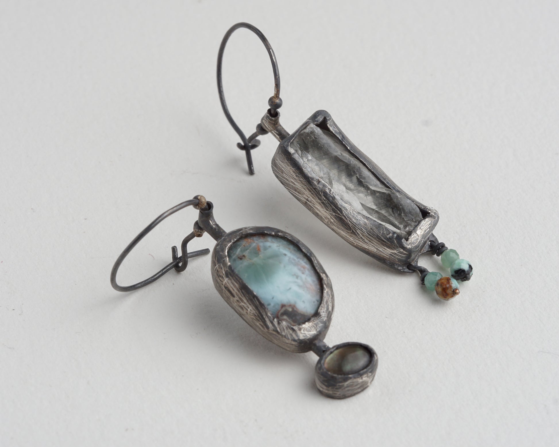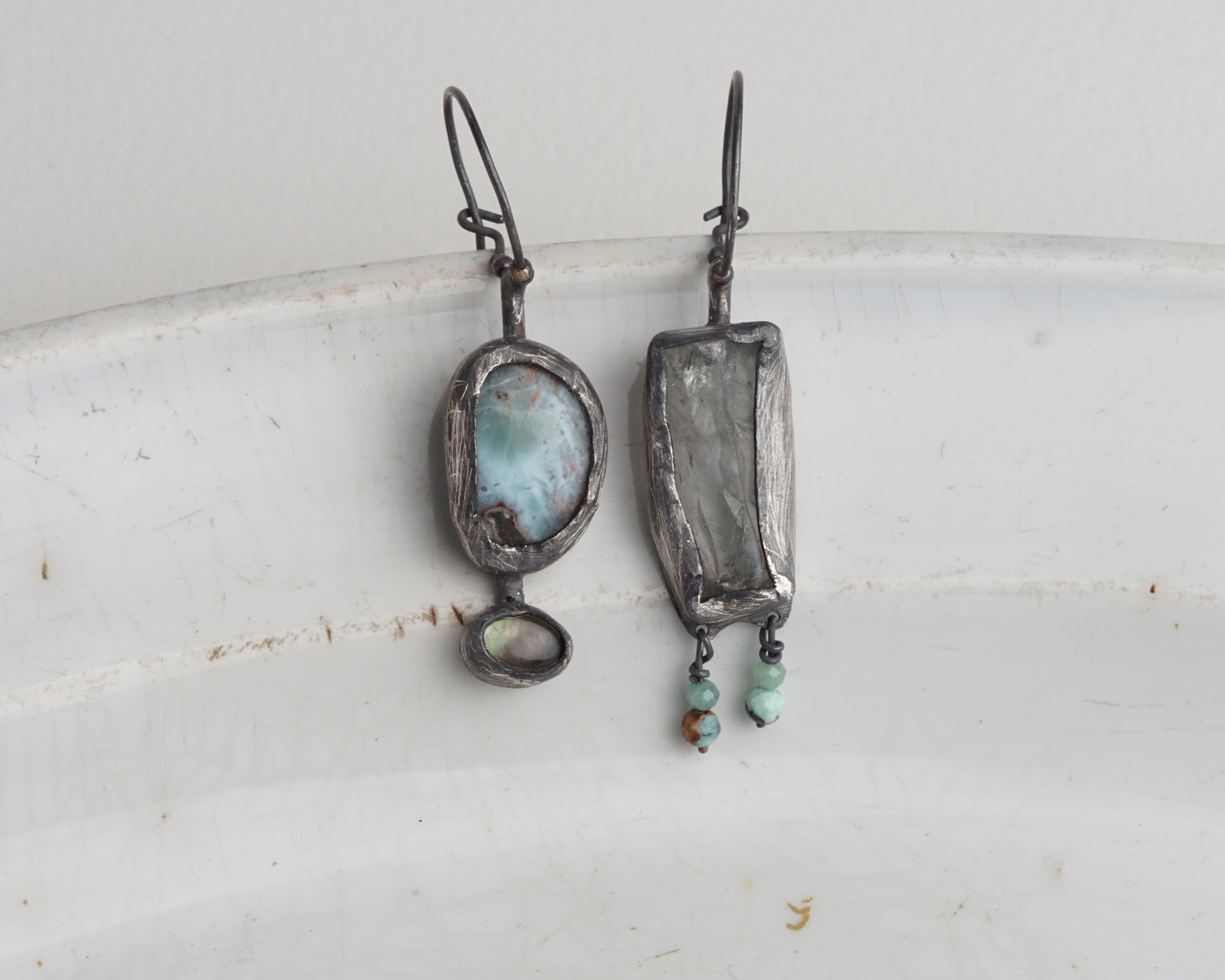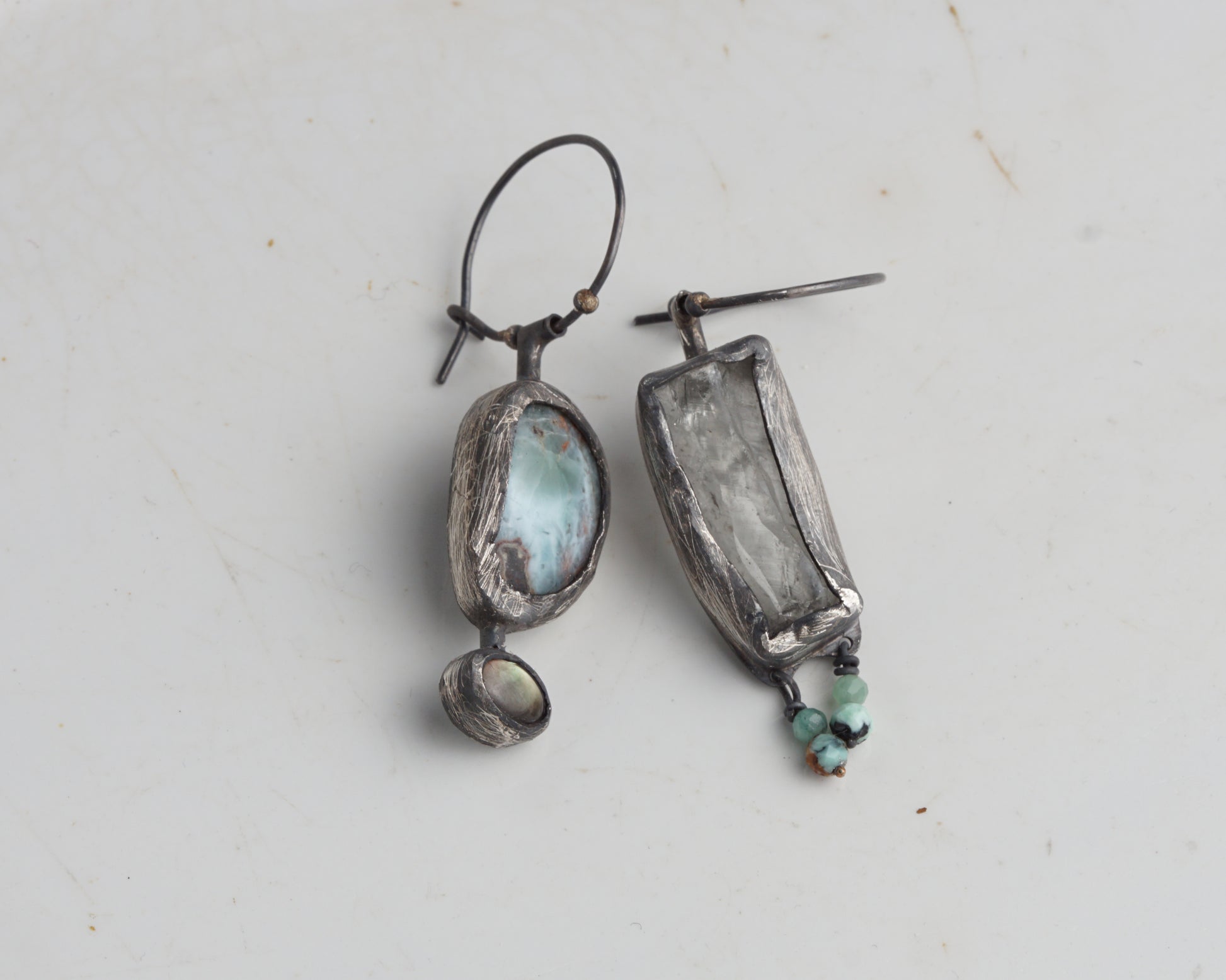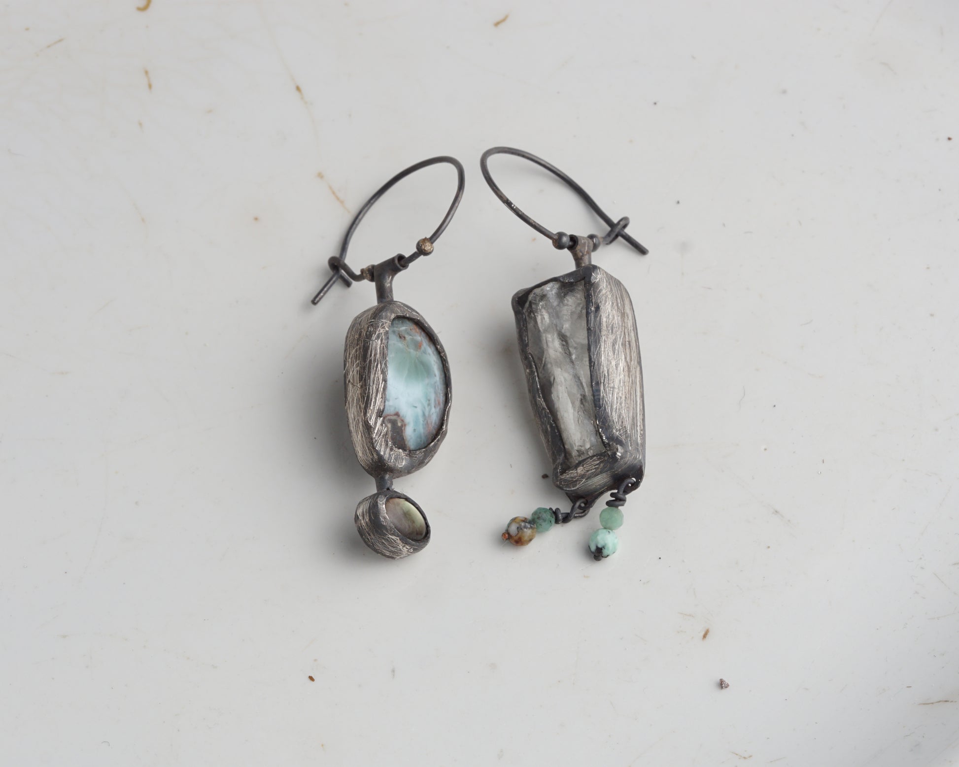An asymmetrical pair of handcrafted earrings featuring a thoughtful composition of natural stones. One earring showcases a rectangular prasiolite set in textured, oxidized sterling silver, adorned with dangling emerald beads. Its pair highlights a polished Larimar framed in dark silver, complemented by a luminous Black Abalone shell cabochon. Each earring has its own distinct structure, yet they share a raw, elemental aesthetic.