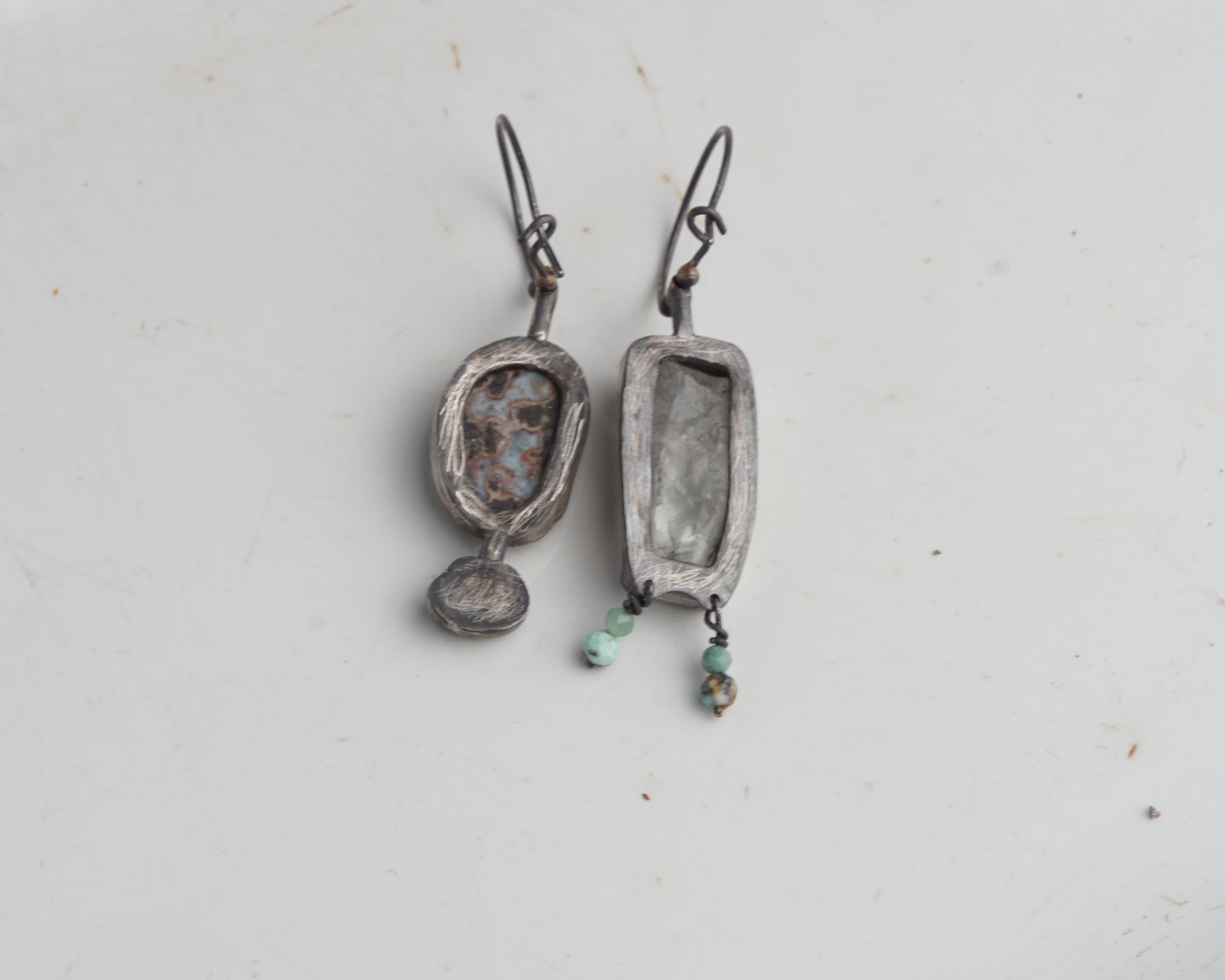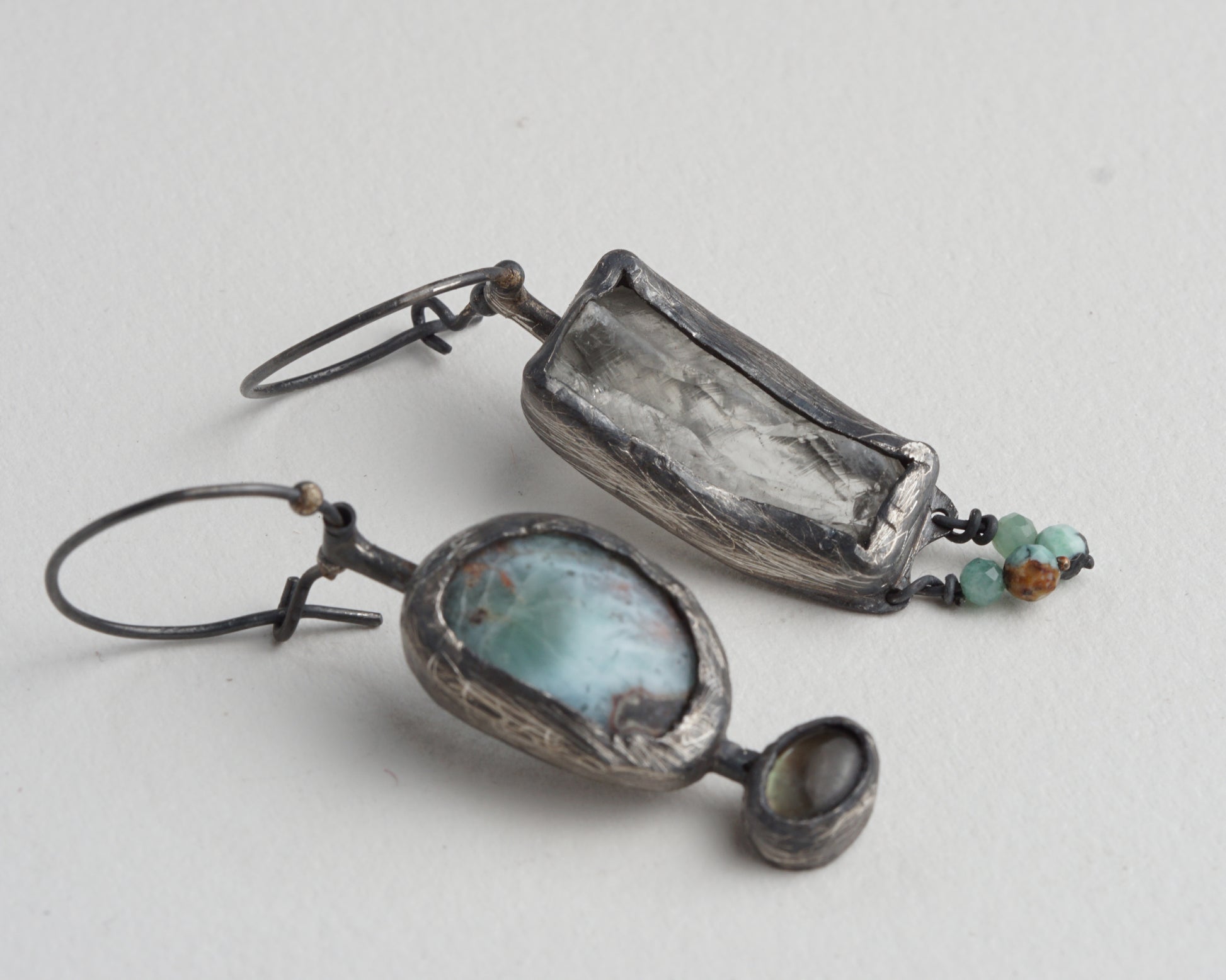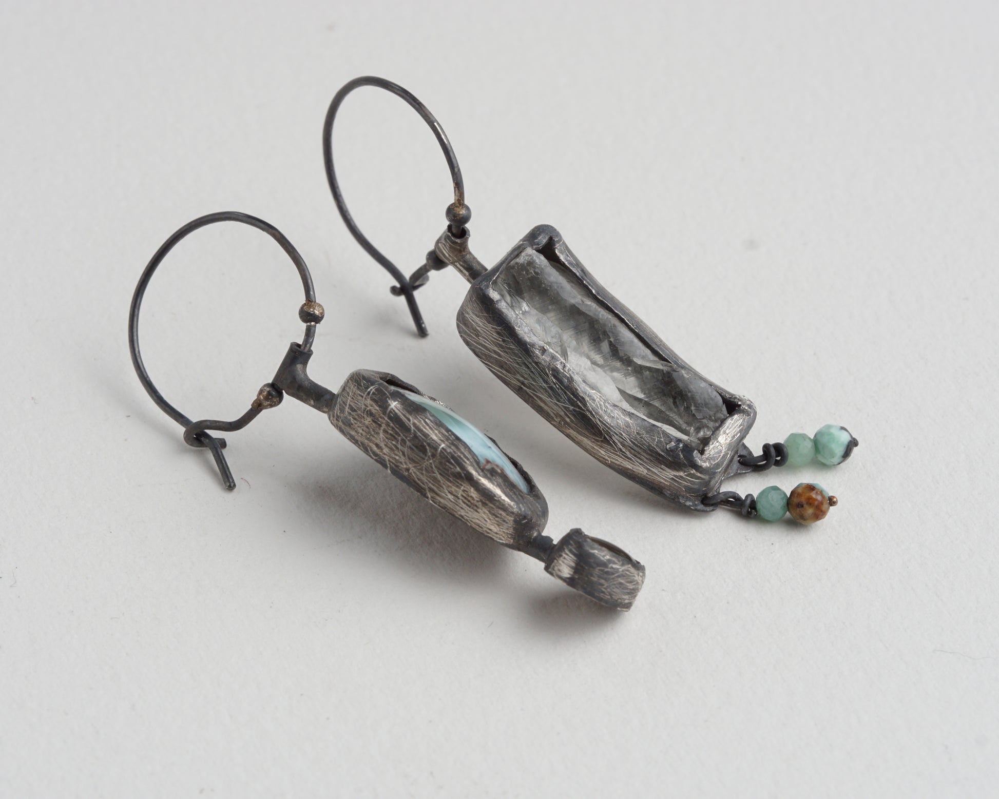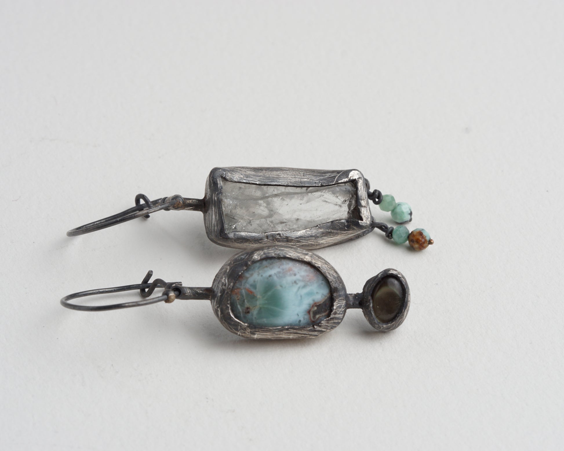 An asymmetrical pair of handcrafted earrings featuring a thoughtful composition of natural stones. One earring showcases a rectangular prasiolite set in textured, oxidized sterling silver, adorned with dangling emerald beads. Its pair highlights a polished Larimar framed in dark silver, complemented by a luminous Black Abalone shell cabochon. Each earring has its own distinct structure, yet they share a raw, elemental aesthetic.