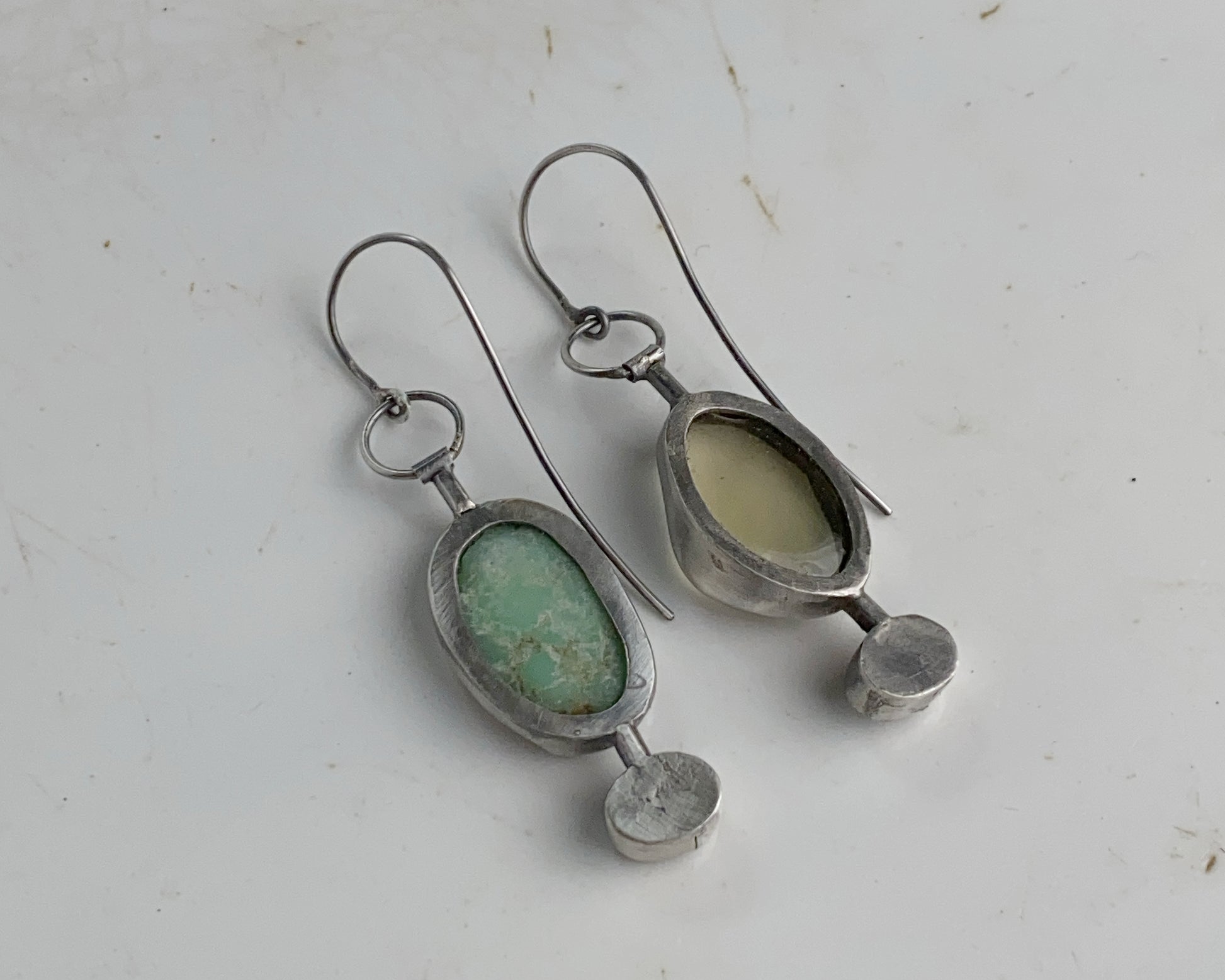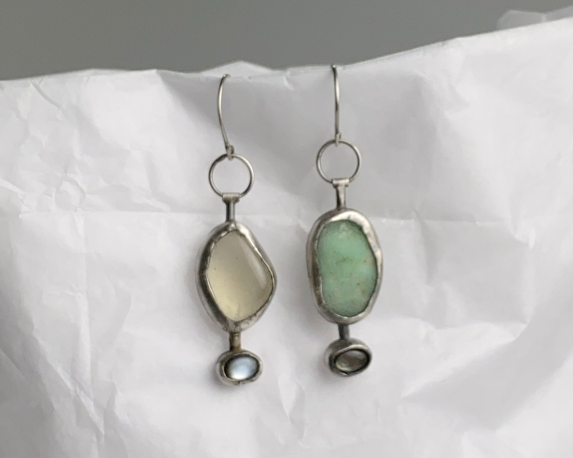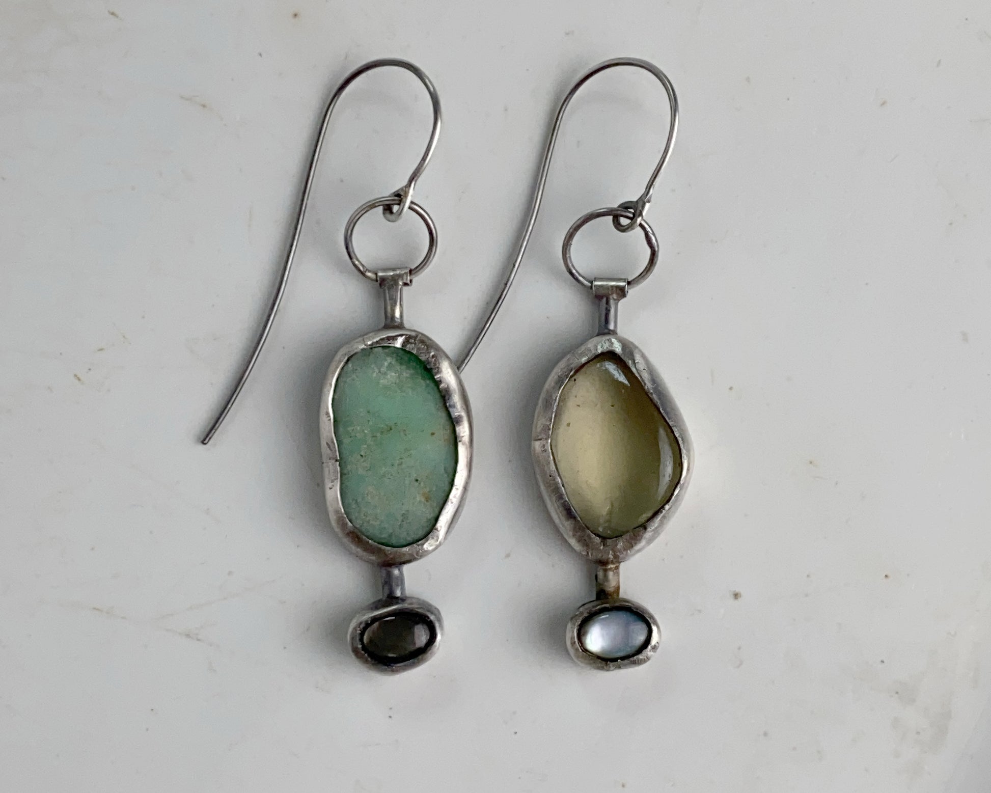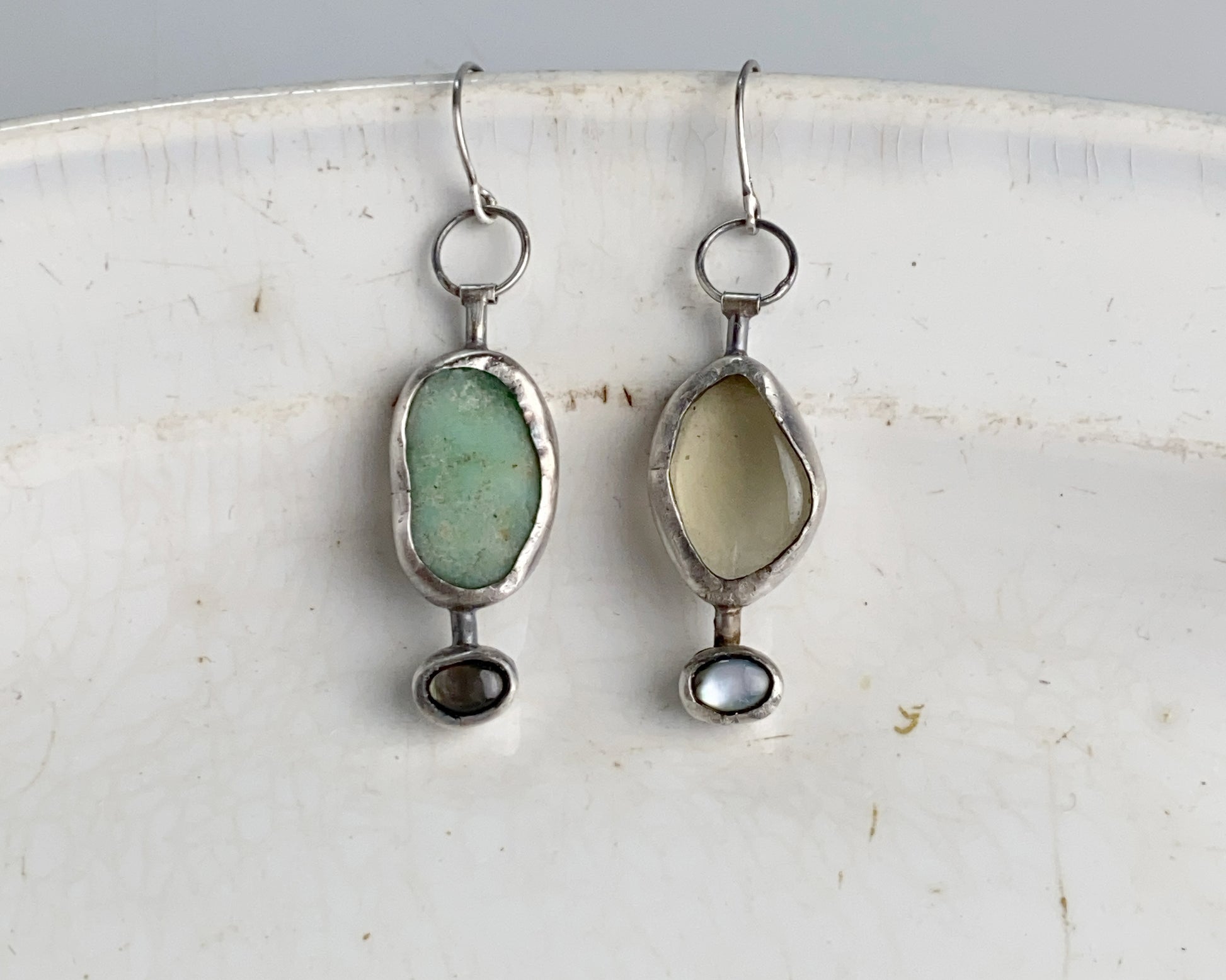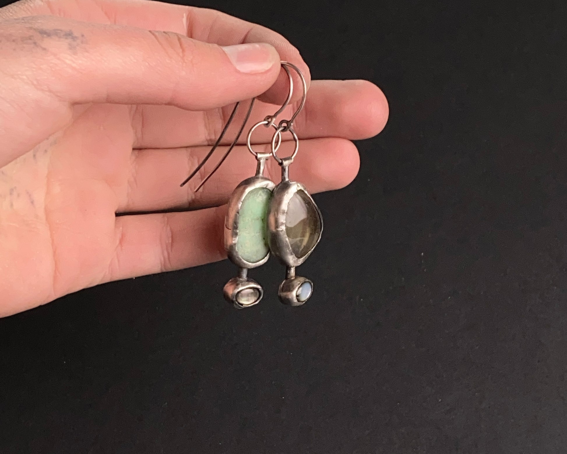 Sterling silver handcrafted earrings featuring Black Abalone shell, lemon quartz, and chrysoprase stones.