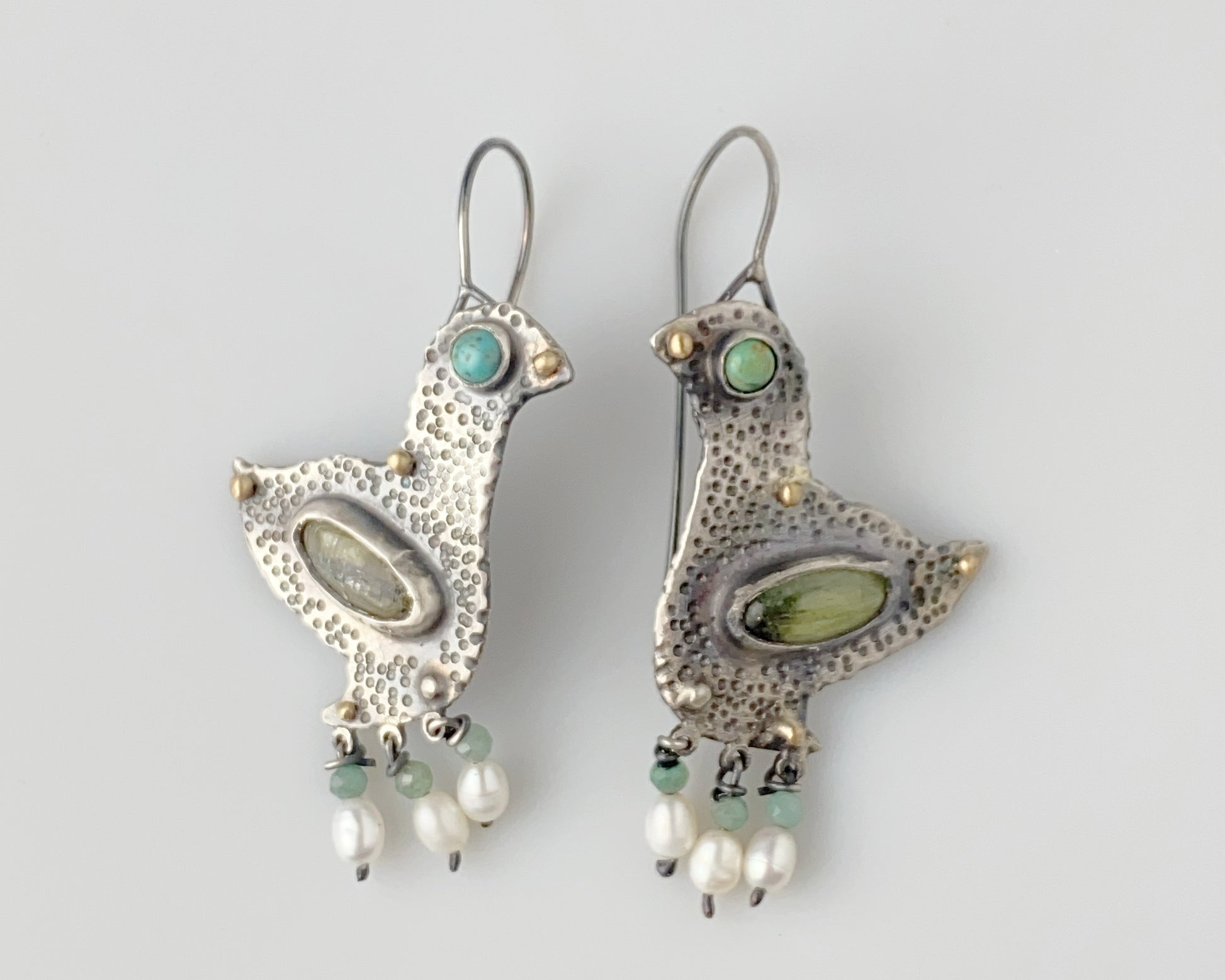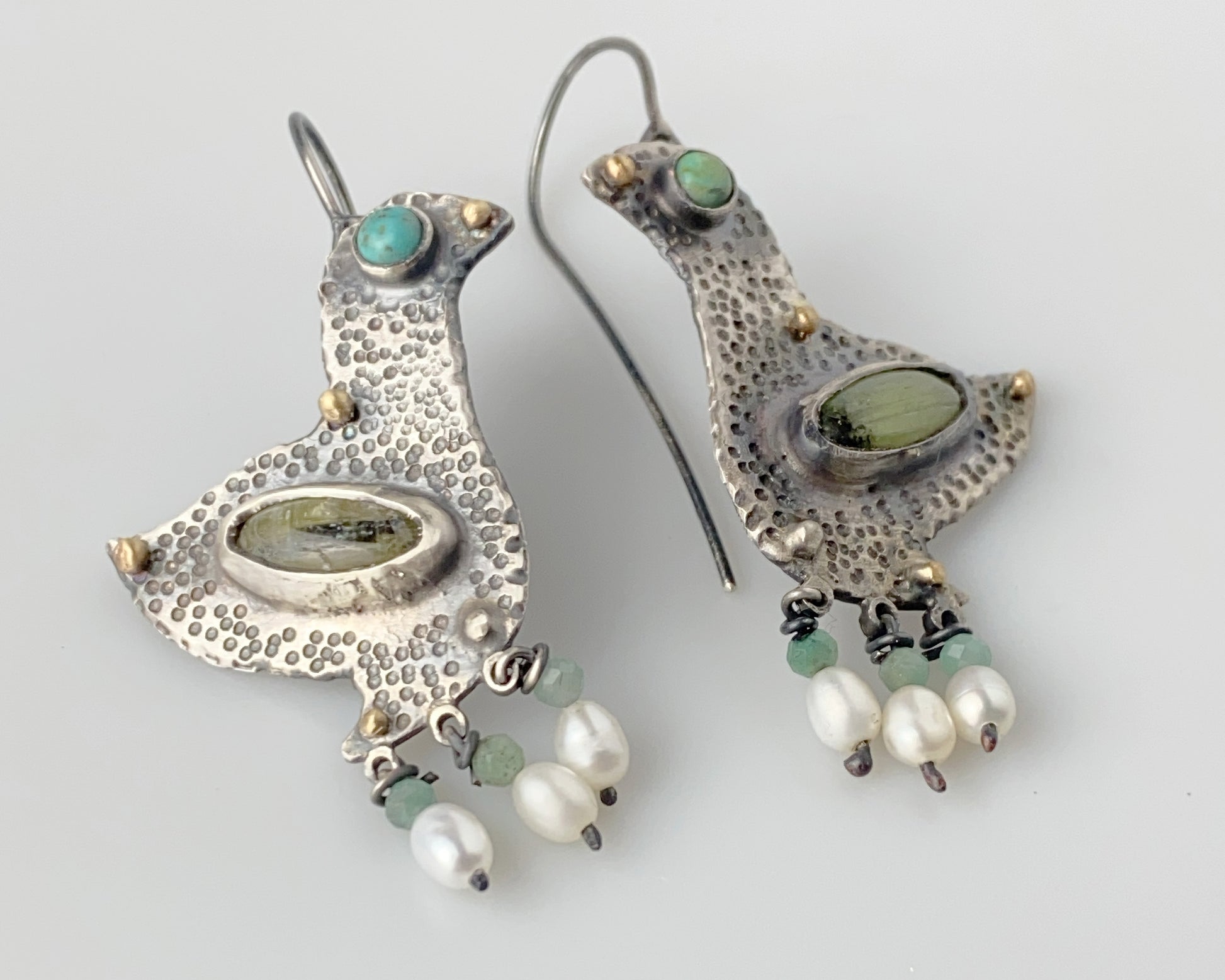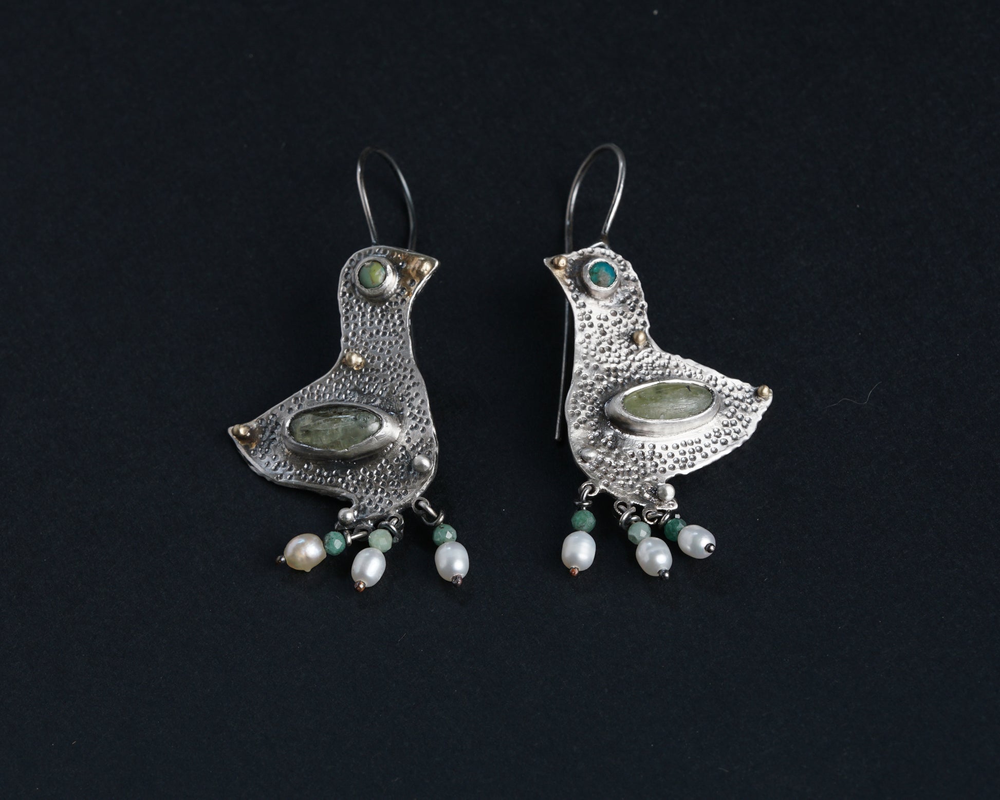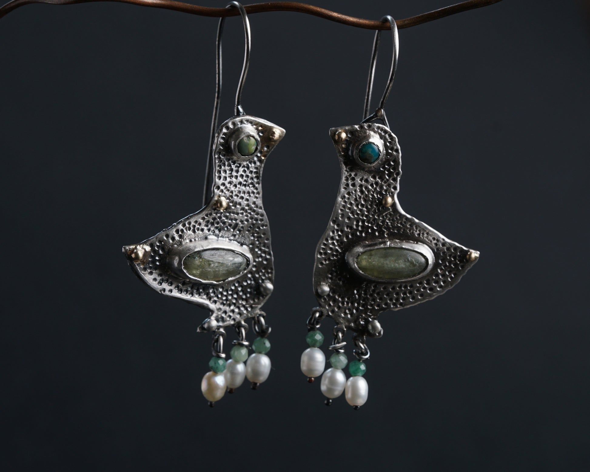 These handcrafted bird-shaped earrings feature a textured silver body with delicate hammered details. Each earring is adorned with a turquoise eye, oval green kyanite, and gold accents. Small emerald beads and freshwater pearls dangle from the bottom, creating a subtle movement effect. The unique mixed-metal design combines sterling silver with gold elements.