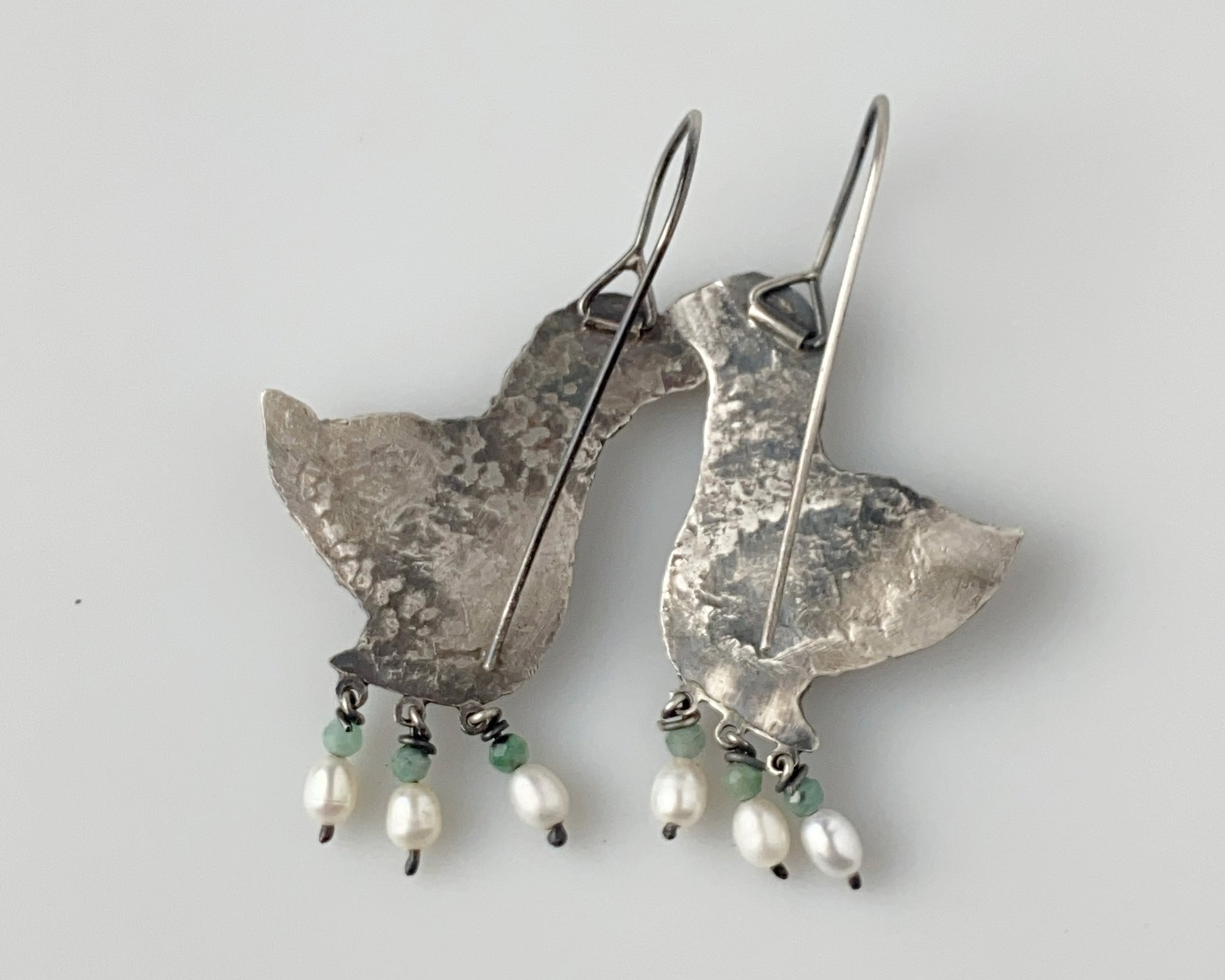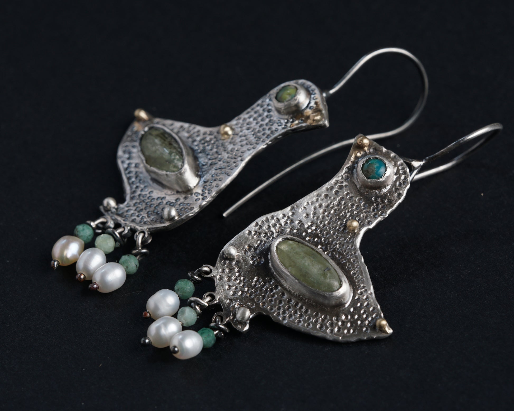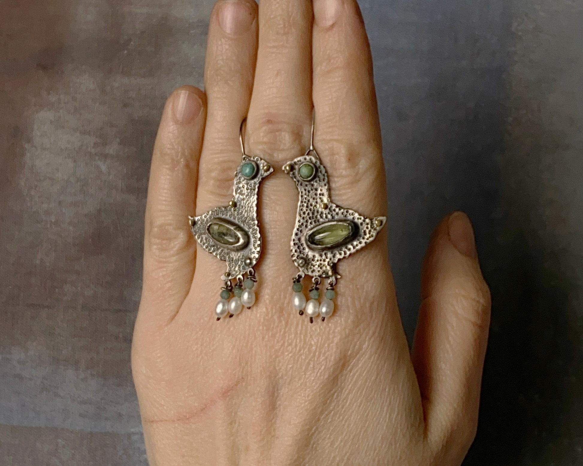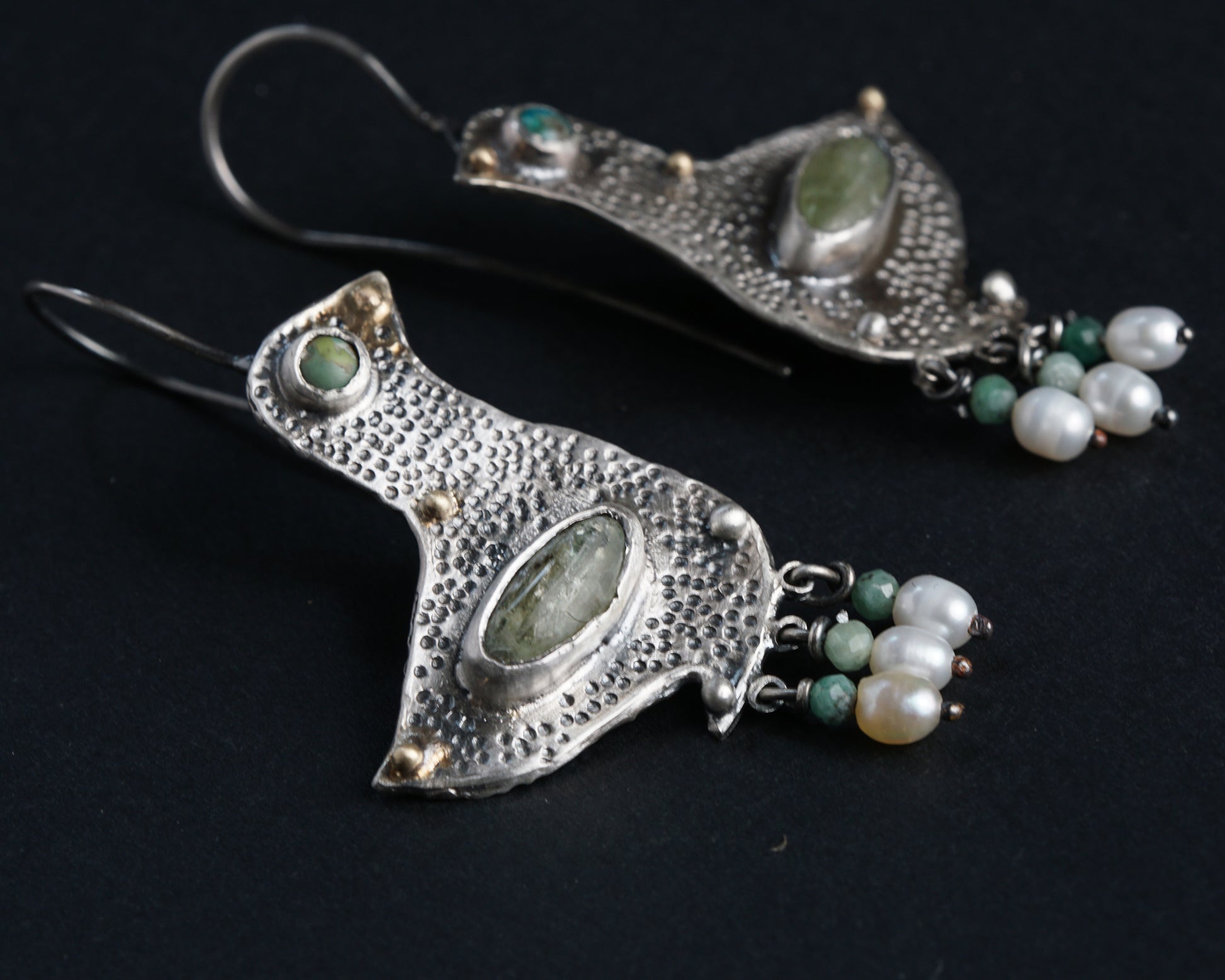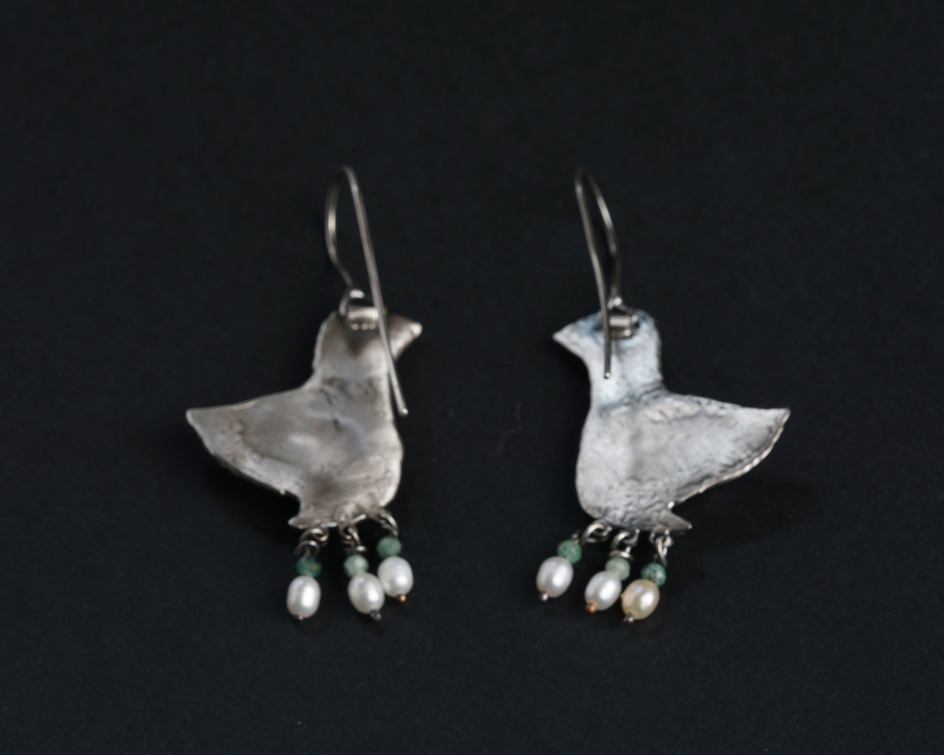 These handcrafted bird-shaped earrings feature a textured silver body with delicate hammered details. Each earring is adorned with a turquoise eye, oval green kyanite, and gold accents. Small emerald beads and freshwater pearls dangle from the bottom, creating a subtle movement effect. The unique mixed-metal design combines sterling silver with gold elements.