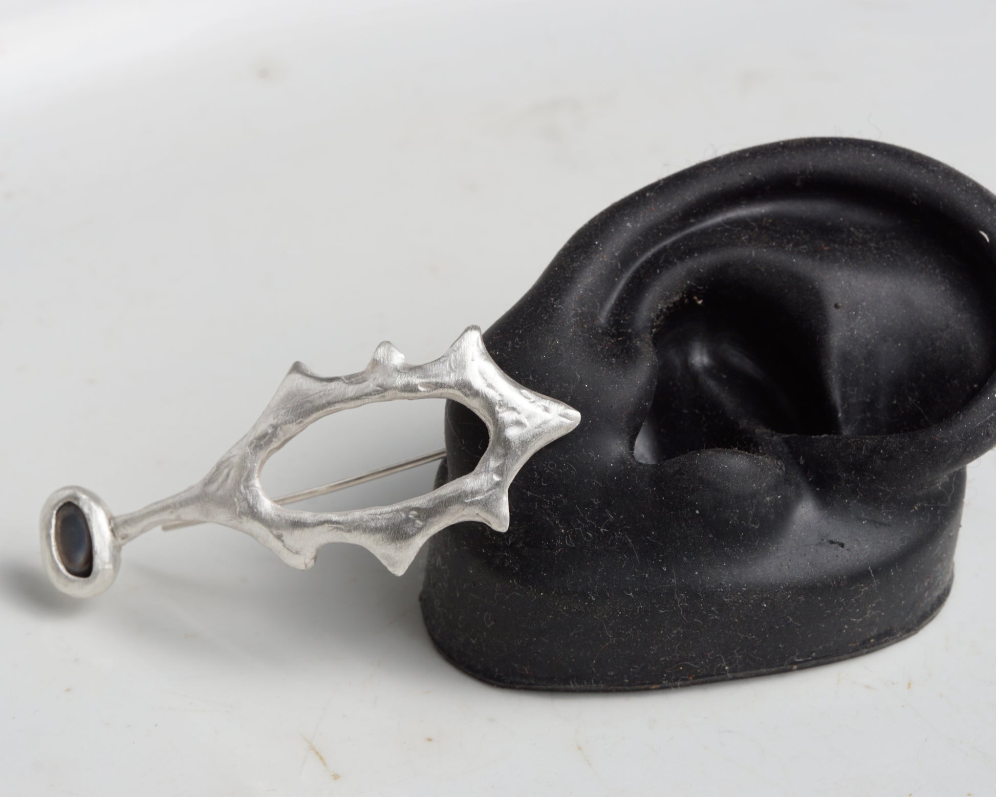 Earrings of an unusual sculptural form made from pure silver with a matte finish. Each piece is set with a Black Abalone shell cabochon, chosen for its natural depth of color. The earrings feature an extended hook design that helps them stay securely in the ear.