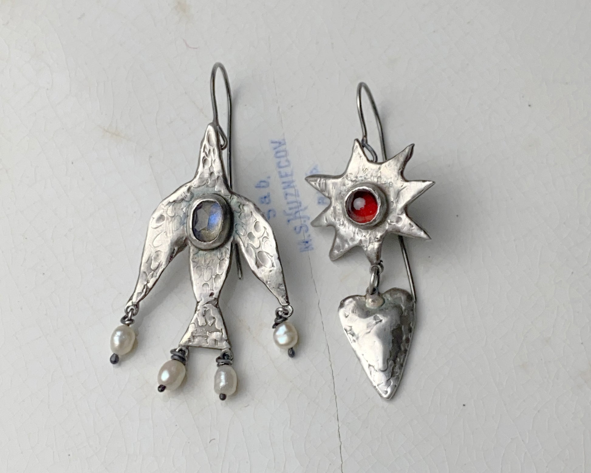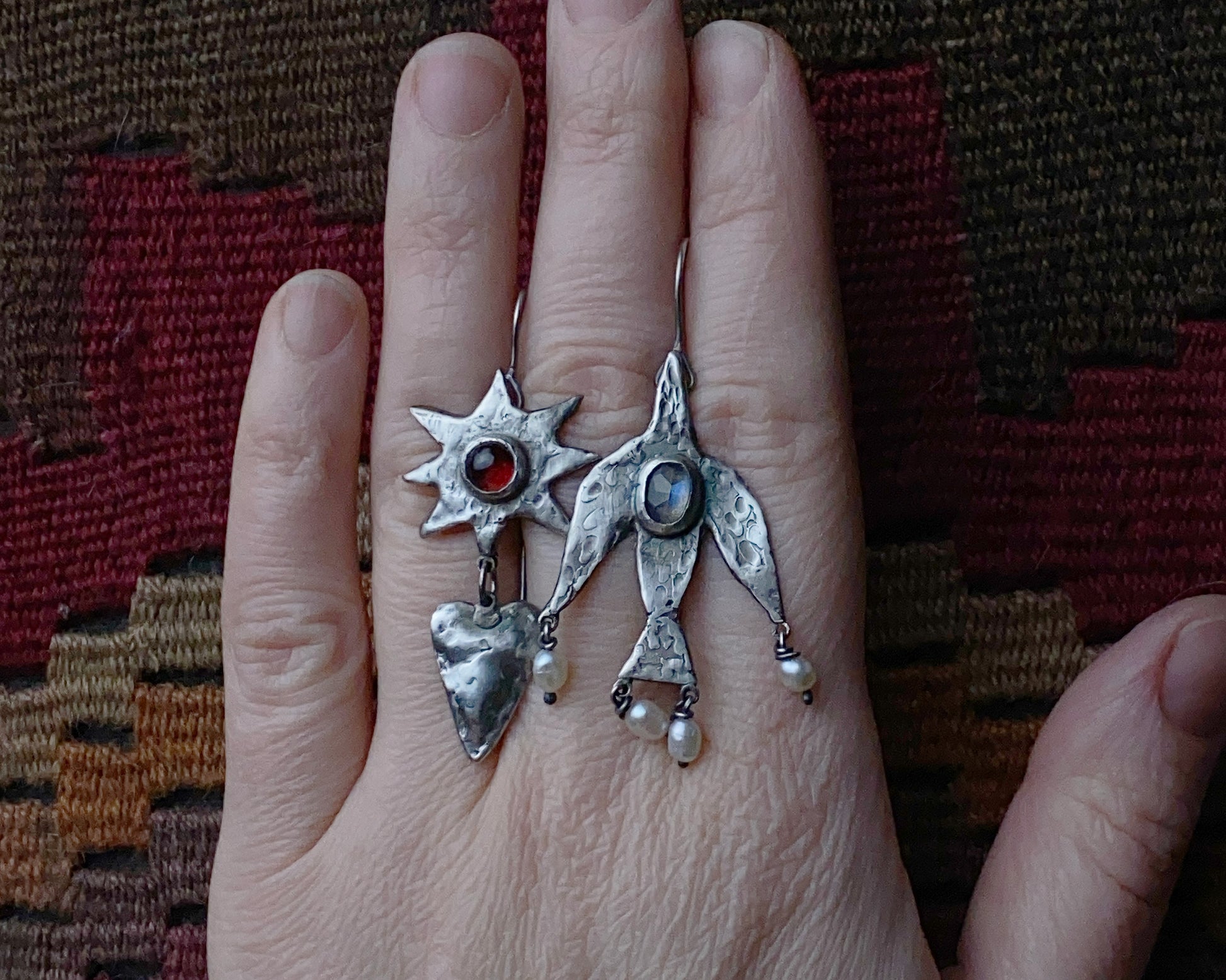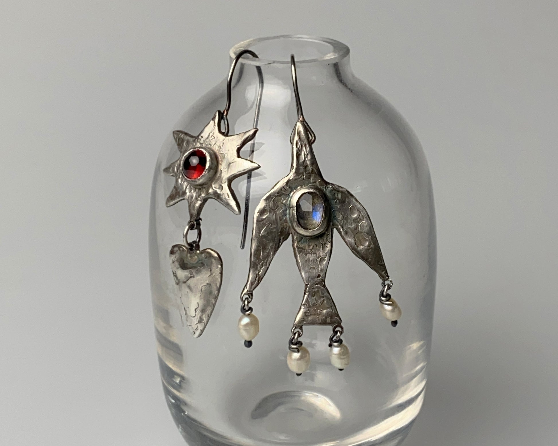 Handcrafted asymmetric silver earrings featuring a mysterious labradorite gemstone in a textured figure pendant and a contrasting sunburst design with a vibrant ruby. The unique composition combines celestial motifs with abstract forms, creating a balanced interplay between light and dark stones.