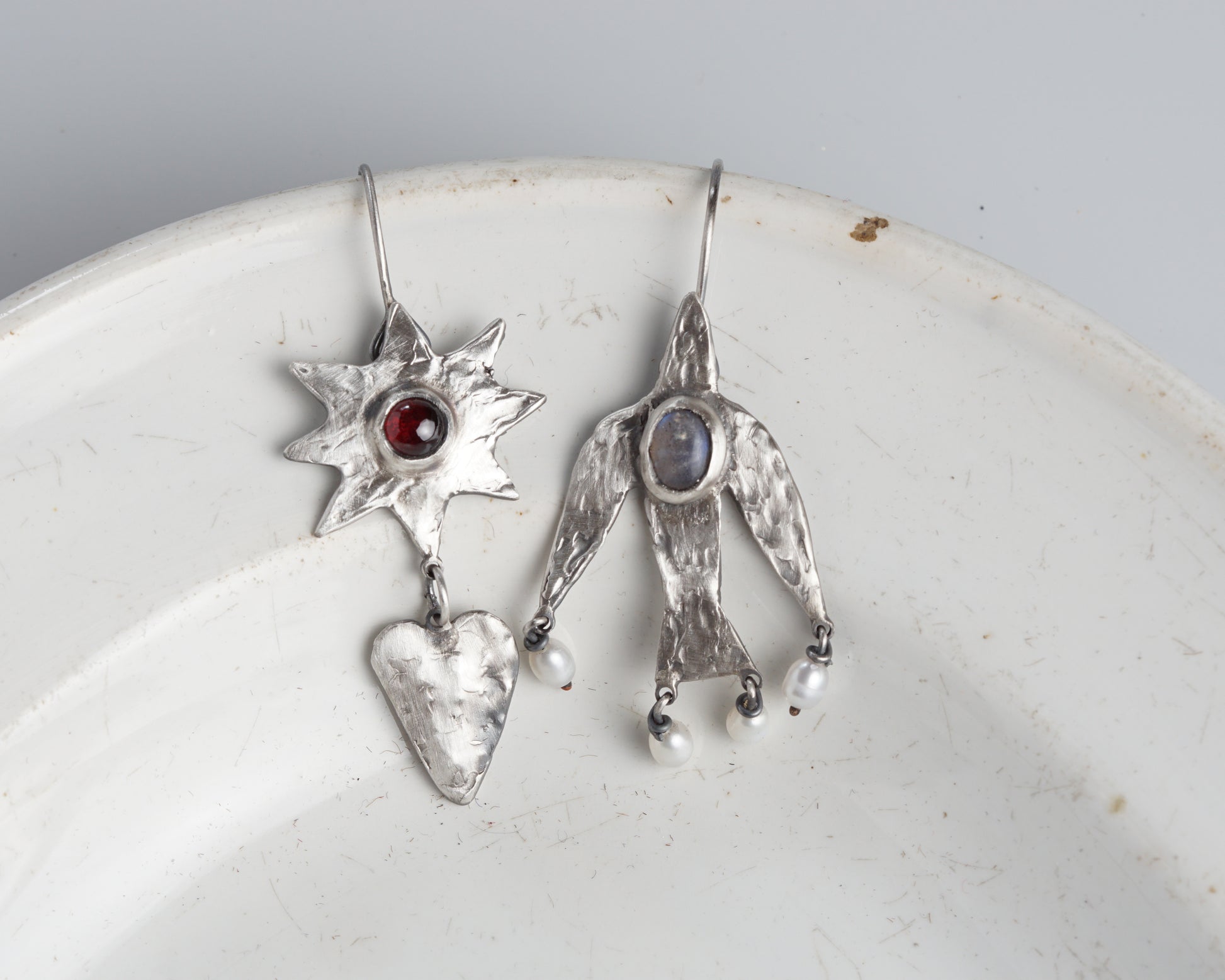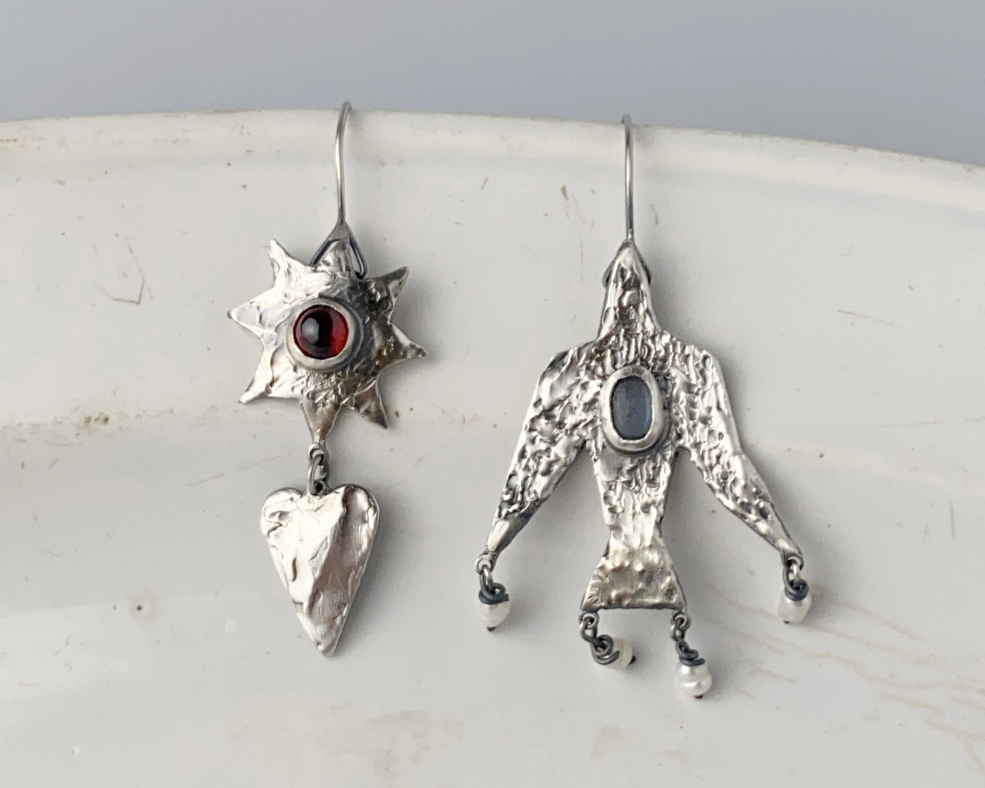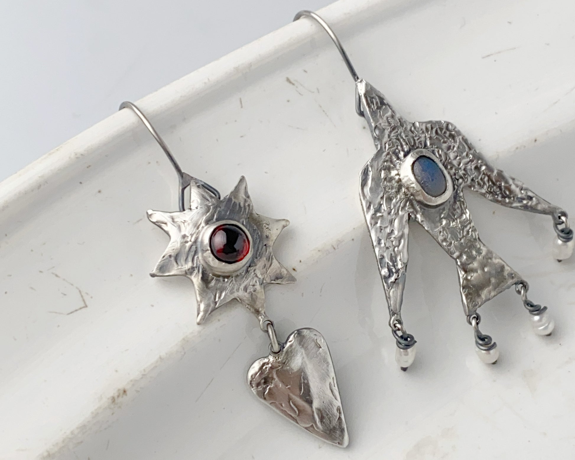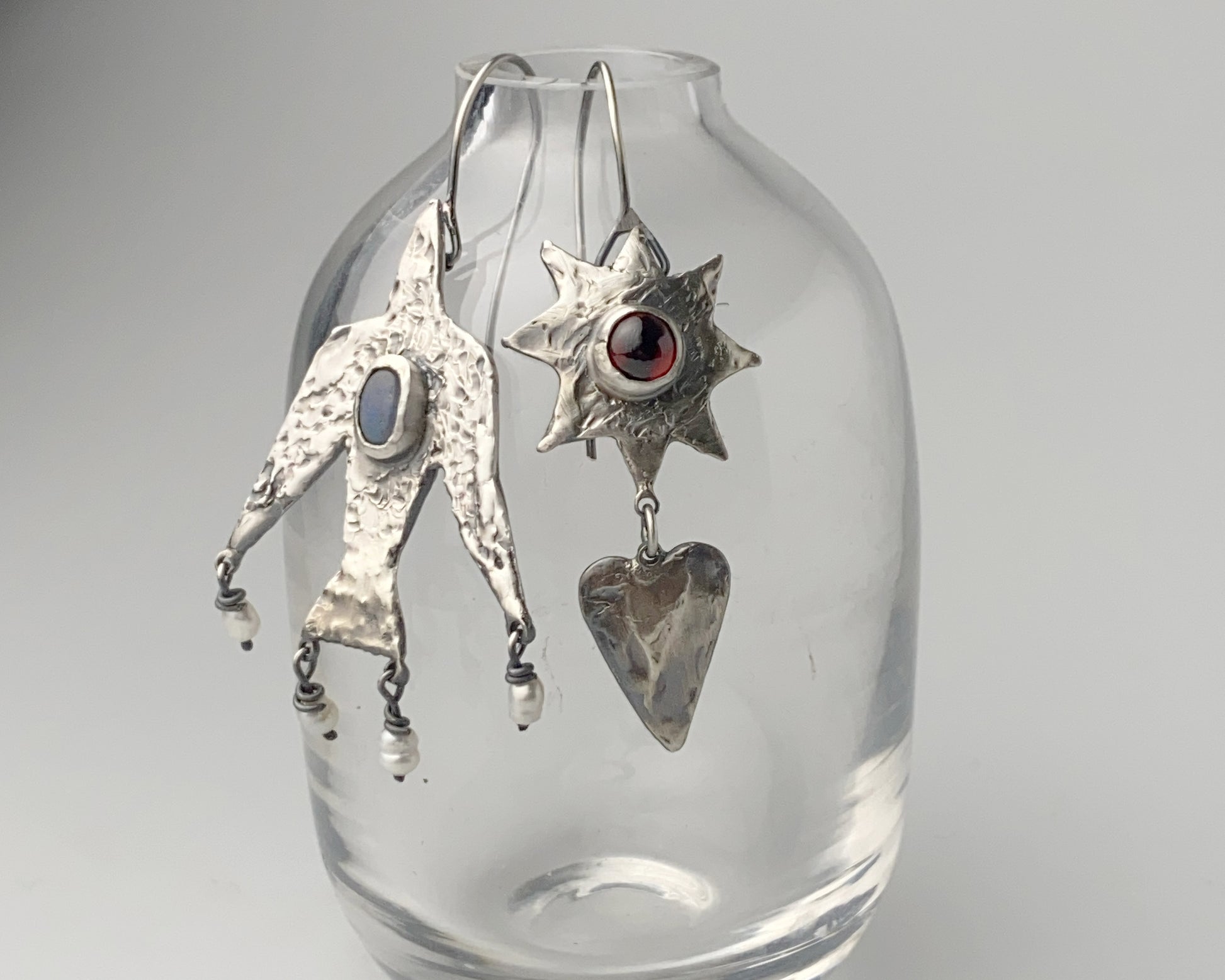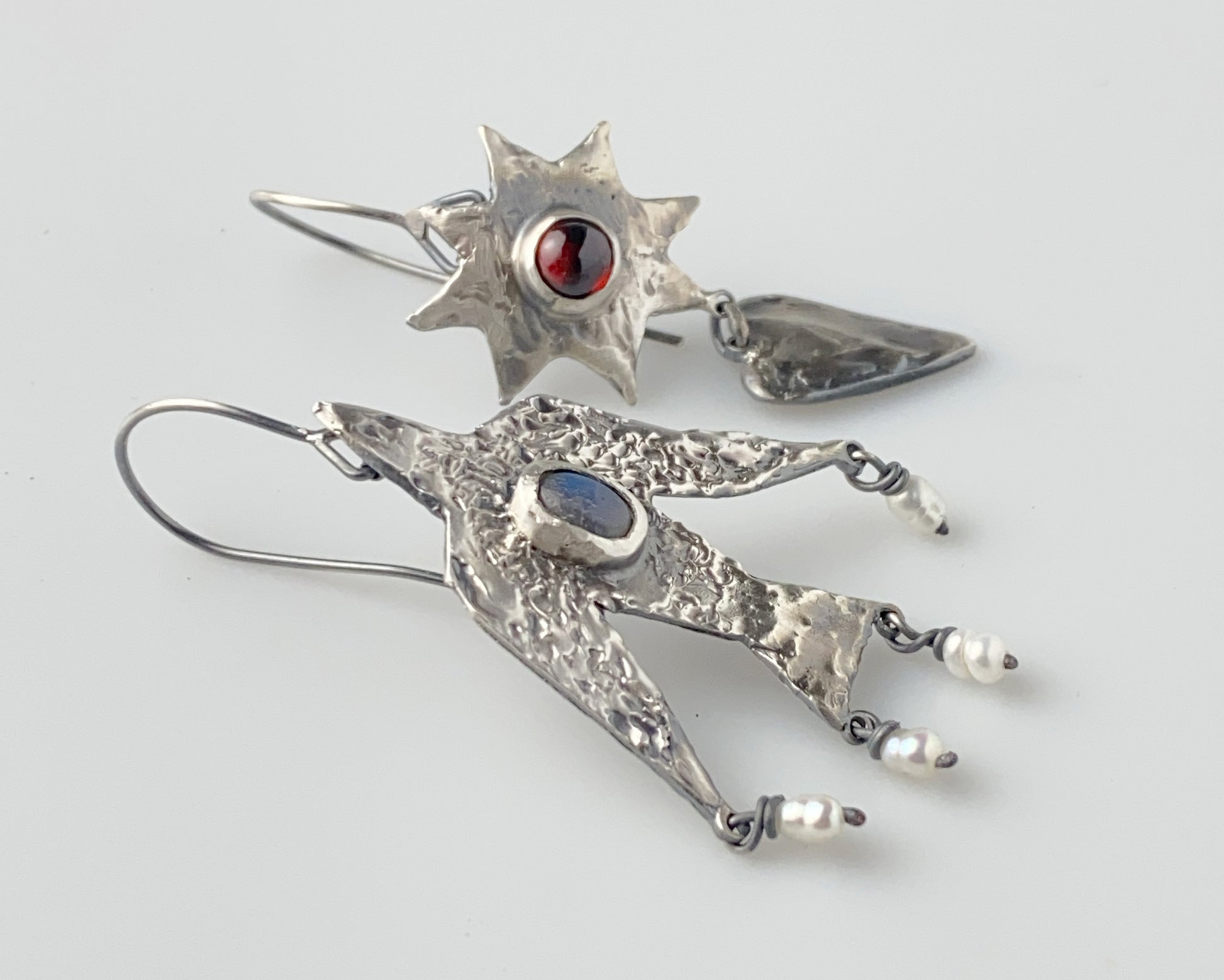 Handcrafted asymmetric silver earrings featuring a mysterious labradorite gemstone in a textured figure pendant and a contrasting sunburst design with a vibrant ruby. The unique composition combines celestial motifs with abstract forms, creating a balanced interplay between light and dark stones.