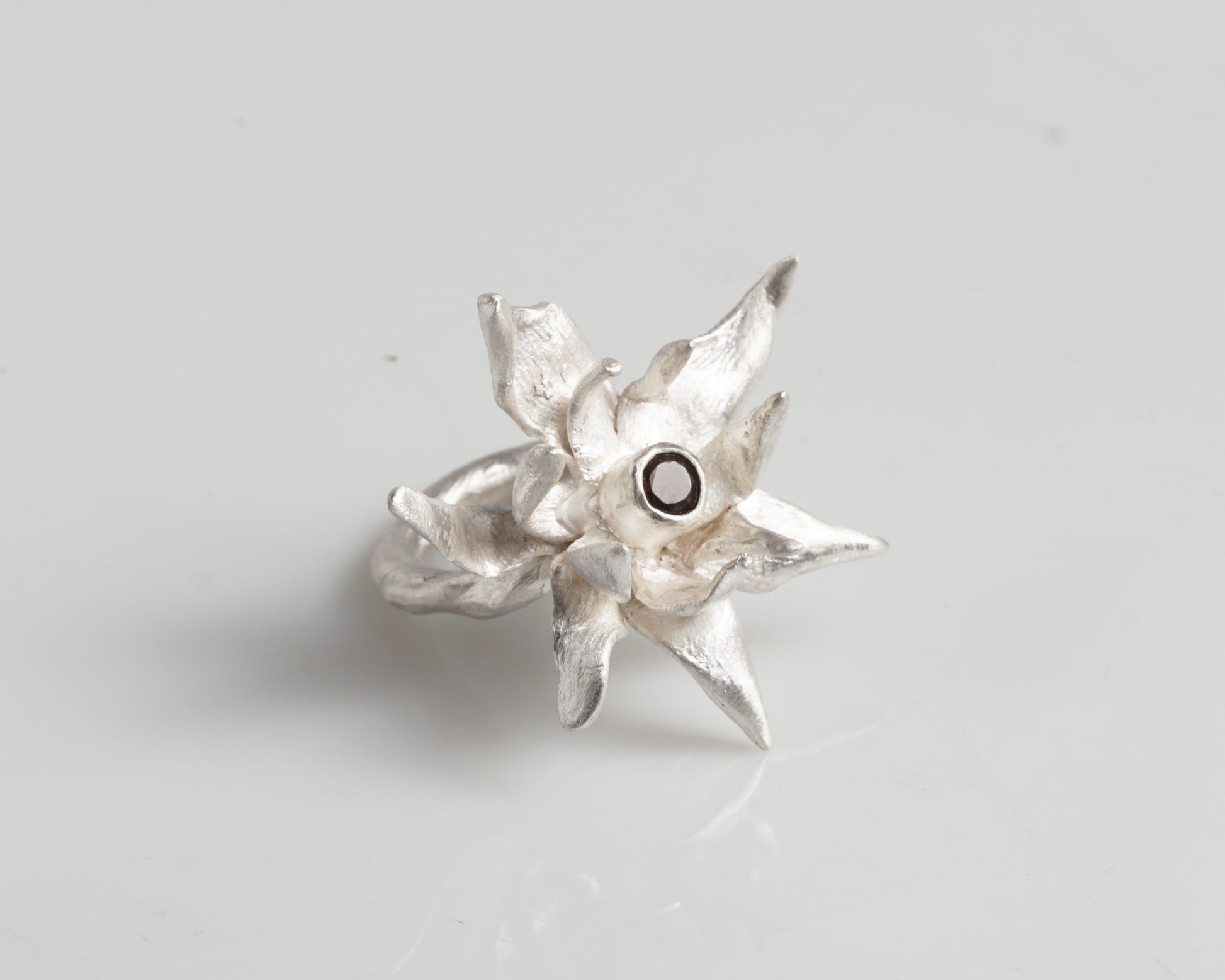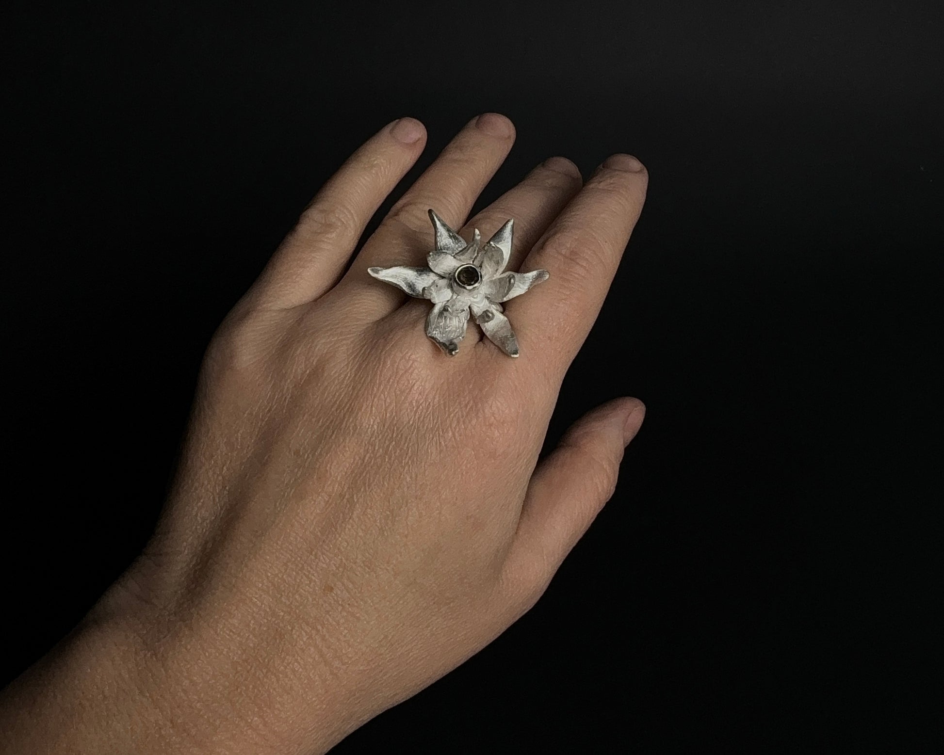A silver ring hand-sculpted as an edelweiss flower with a smoky quartz center stone.