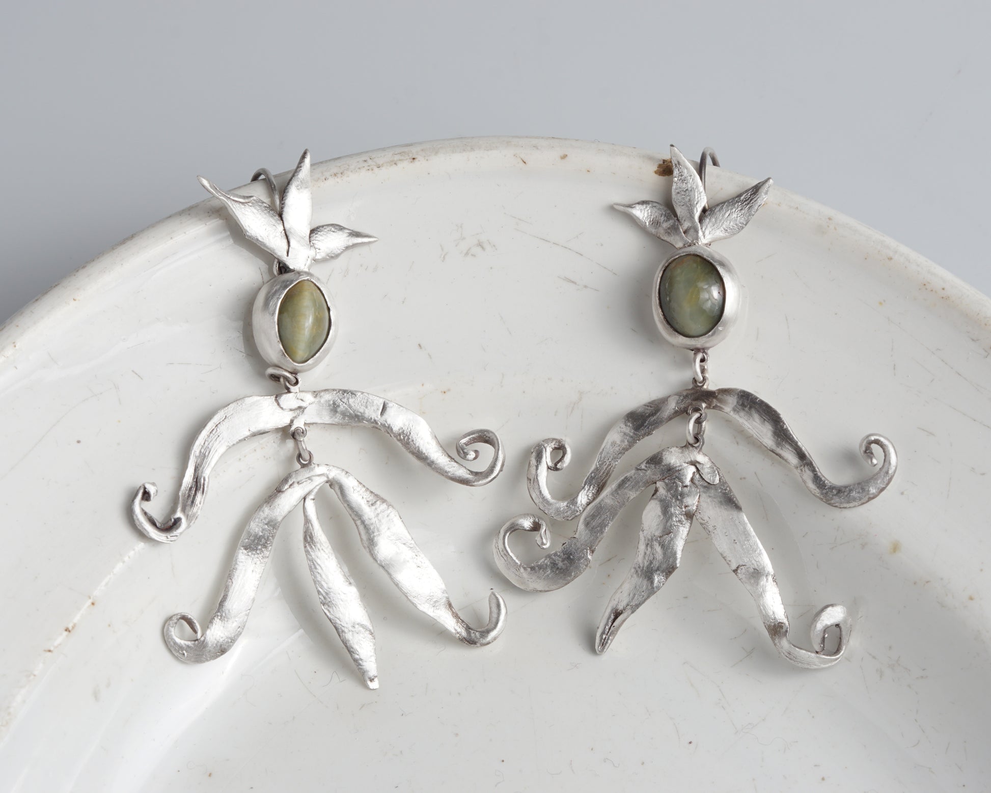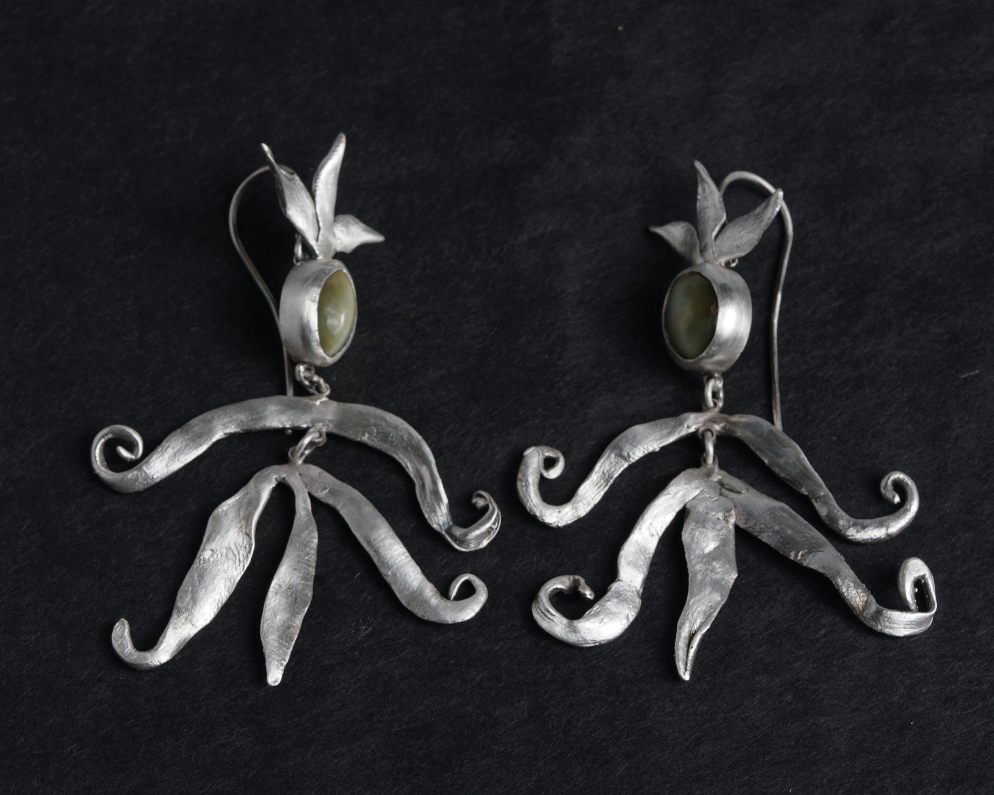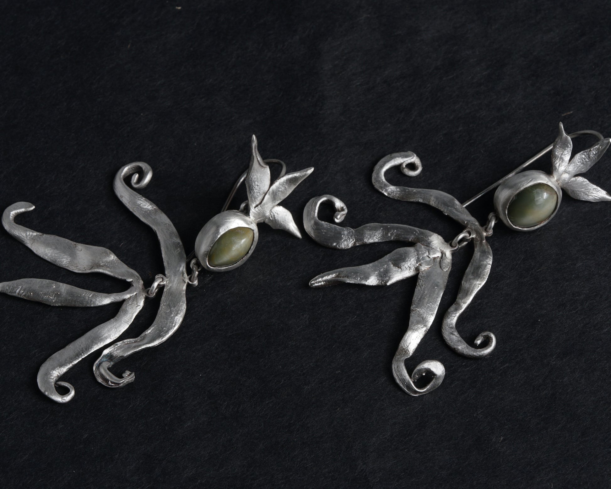 Handcrafted silver earrings with chrysoberyl cat's eye stones. The flowing forms resemble small magical figures. Cat's eye chrysoberyl is said to stimulate creative abilities, inspiration, and innovative ideas, particularly beneficial for artists, writers, and creative individuals.