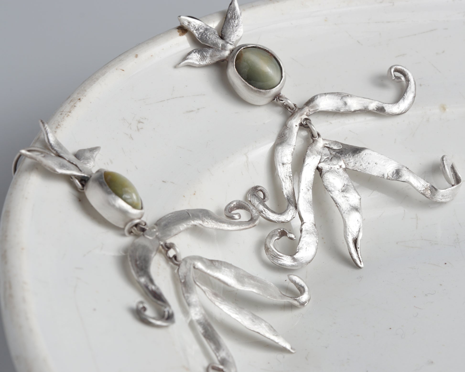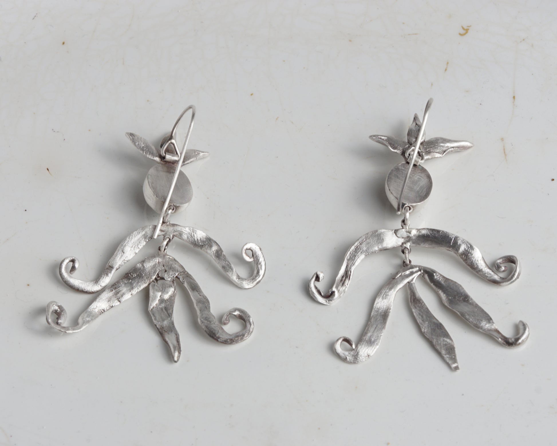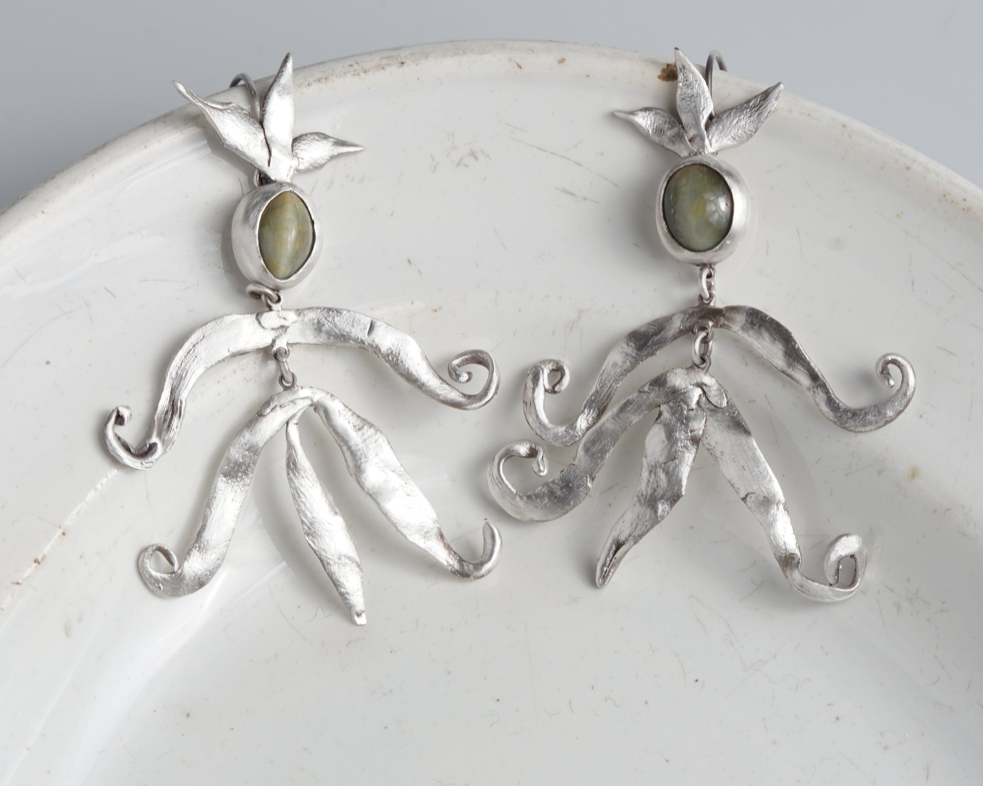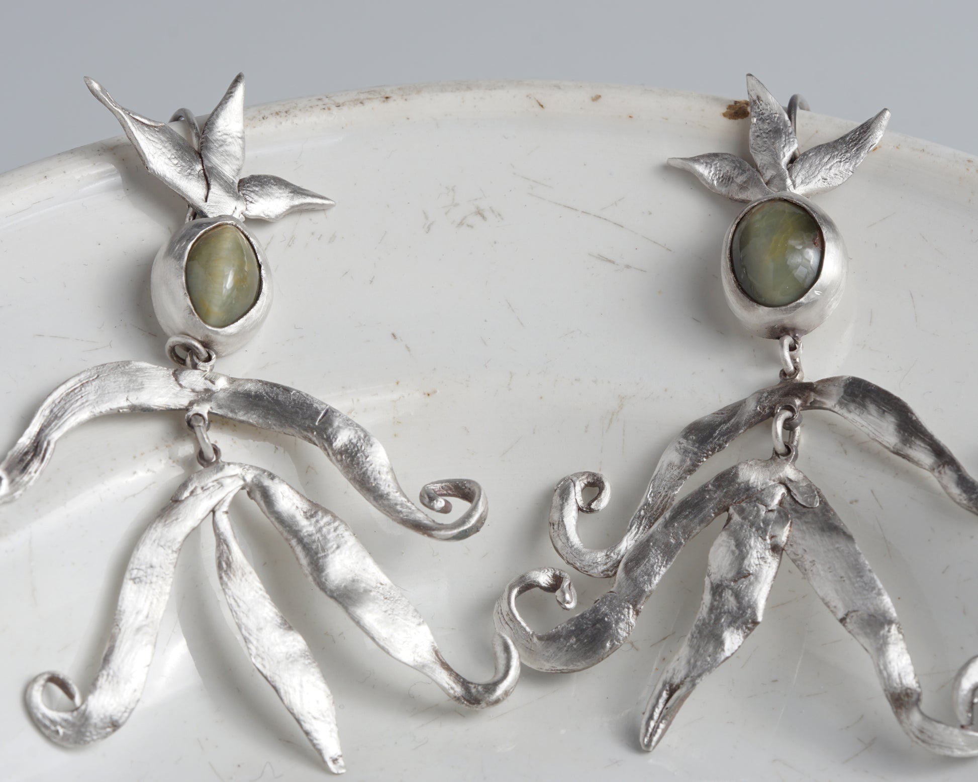 Handcrafted silver earrings with chrysoberyl cat's eye stones. The flowing forms resemble small magical figures. Cat's eye chrysoberyl is said to stimulate creative abilities, inspiration, and innovative ideas, particularly beneficial for artists, writers, and creative individuals.