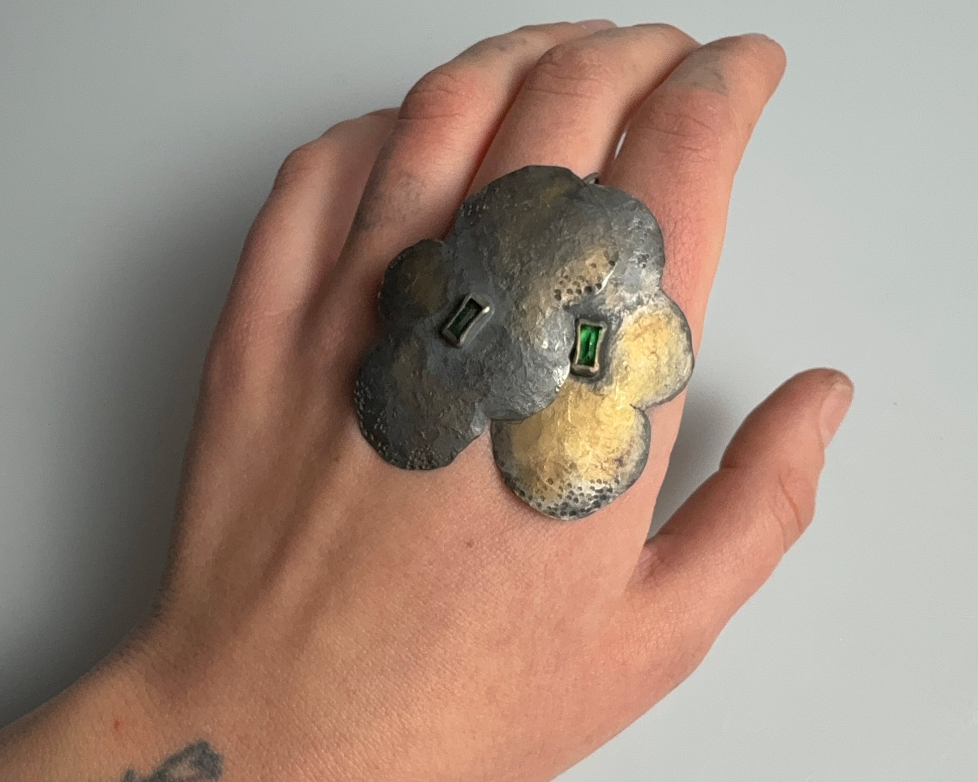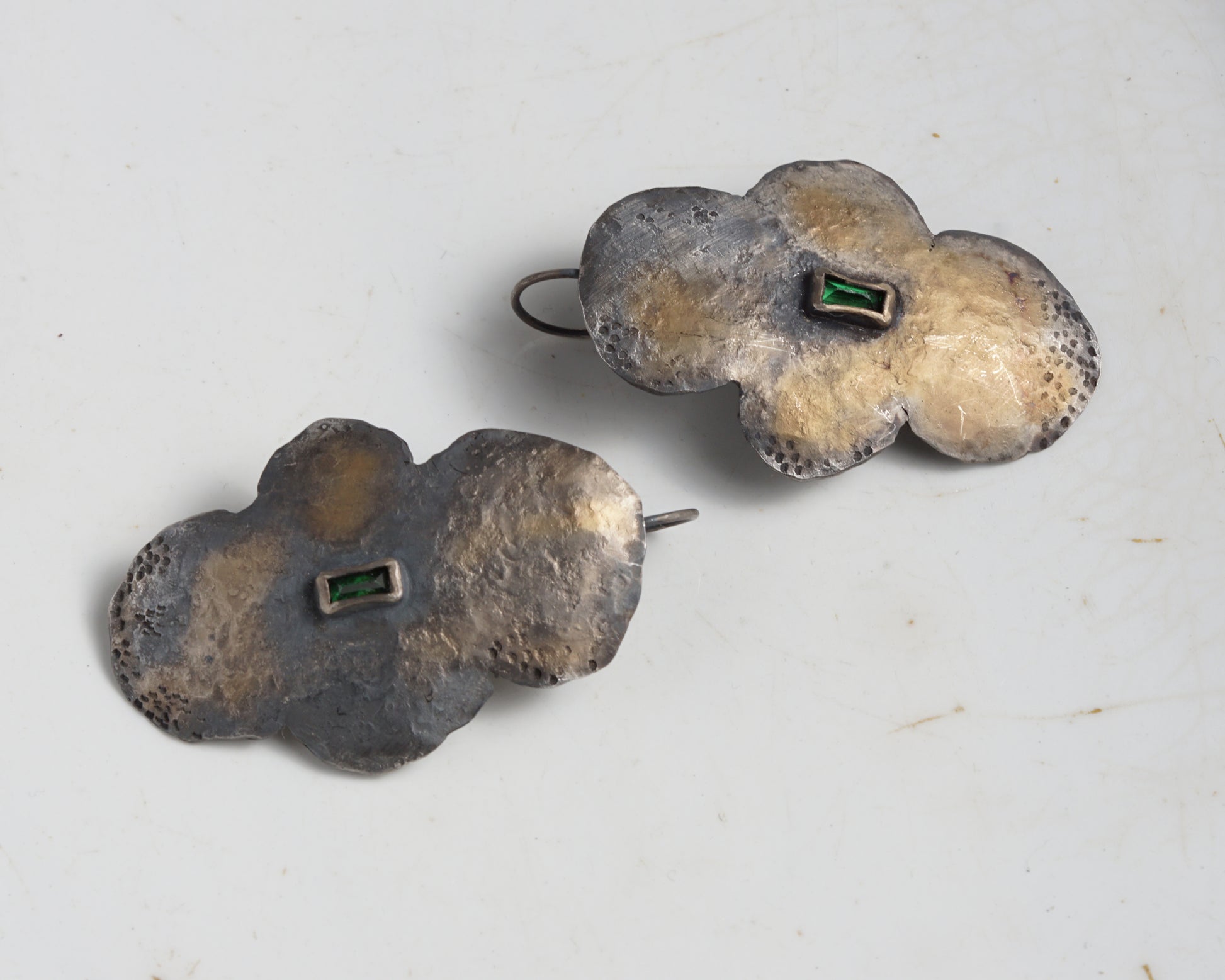 Hand-forged earrings made of sterling silver. The surface is oxidized and finished with a 14k gold patina. Each earring is set with a rectangular green alpinite stone, secured as a central accent.