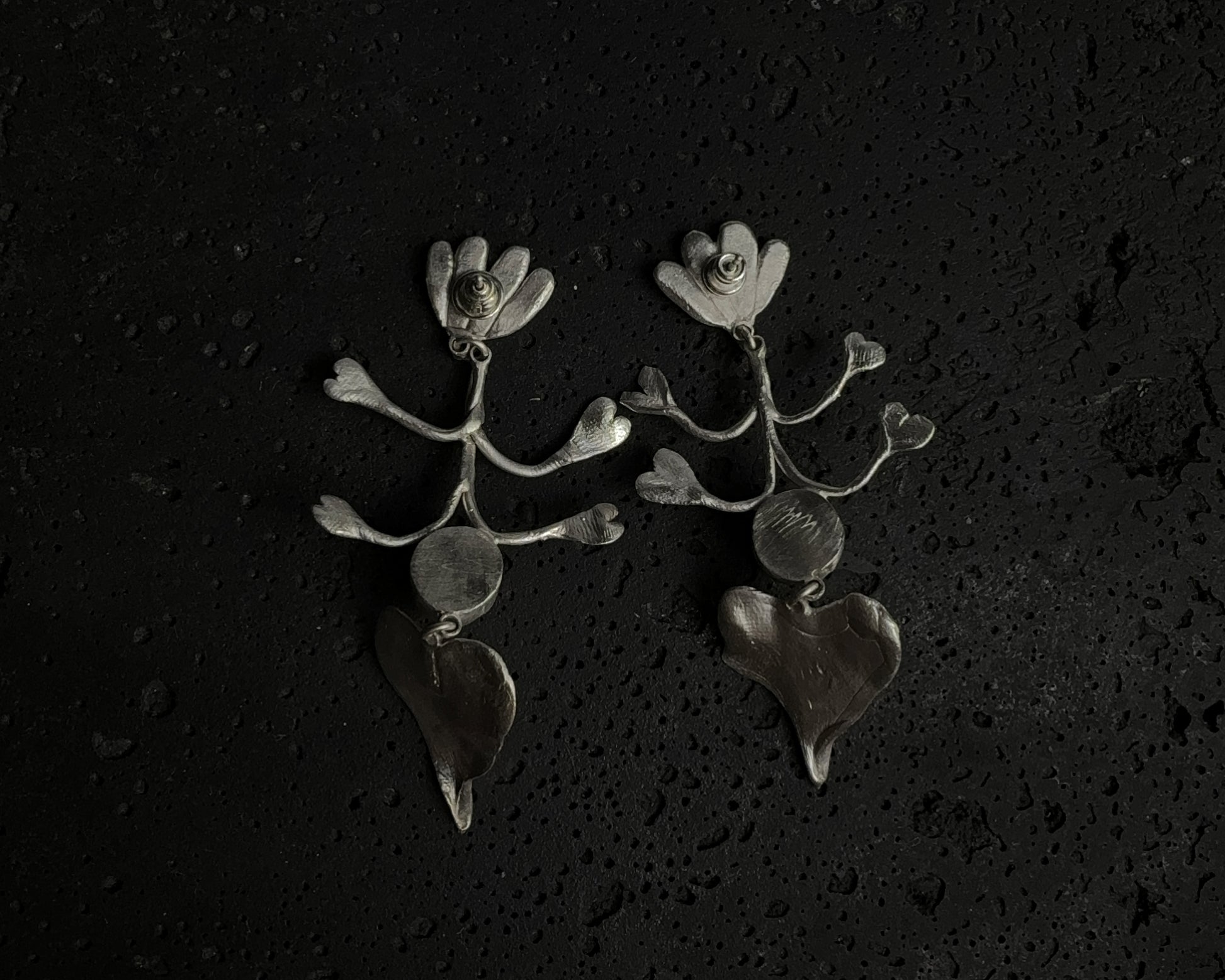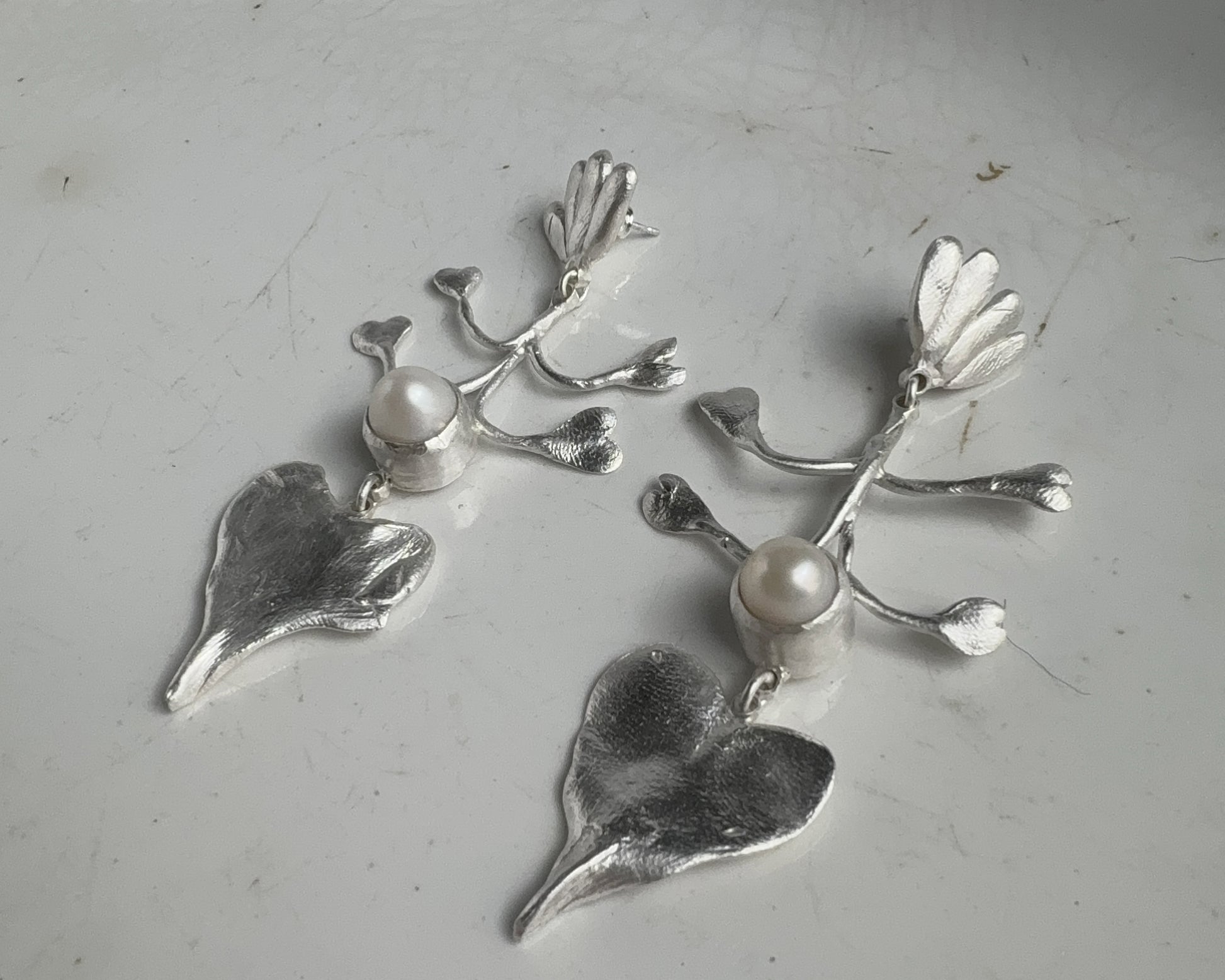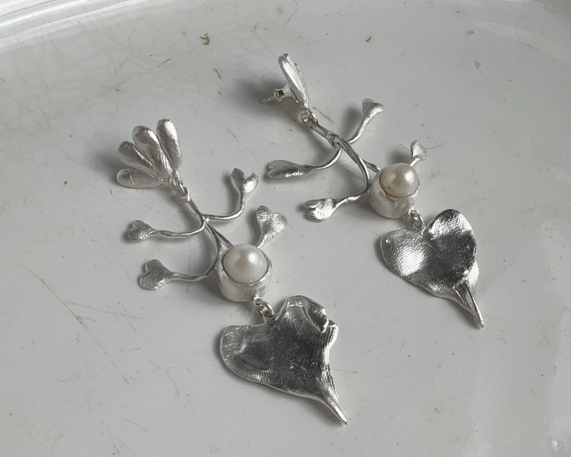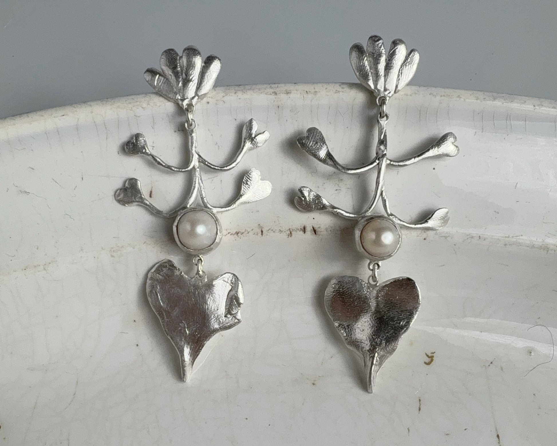Handcrafted silver earrings decorated with pearls and hanging heart charms. The silver surface has a rich textured finish. Secured with stud backs.