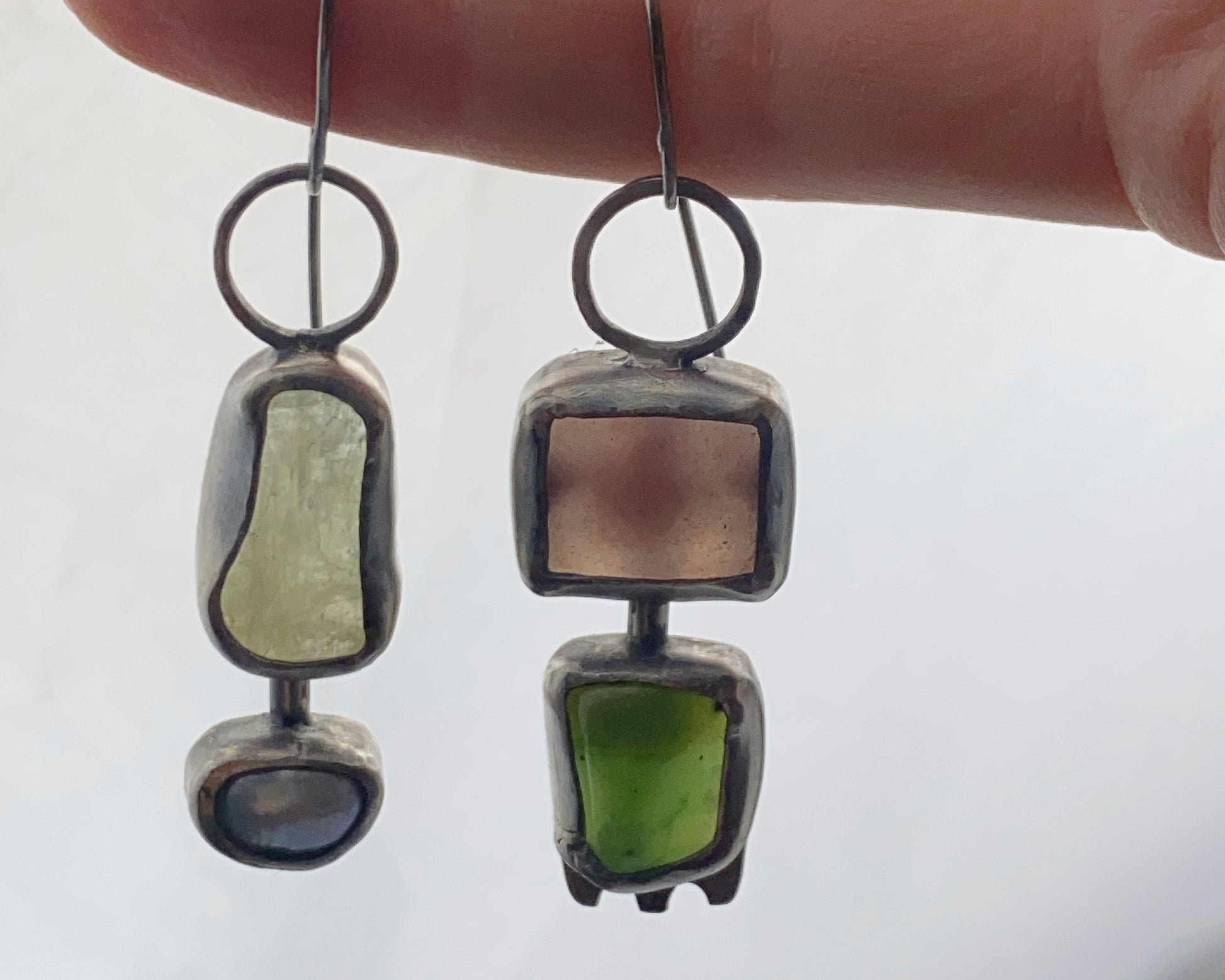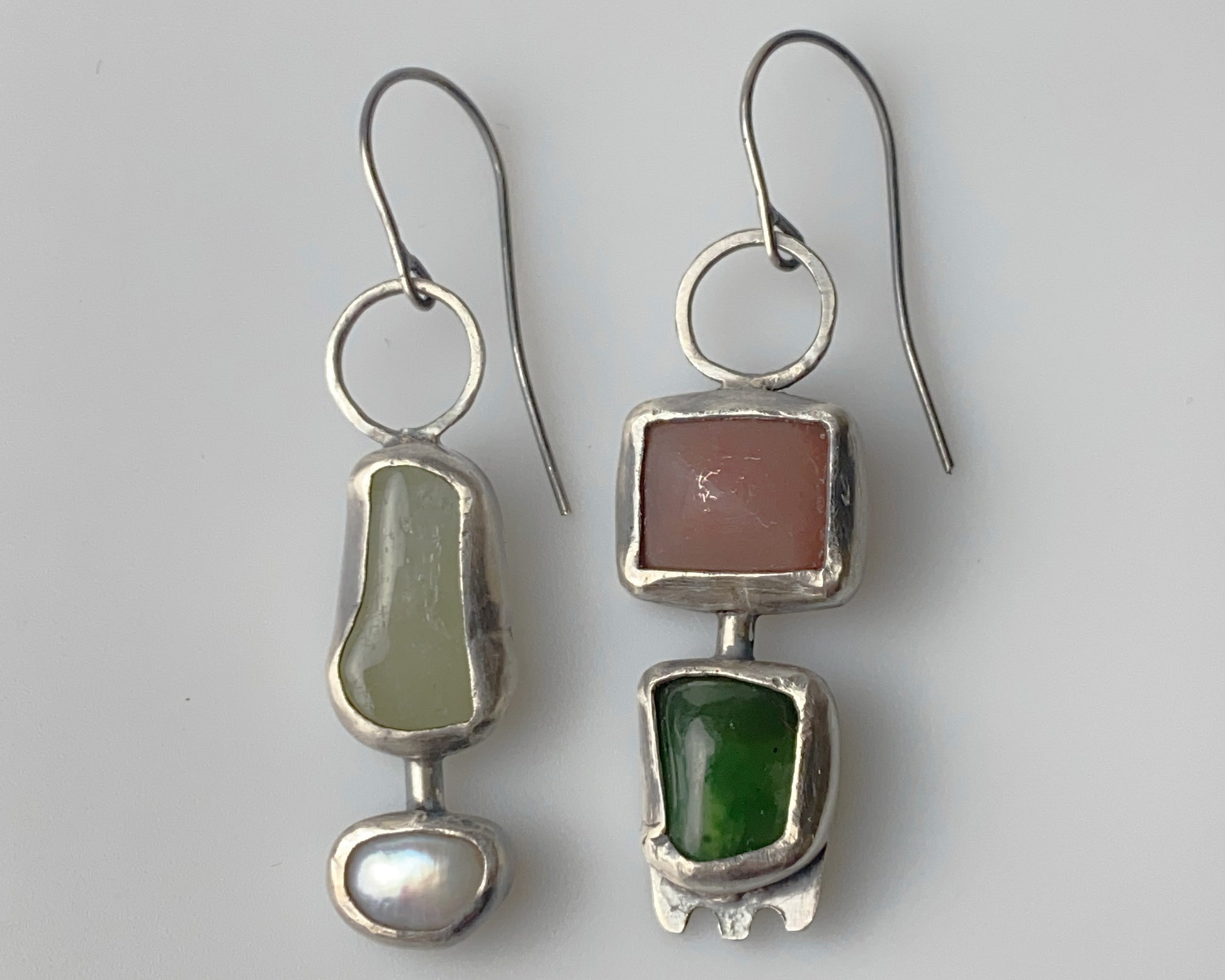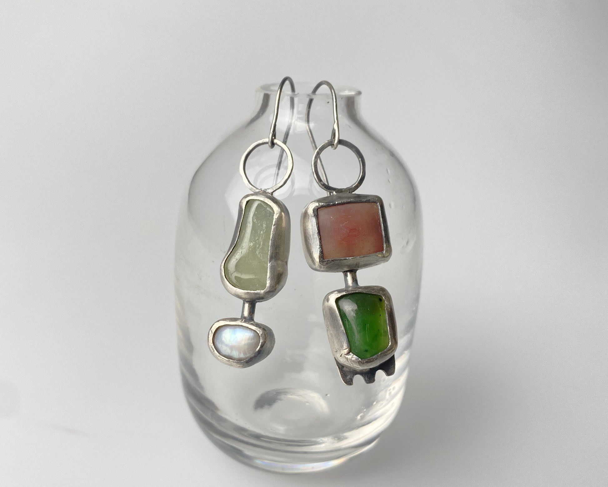 Handcrafted Silver Earrings with Chalcedony, Jade, Aquamarine, and Pearl