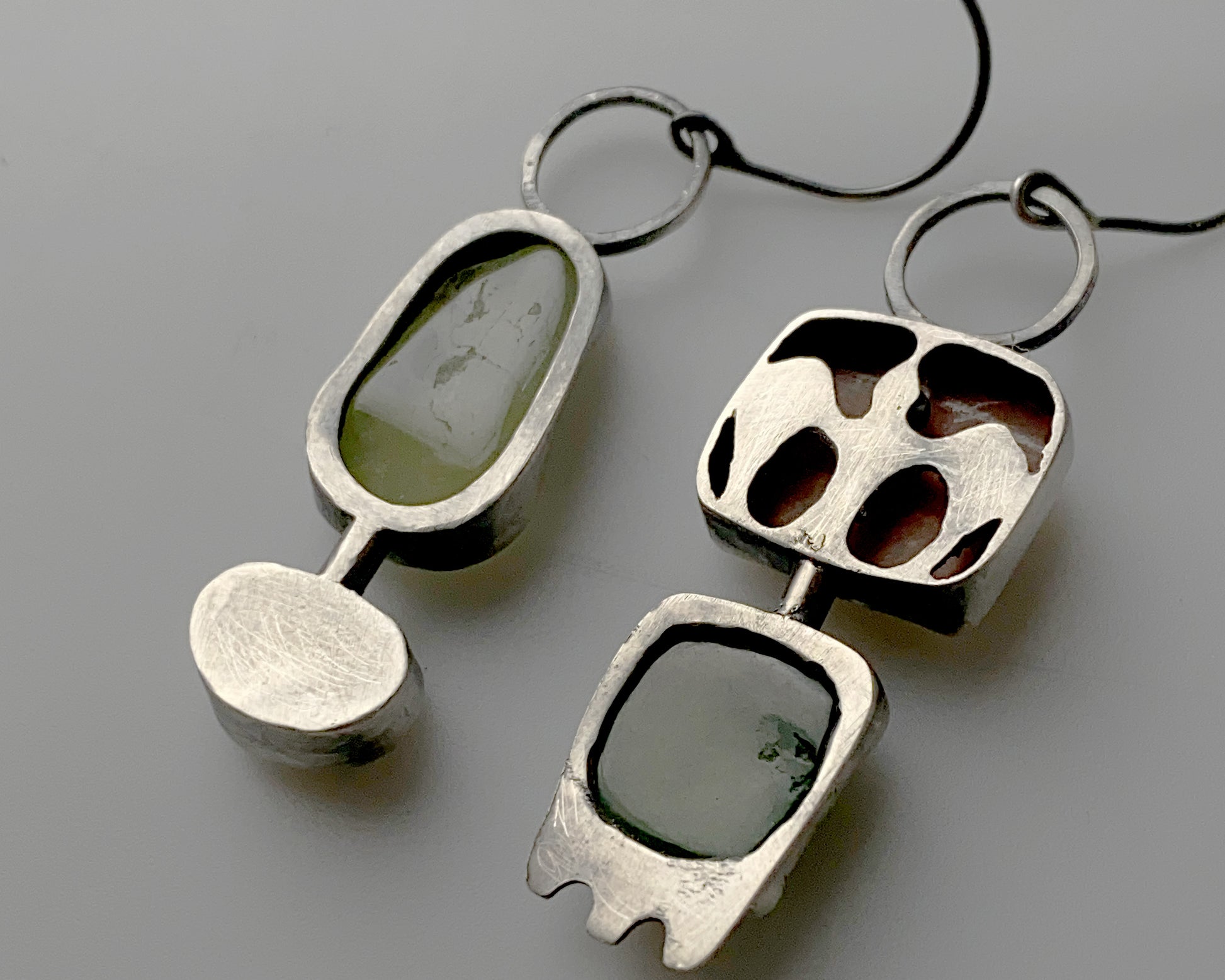 Handcrafted silver earrings featuring a boldly asymmetric design. One earring showcases a square chalcedony with jade accent, complemented by artistic cutout details visible on the reverse side. The other displays an aquamarine with a vibrant pearl. Organic silver settings enhance the raw beauty of the stones, creating a bold and artistic aesthetic.