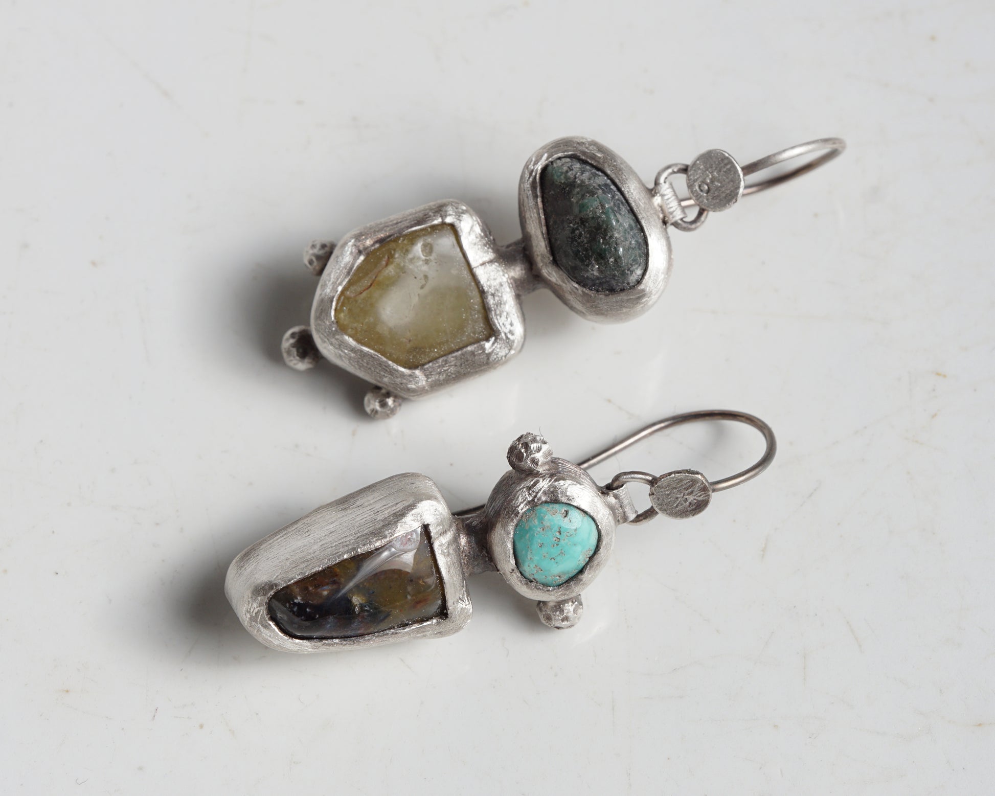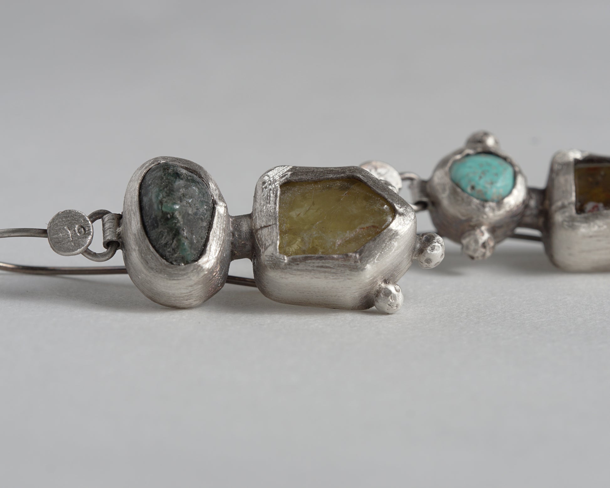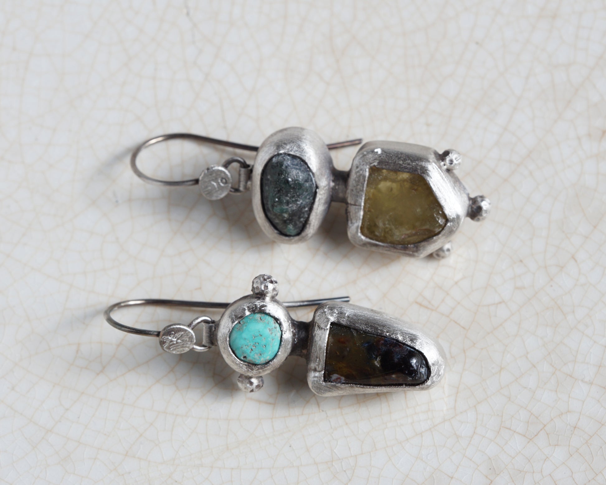 Handcrafted Silver Earrings with Turquoise, Pietersite, Emerald & Green Garnet