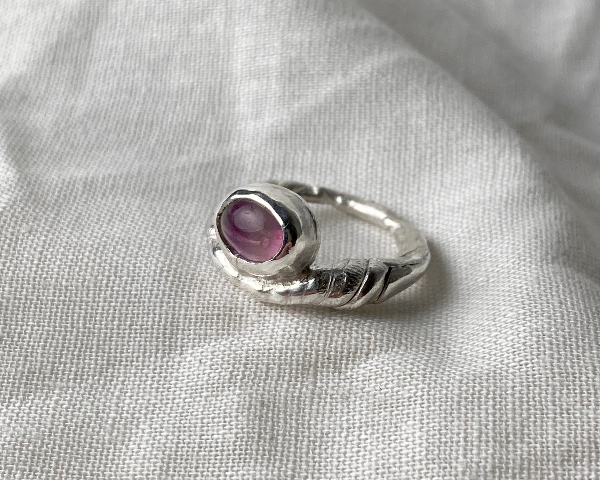 A contemporary sterling silver ring featuring an oval-cut natural amethyst in a bezel setting, complemented by an organic sculptural design along the band.