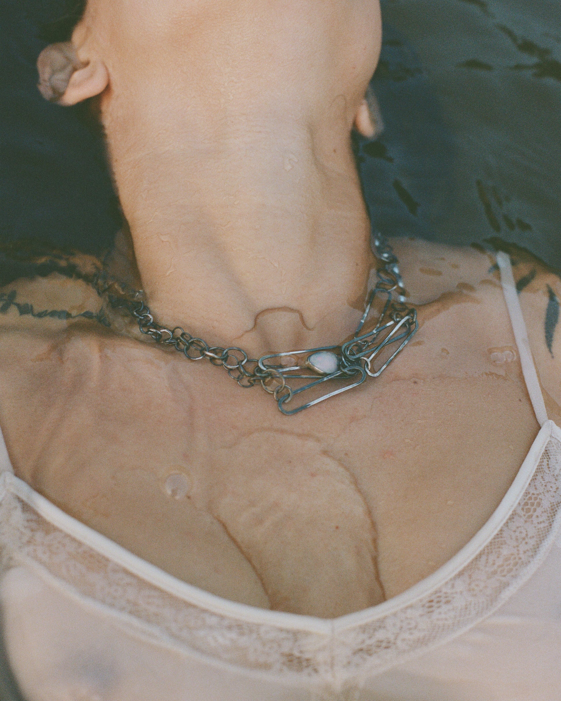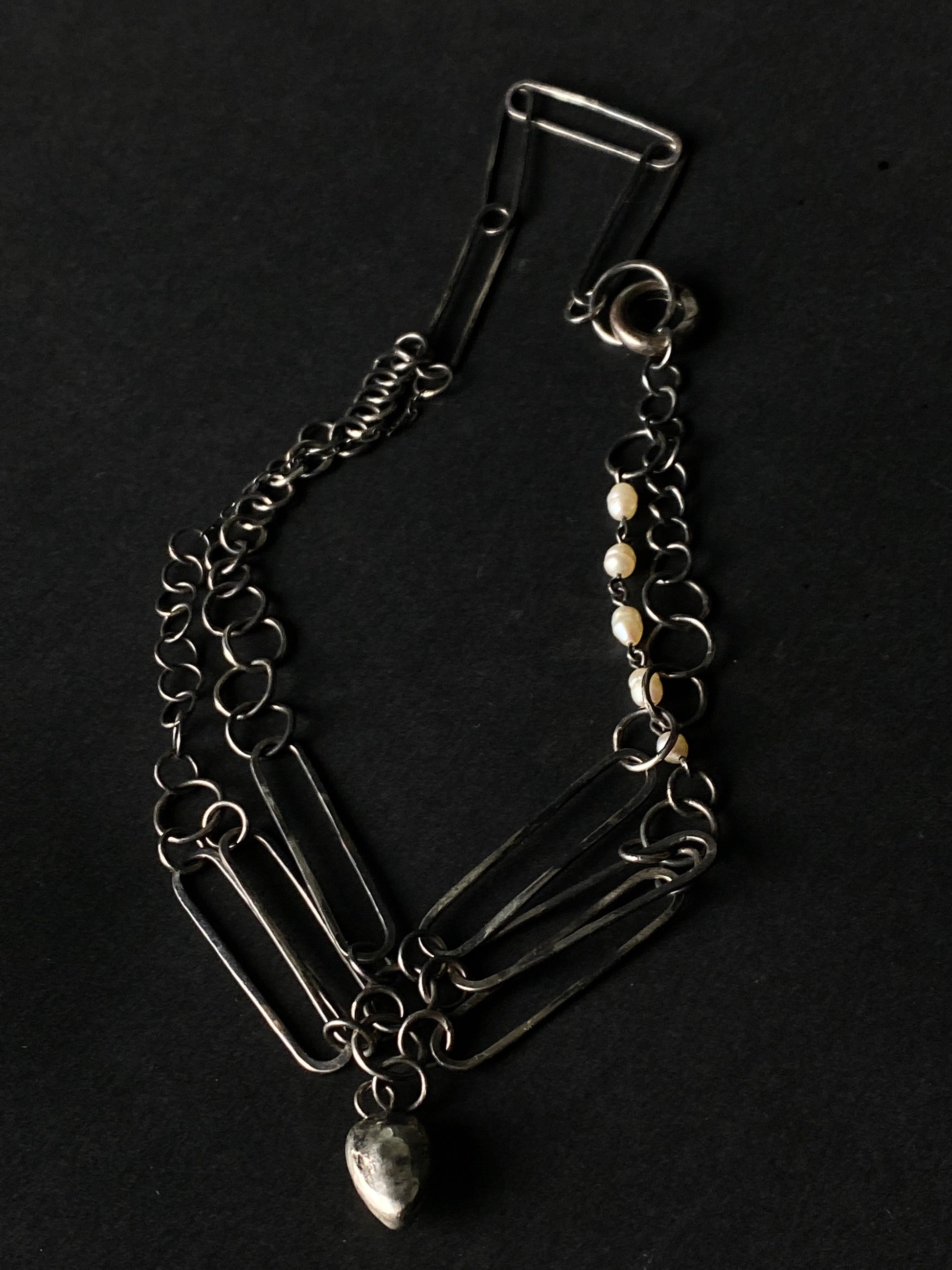 This necklace is a handcrafted piece made from 925 sterling silver. It features a heart-shaped Ethiopian opal in a beautiful warm tone. The unique character of the necklace is further accentuated by a river pearl inset, subtly contrasting the robust chains and rings of this piece. A secure lobster claw clasp completes this intriguing necklace.