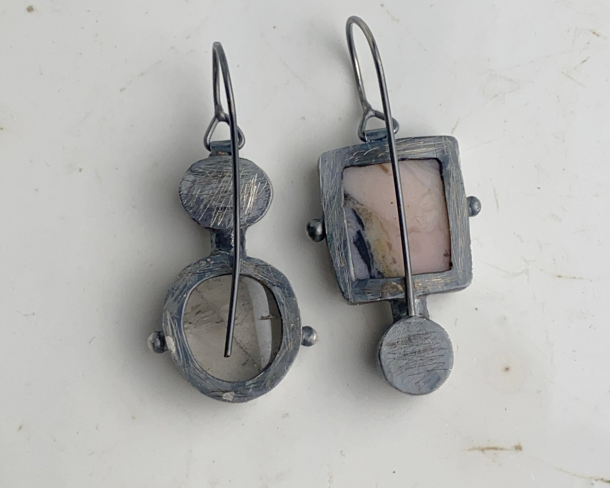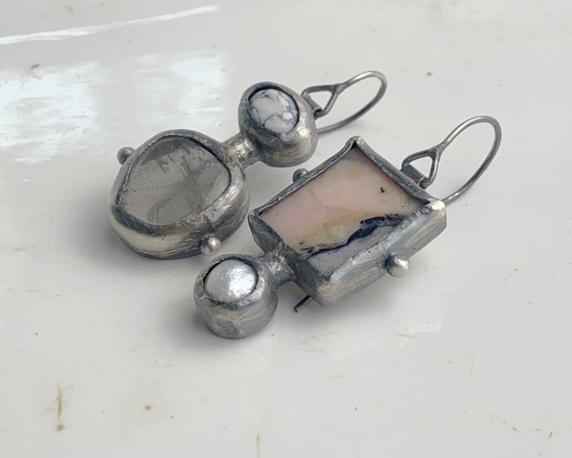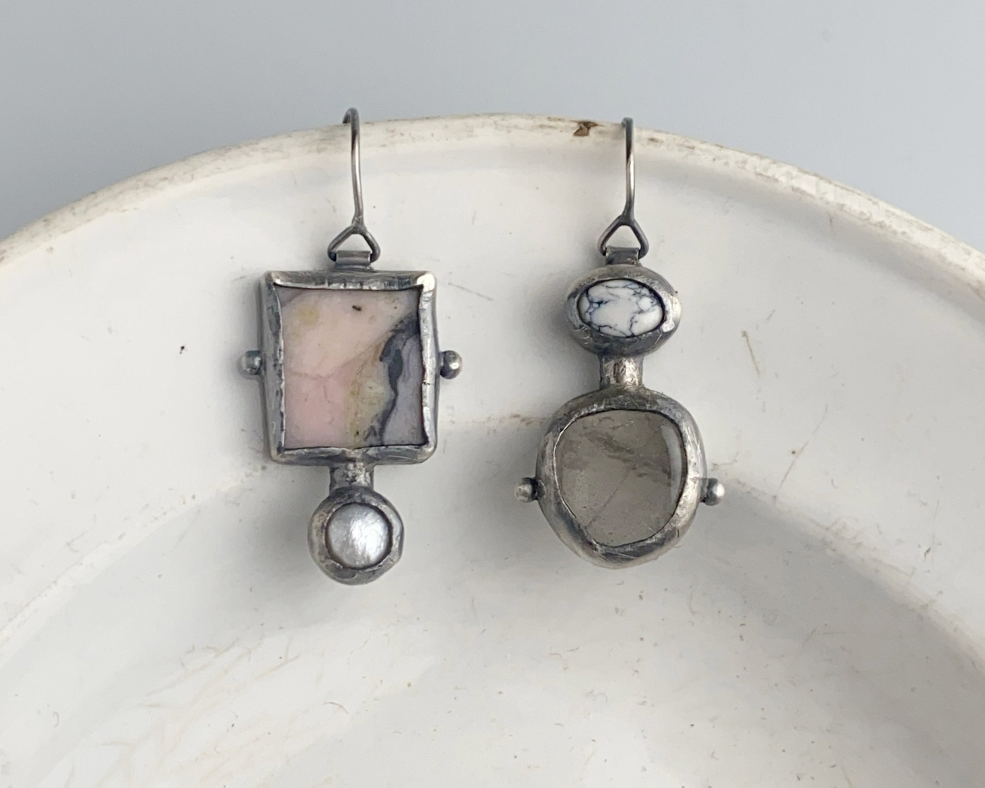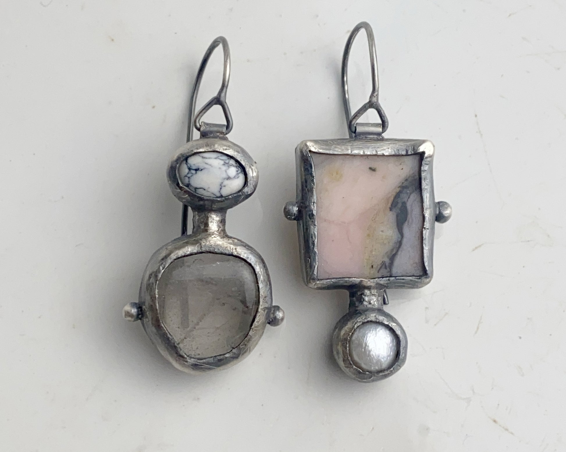Asymmetrical earrings featuring howlite, quartz, pink agate, and pearl in hand-formed silver-tone settings. Each earring showcases a unique combination of stone shapes and bezels. Handcrafted for a truly one-of-a-kind look. All stones are natural.