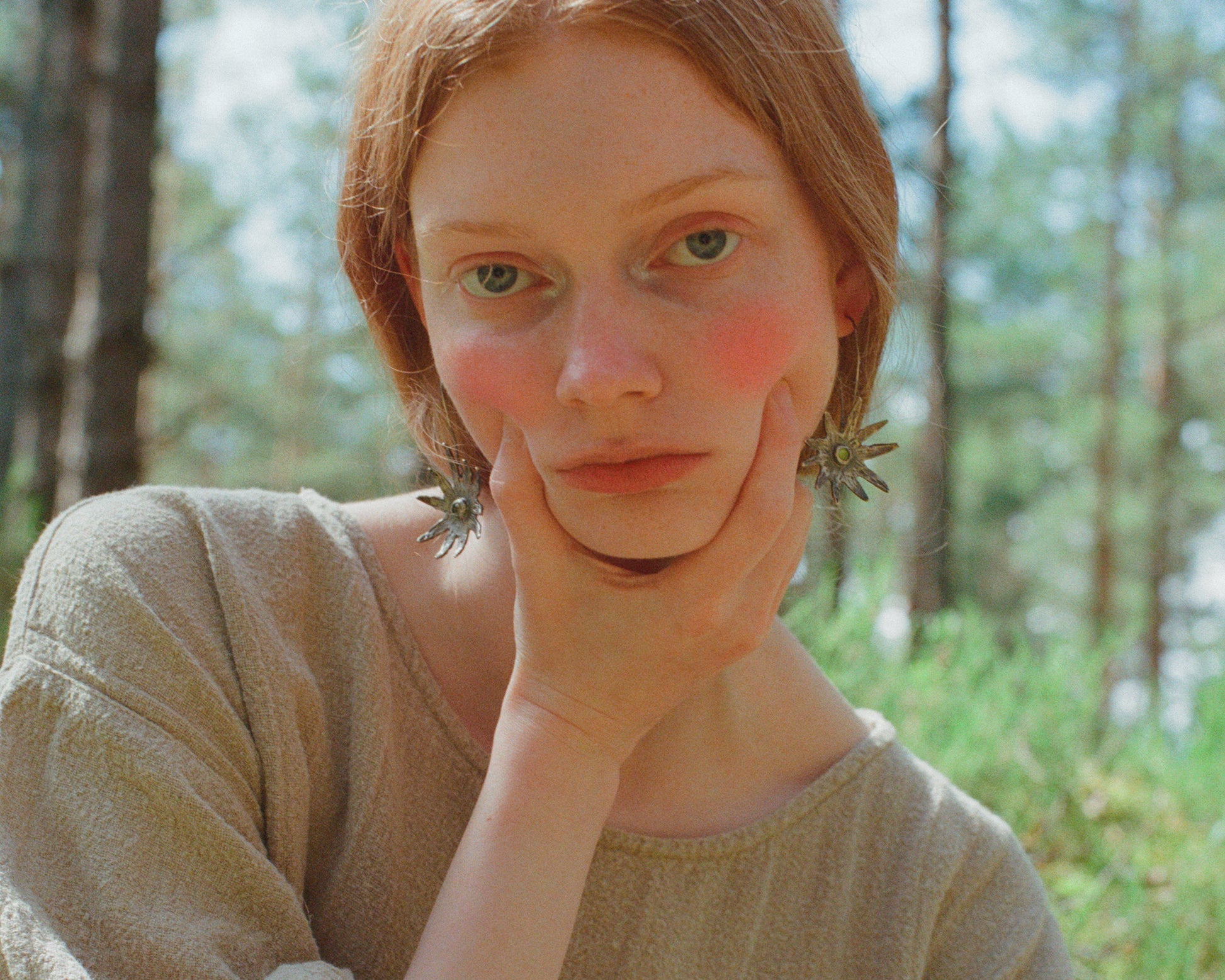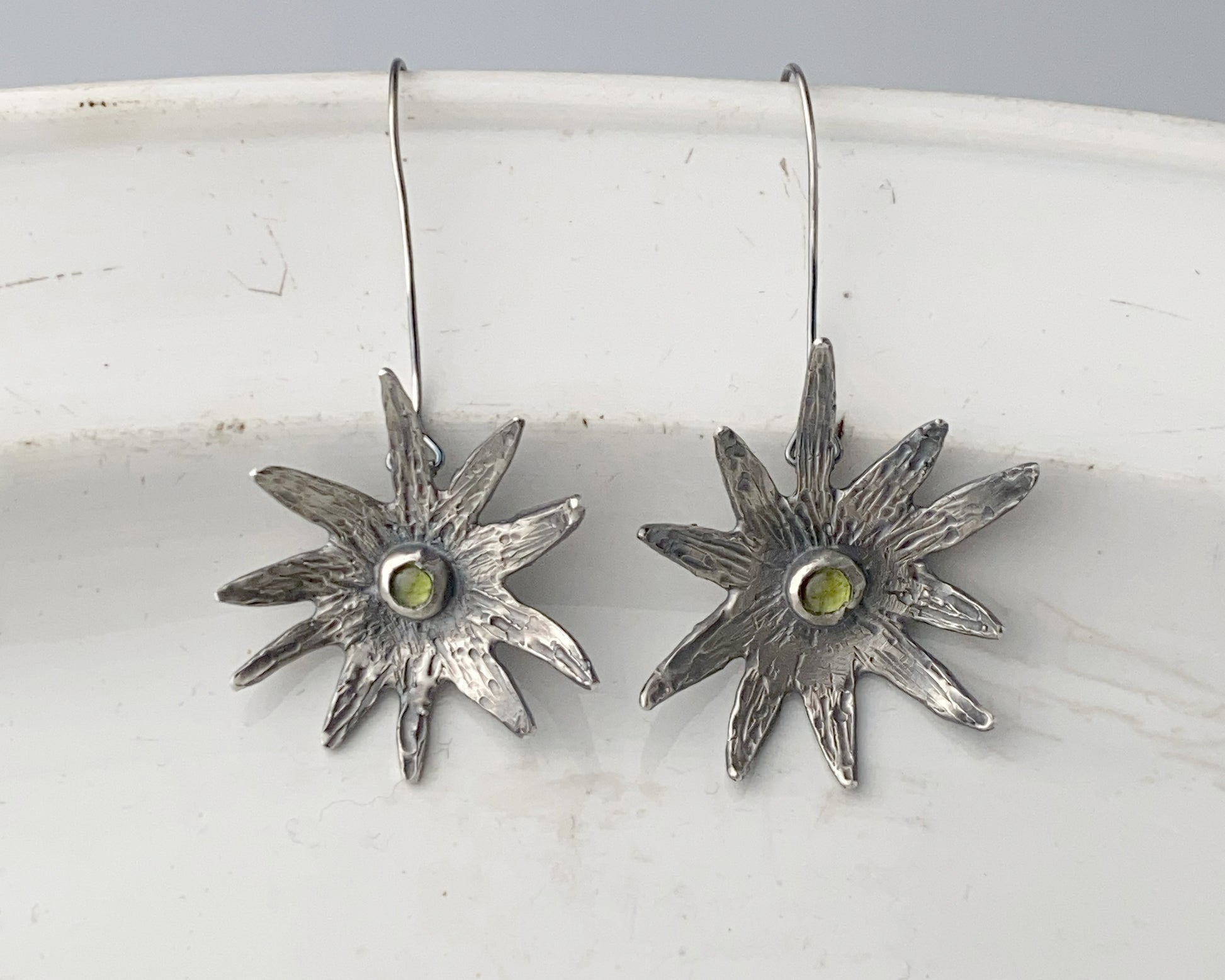 Sterling silver handcrafted earrings in the shape of a star or flower, with a bright green natural peridot stone in the center of each earring.