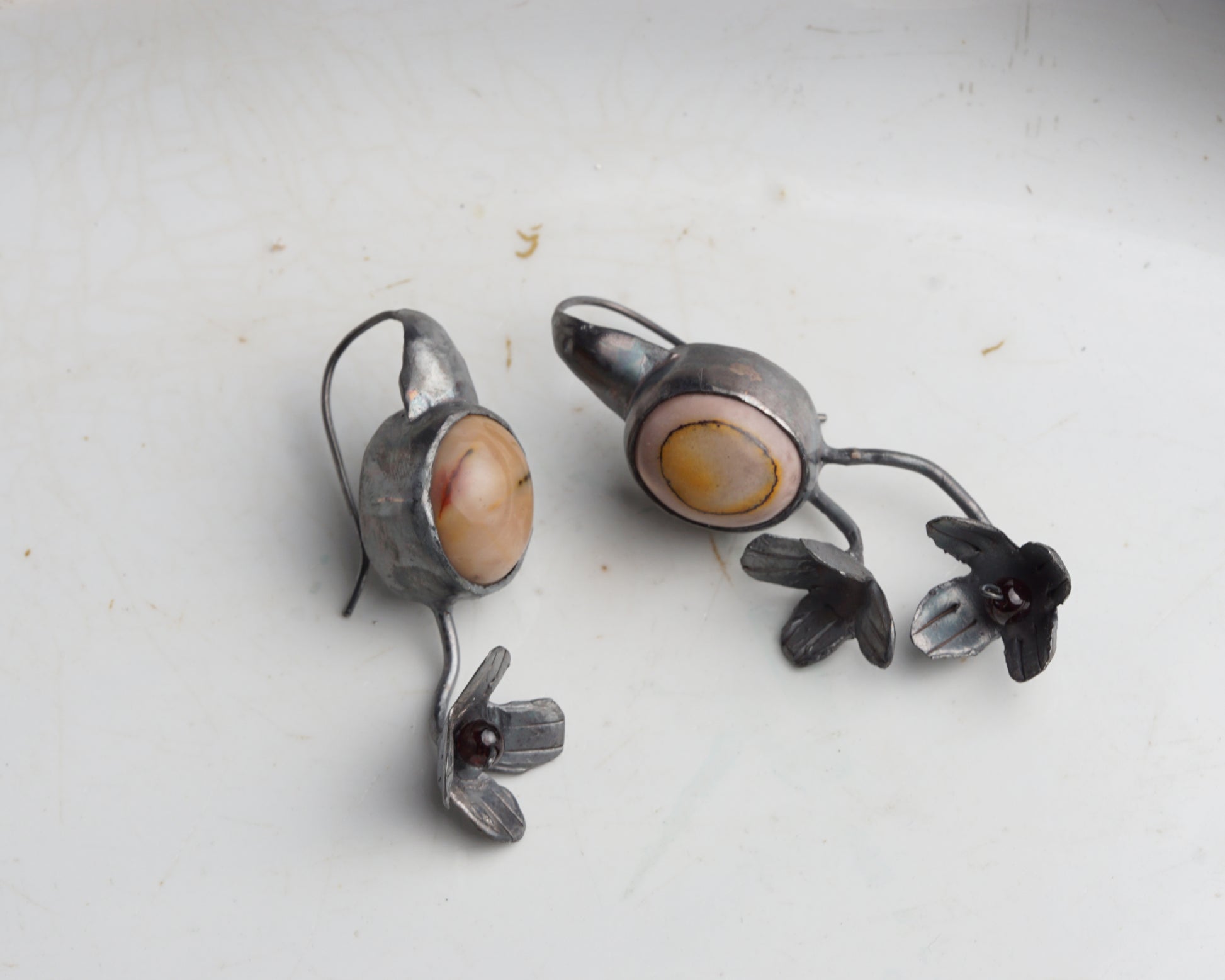 Handcrafted from 925 oxidized sterling silver, these earrings feature natural mookaite jasper stones accented with garnet beads.