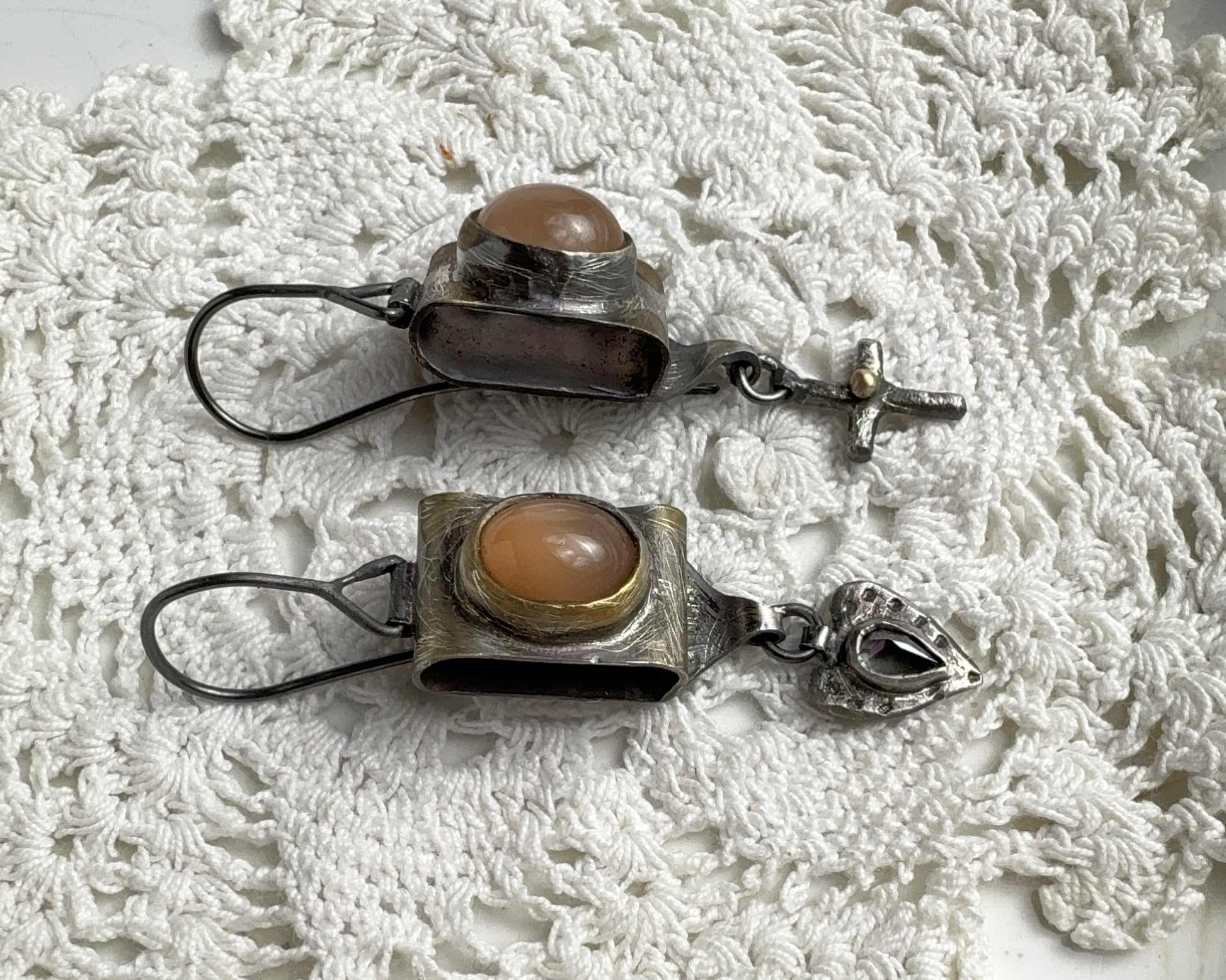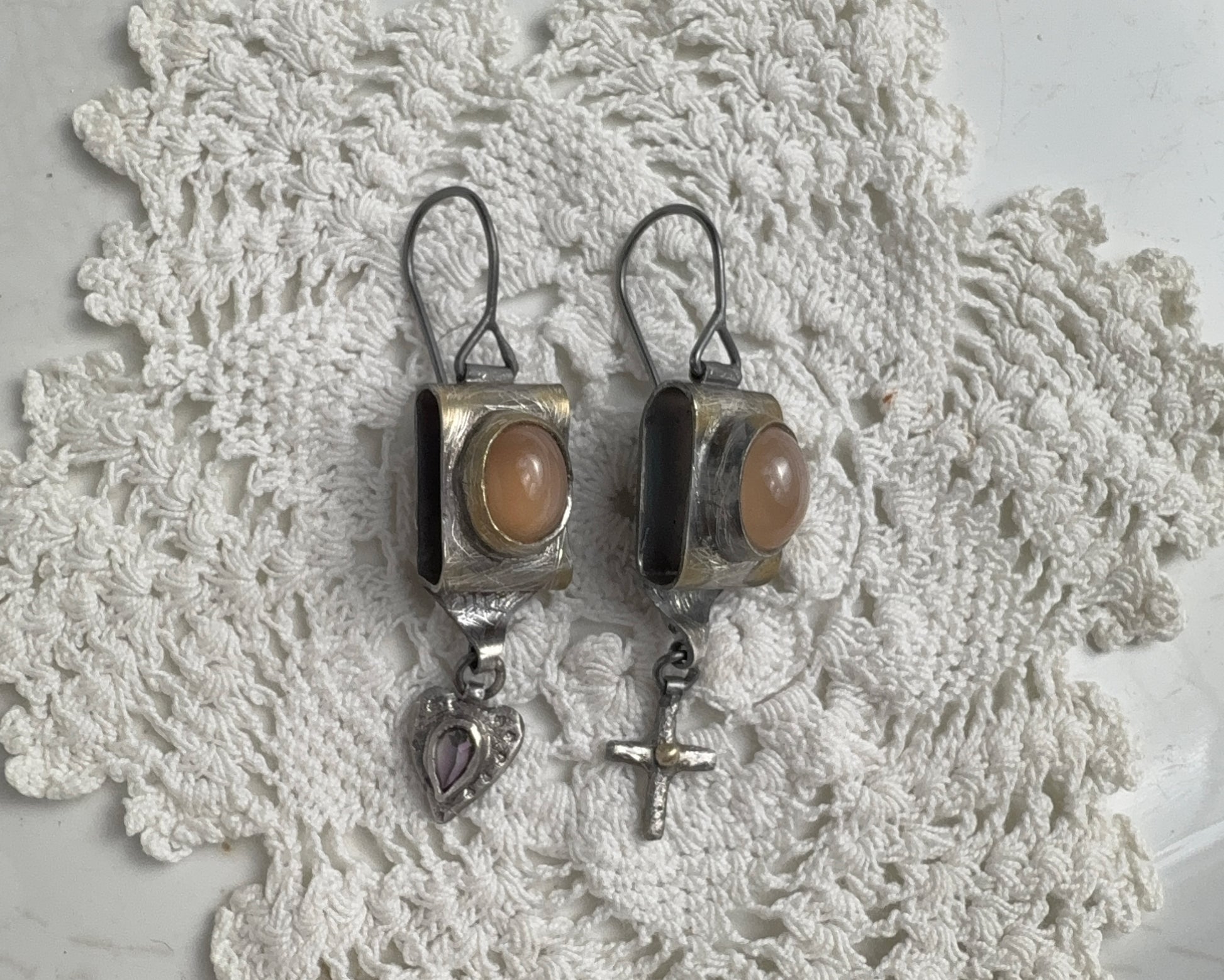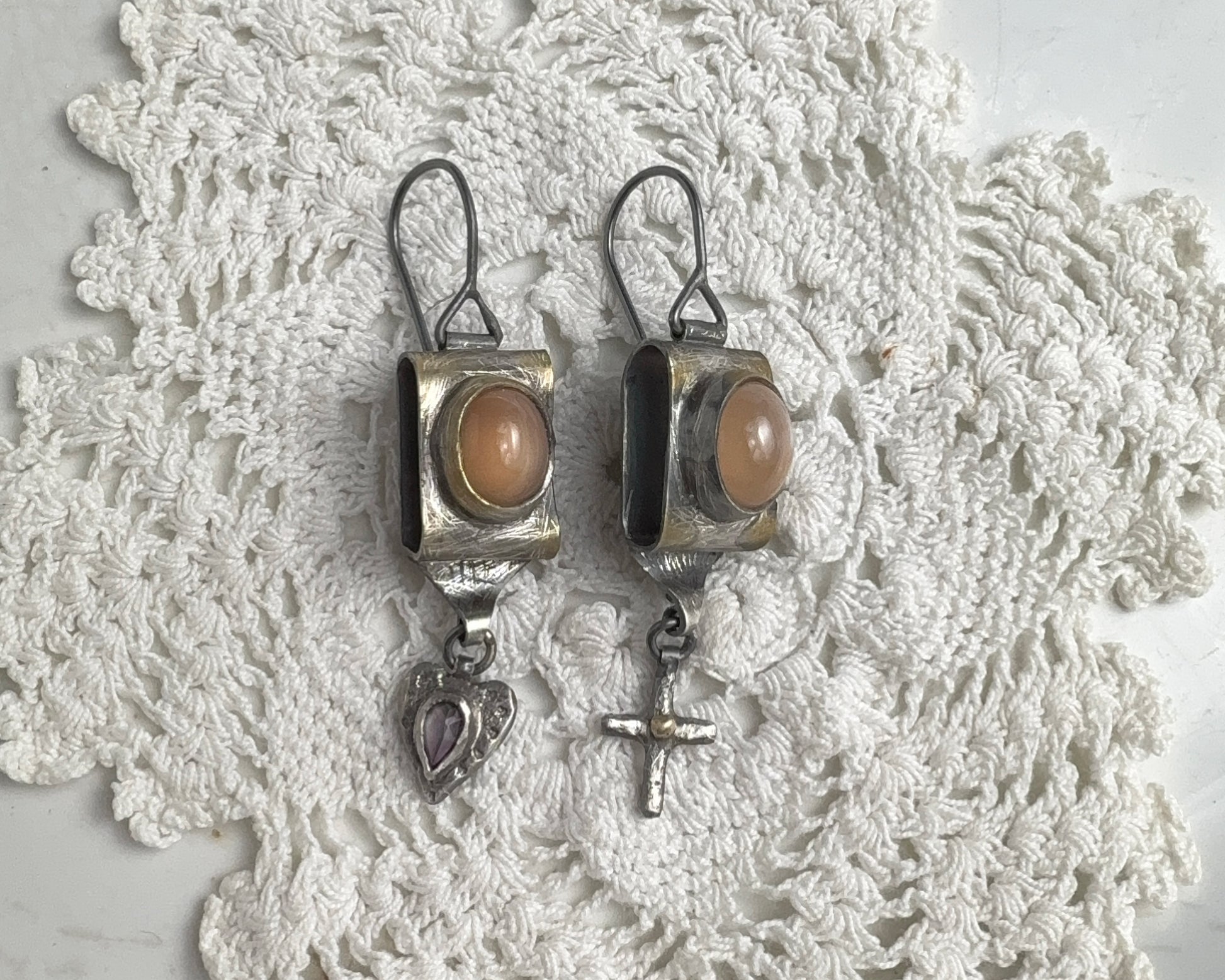 Handcrafted earrings set with pink-toned moonstones. The metal is partially finished with 18k gold patina and completed with two different dangling charms: one is a cross with a small 18k gold detail, the other is a heart with a mystical topaz set in the center.