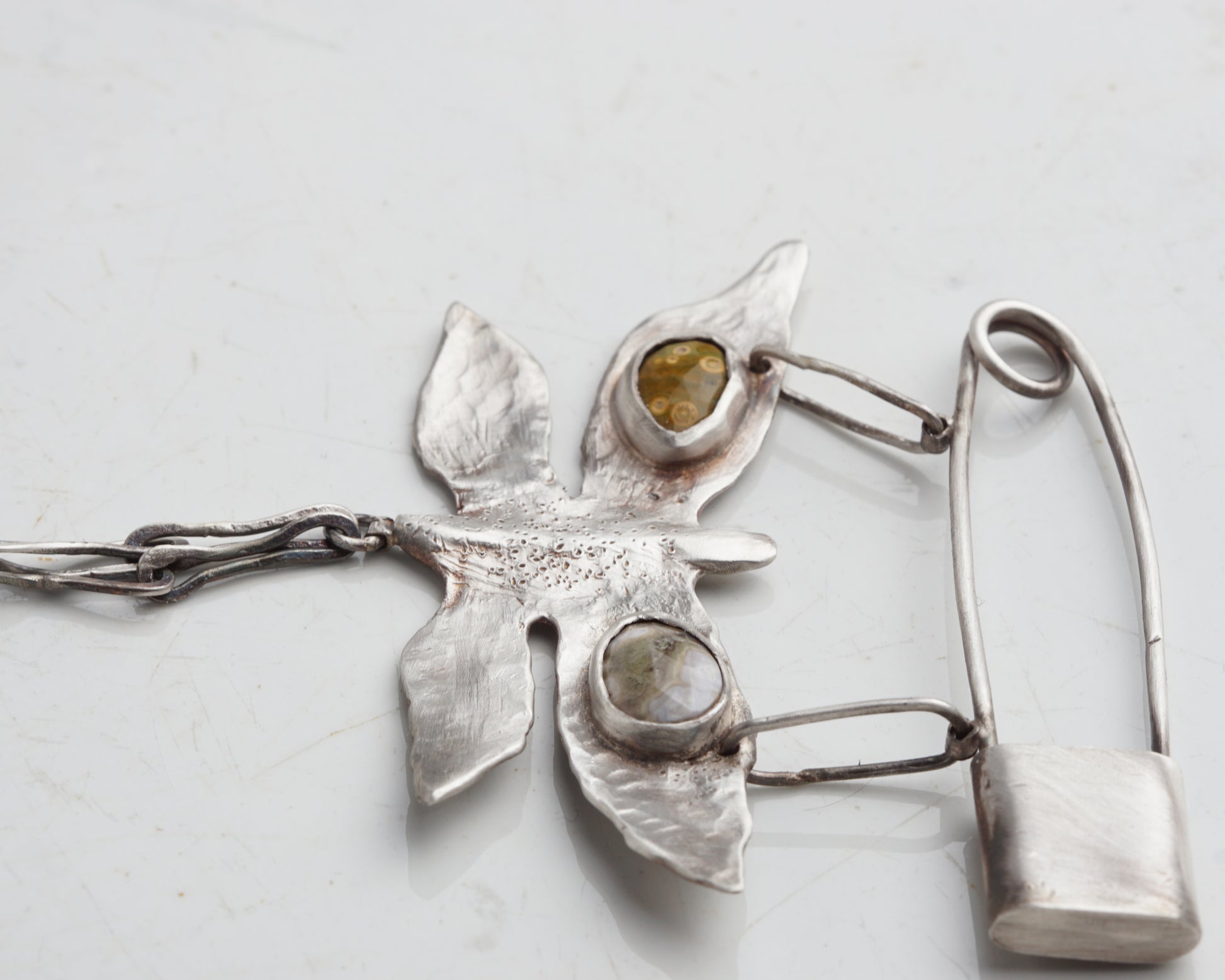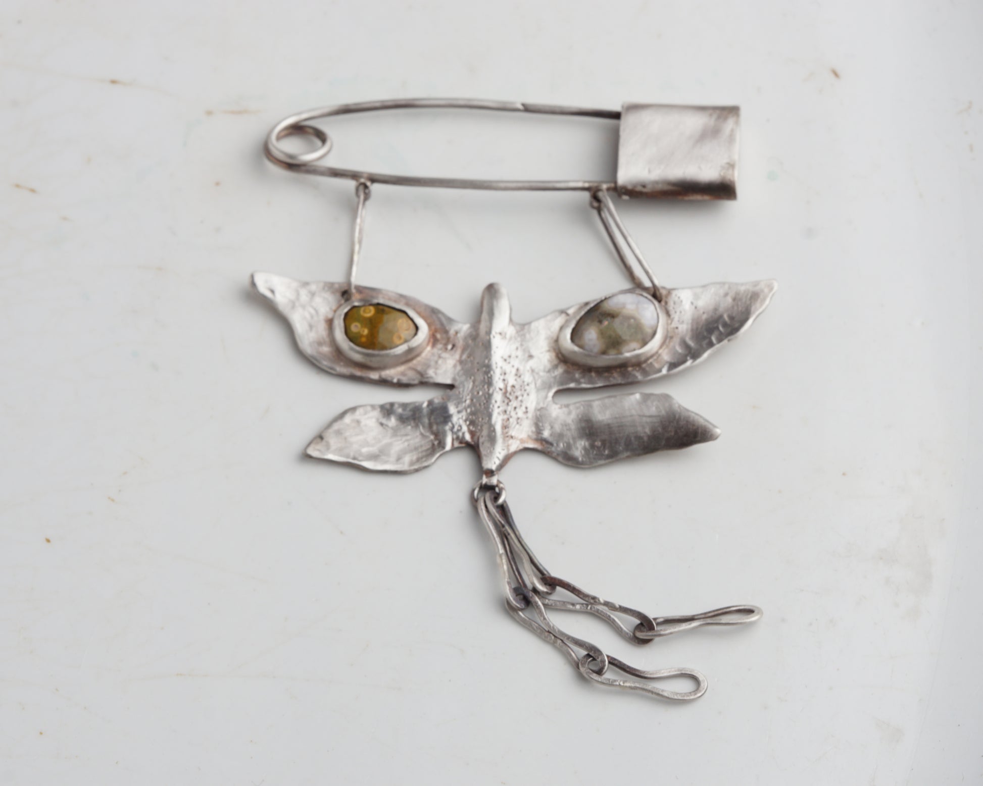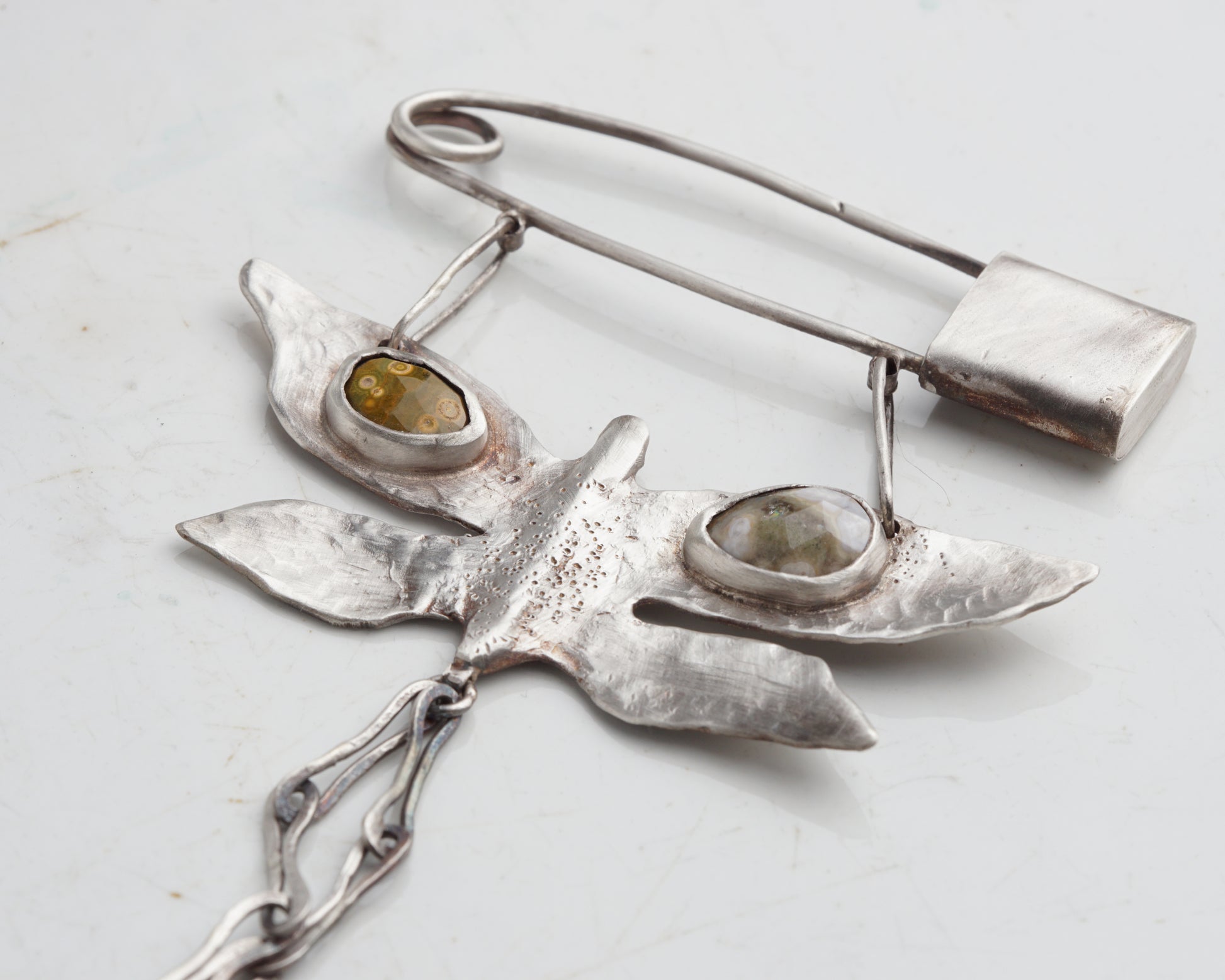 This handcrafted pin features a butterfly-shaped charm in 925 sterling silver. It features a textured finish and two Oceans Jasper wing-shaped inlays.