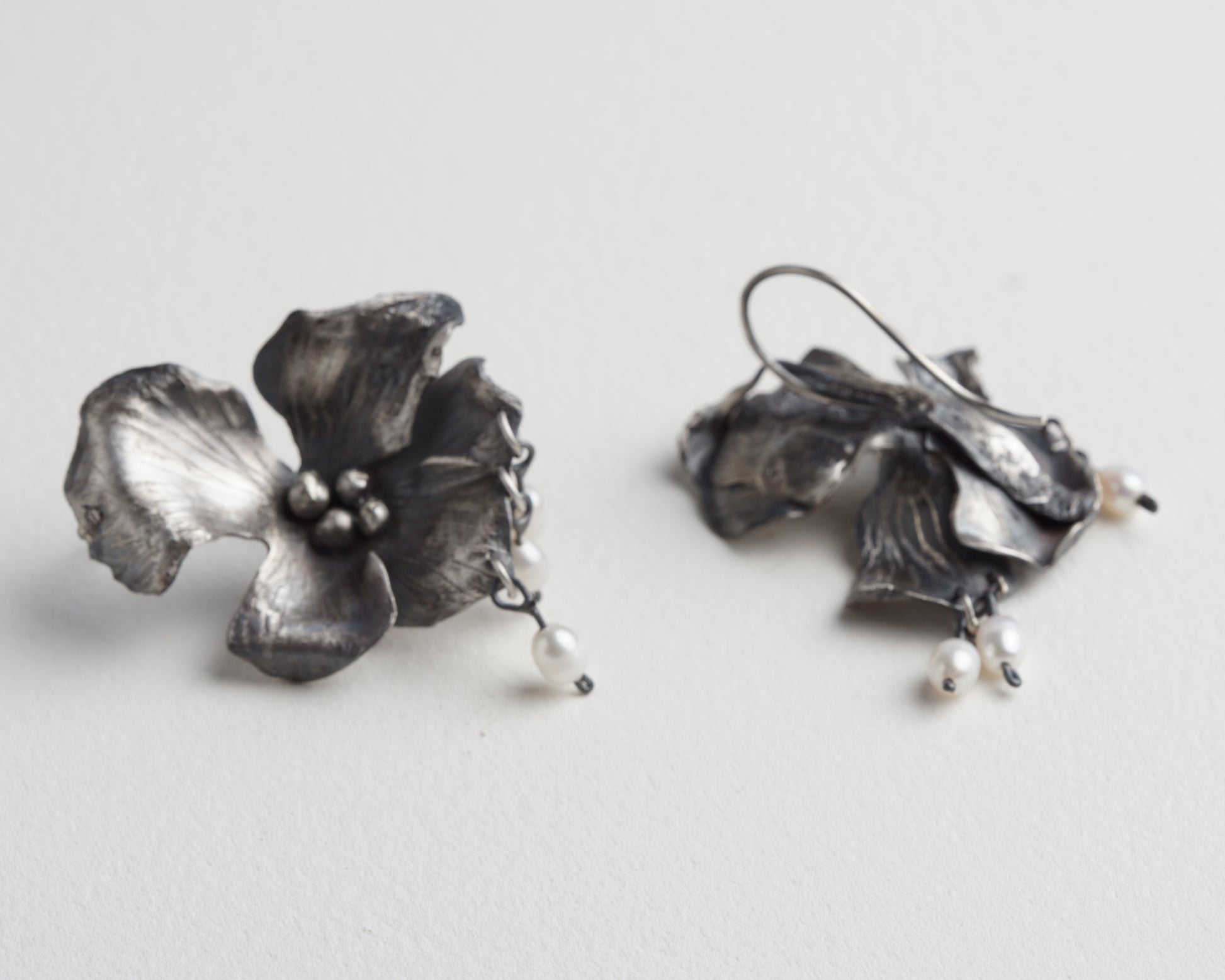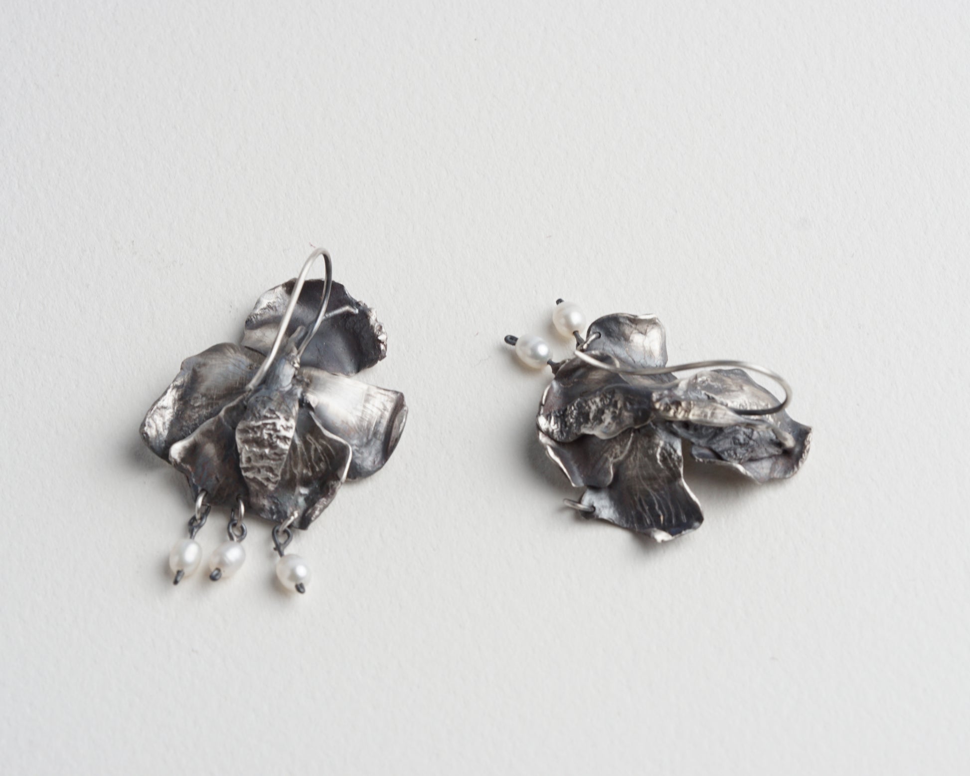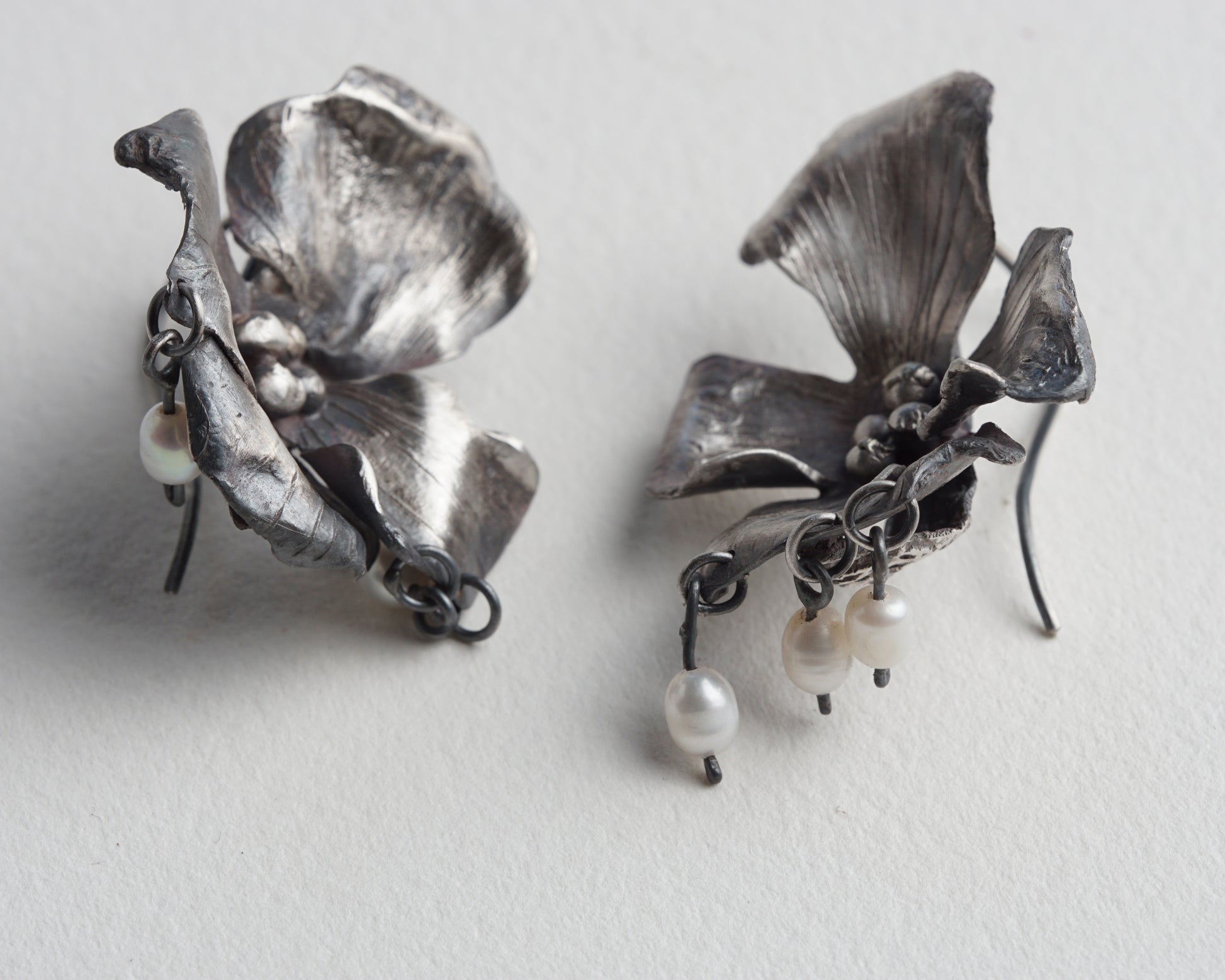 Orchid Earrings with small pearl pendants. Handcrafted from sterling silver. Comfortable and unique, suitable for everyday wear and special occasions. One-of-a-kind piece.
