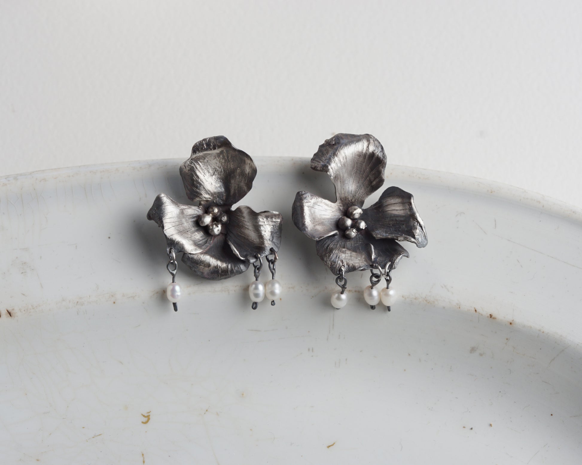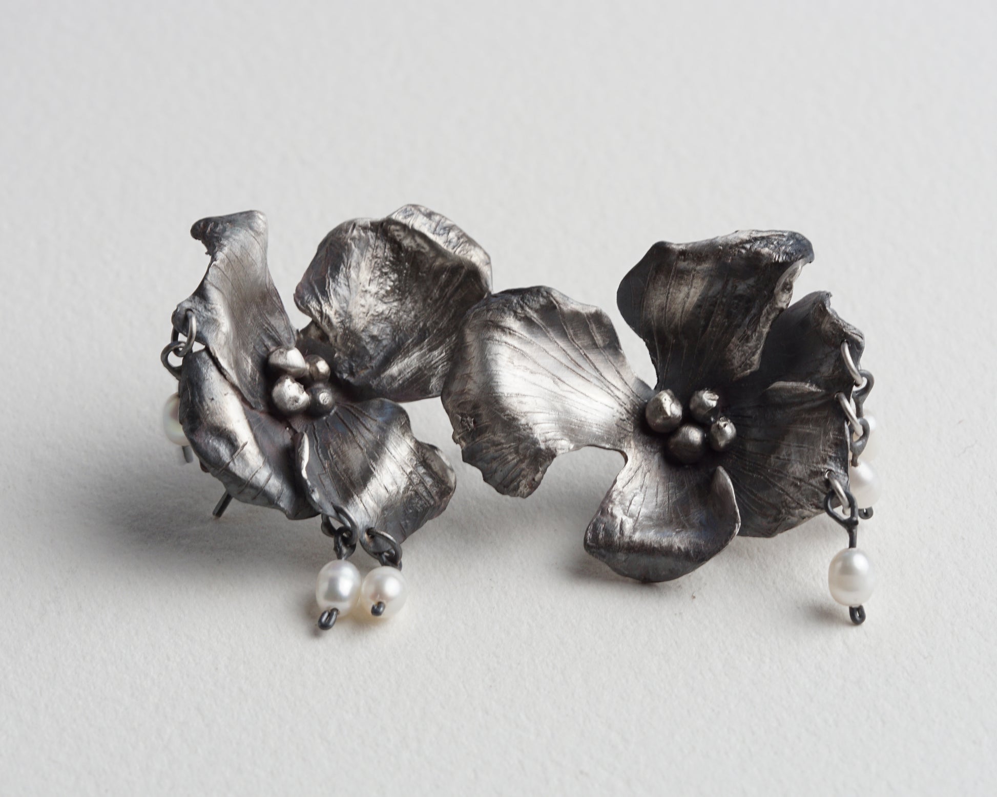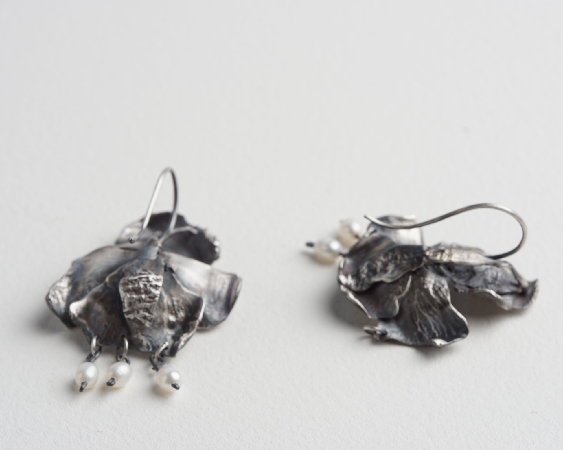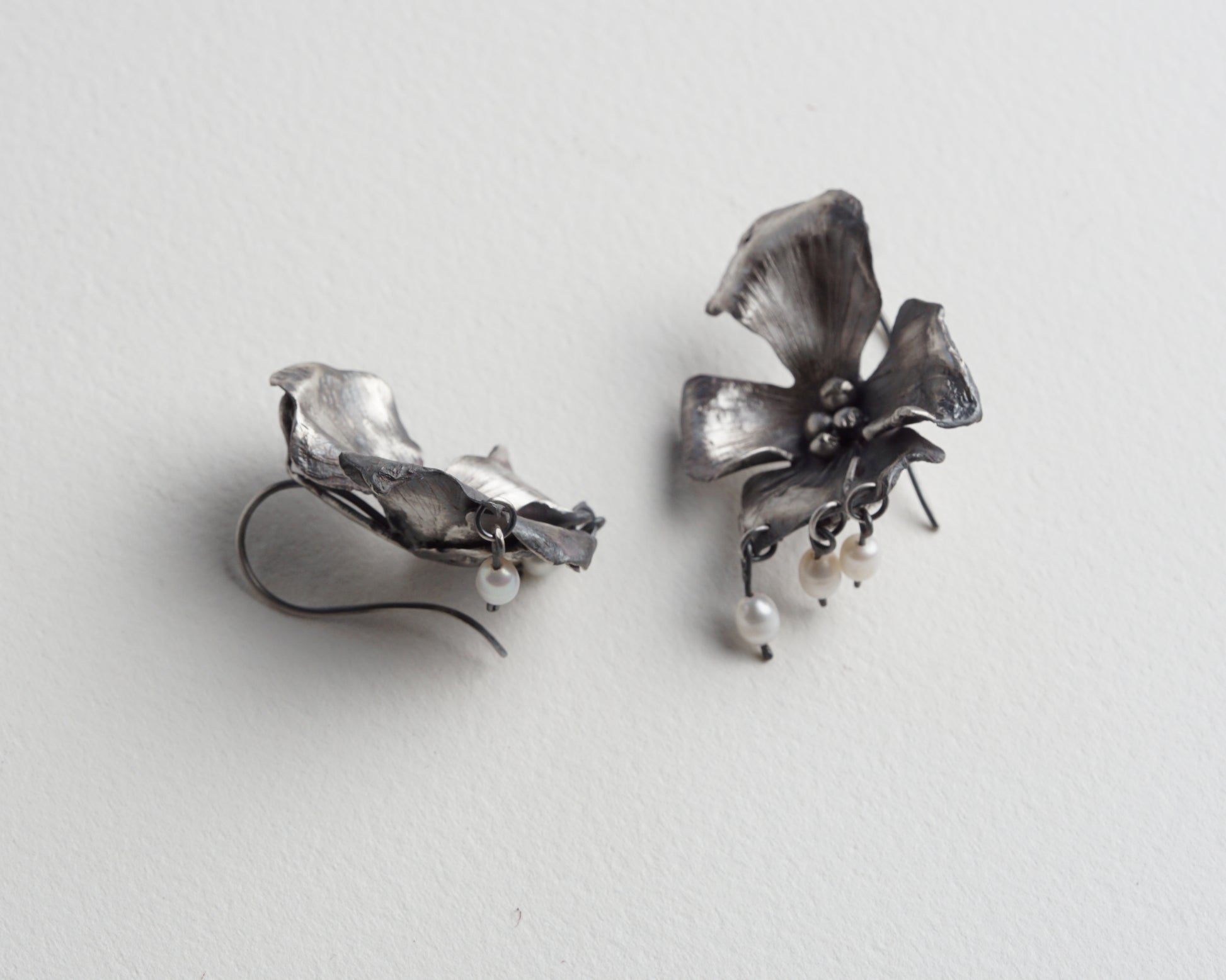 Orchid Earrings with small pearl pendants. Handcrafted from sterling silver. Comfortable and unique, suitable for everyday wear and special occasions. One-of-a-kind piece.