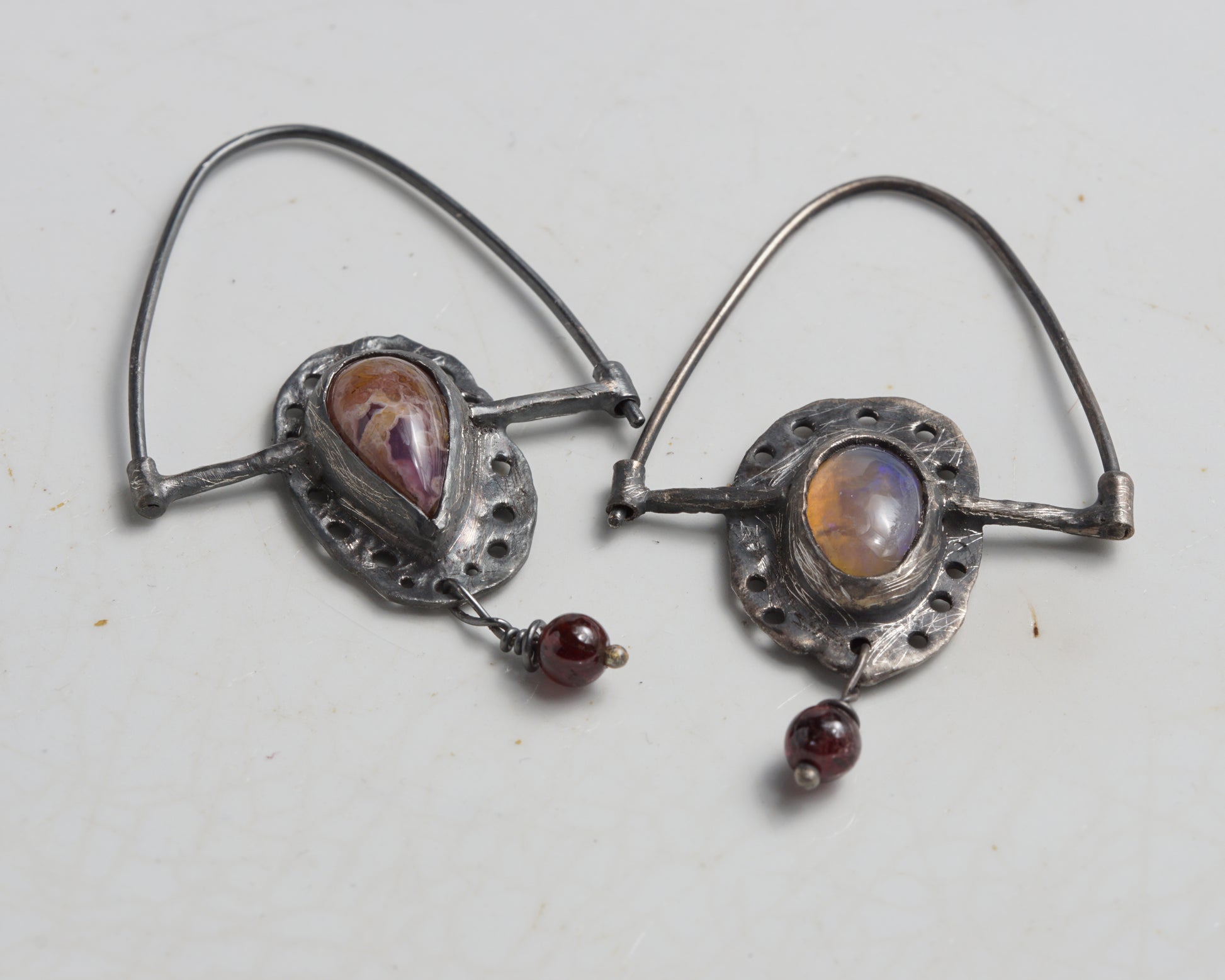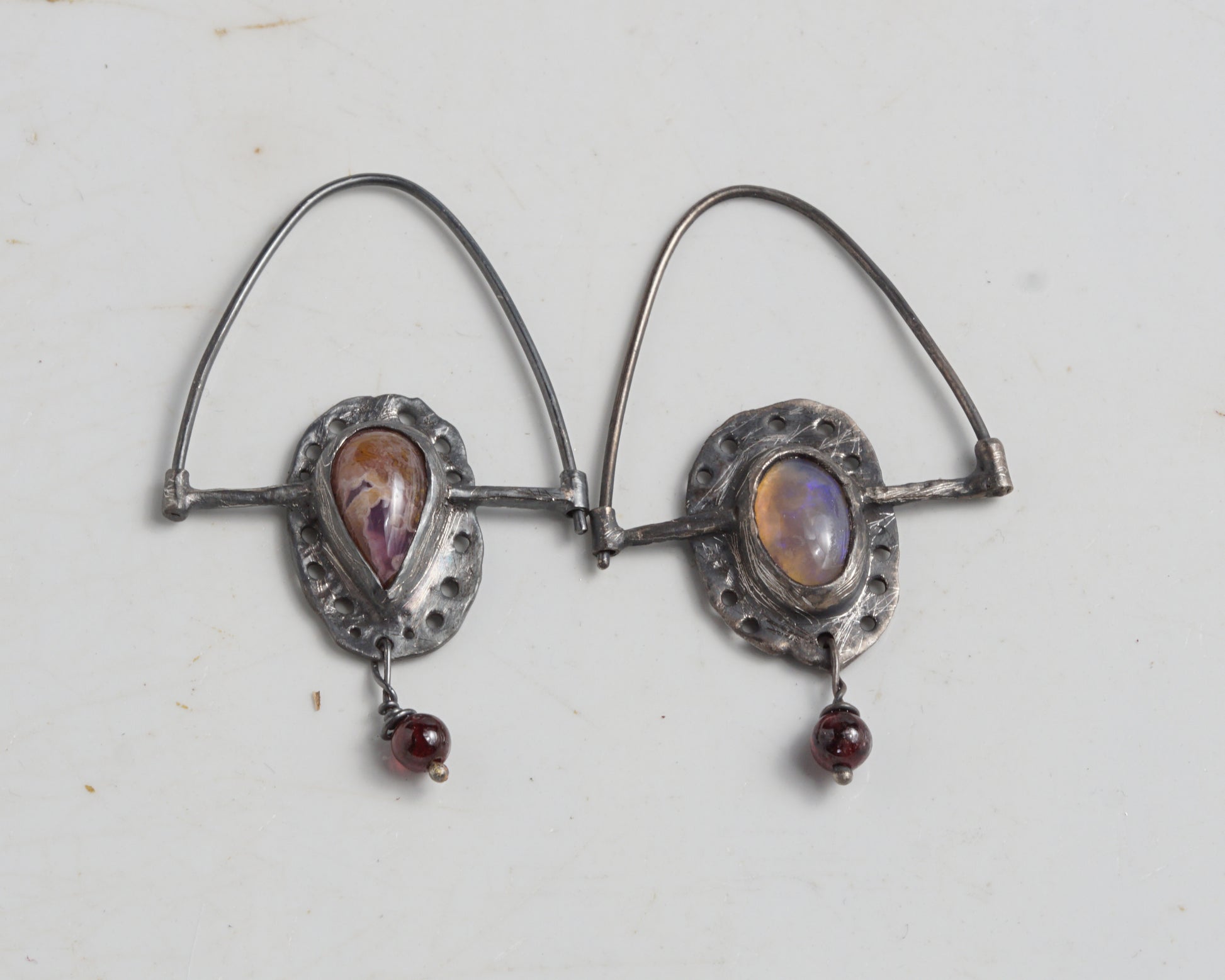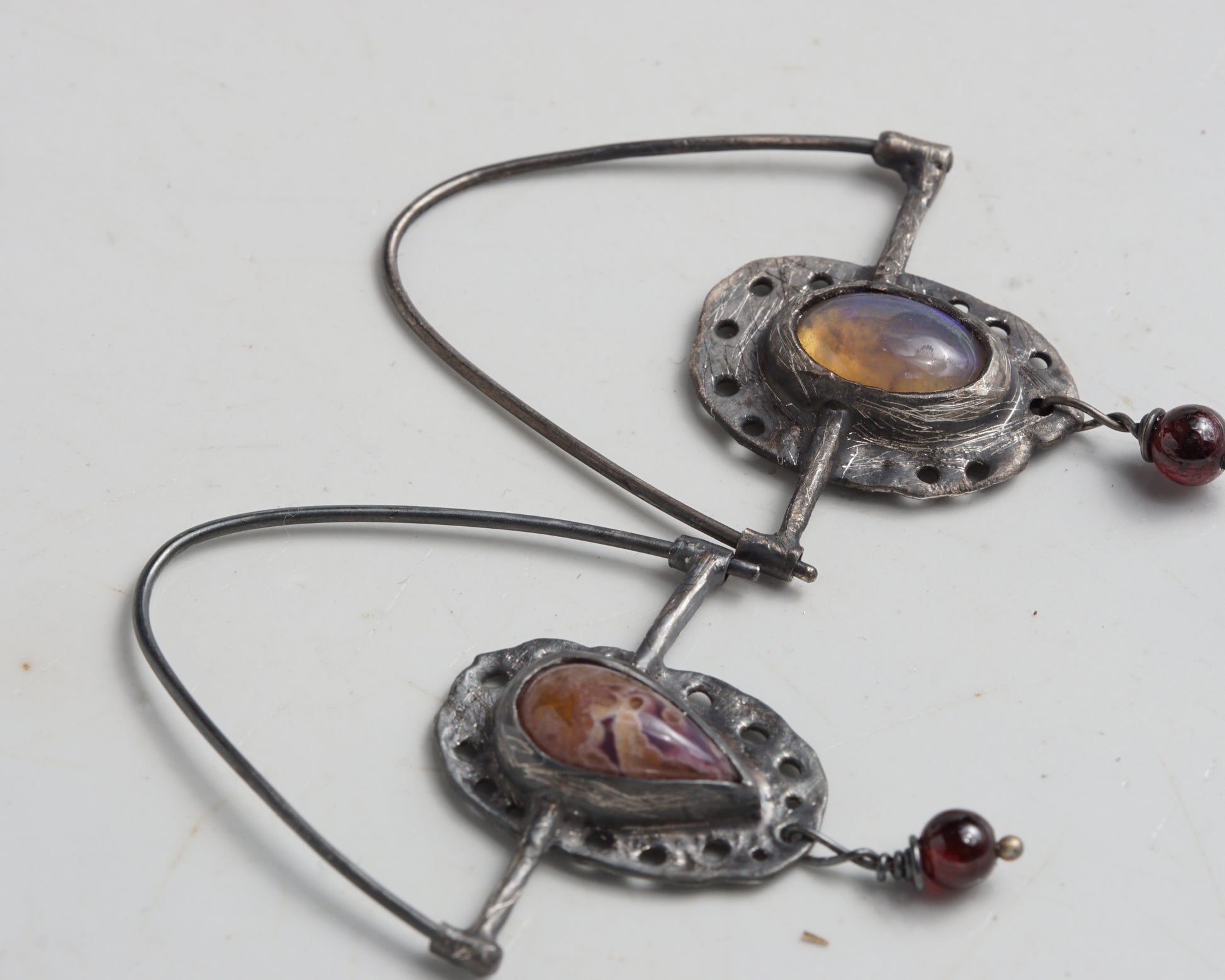 Handmade silver earrings with opal cabochons and garnet bead drops. Oxidized finish with a textured, aged look.
