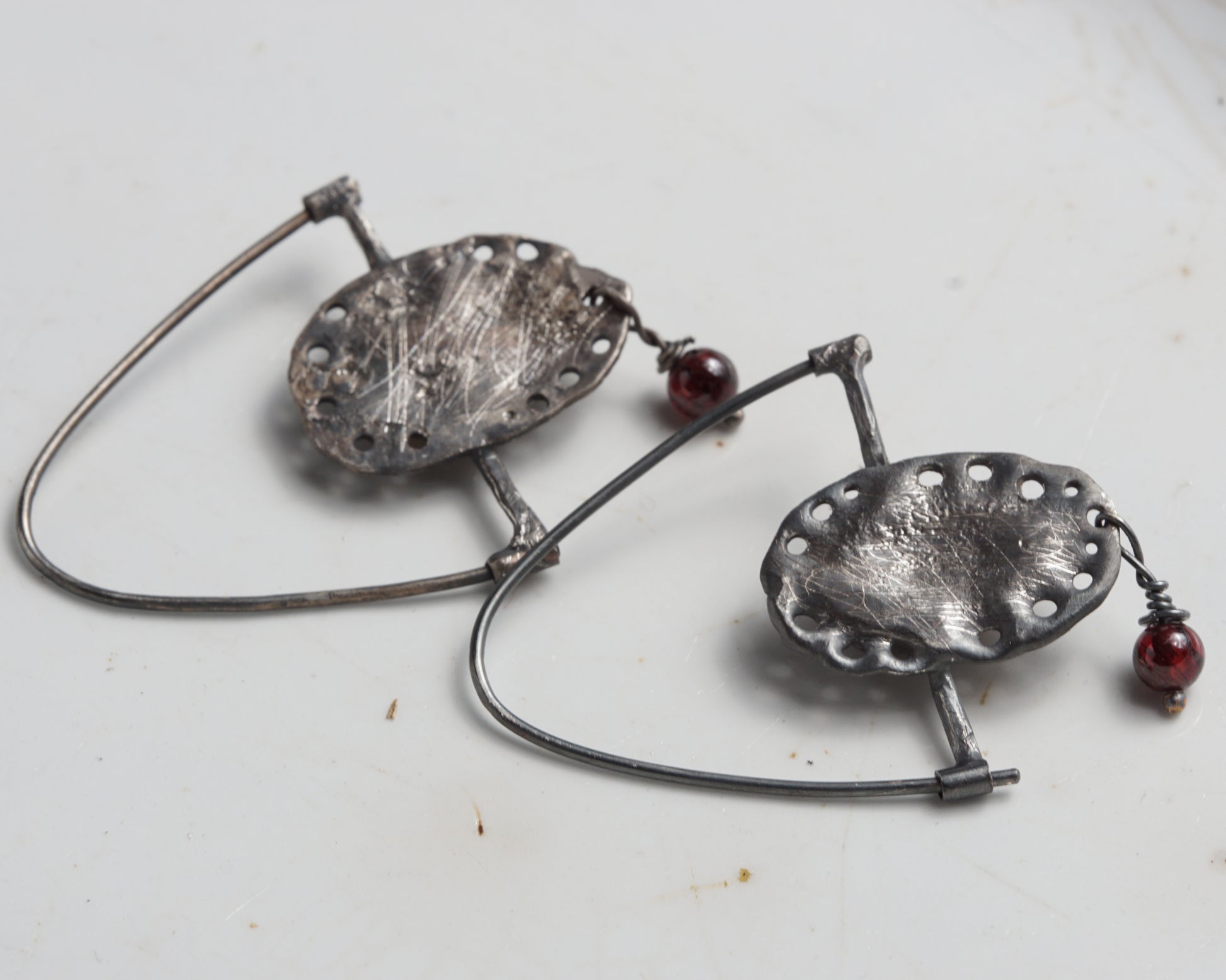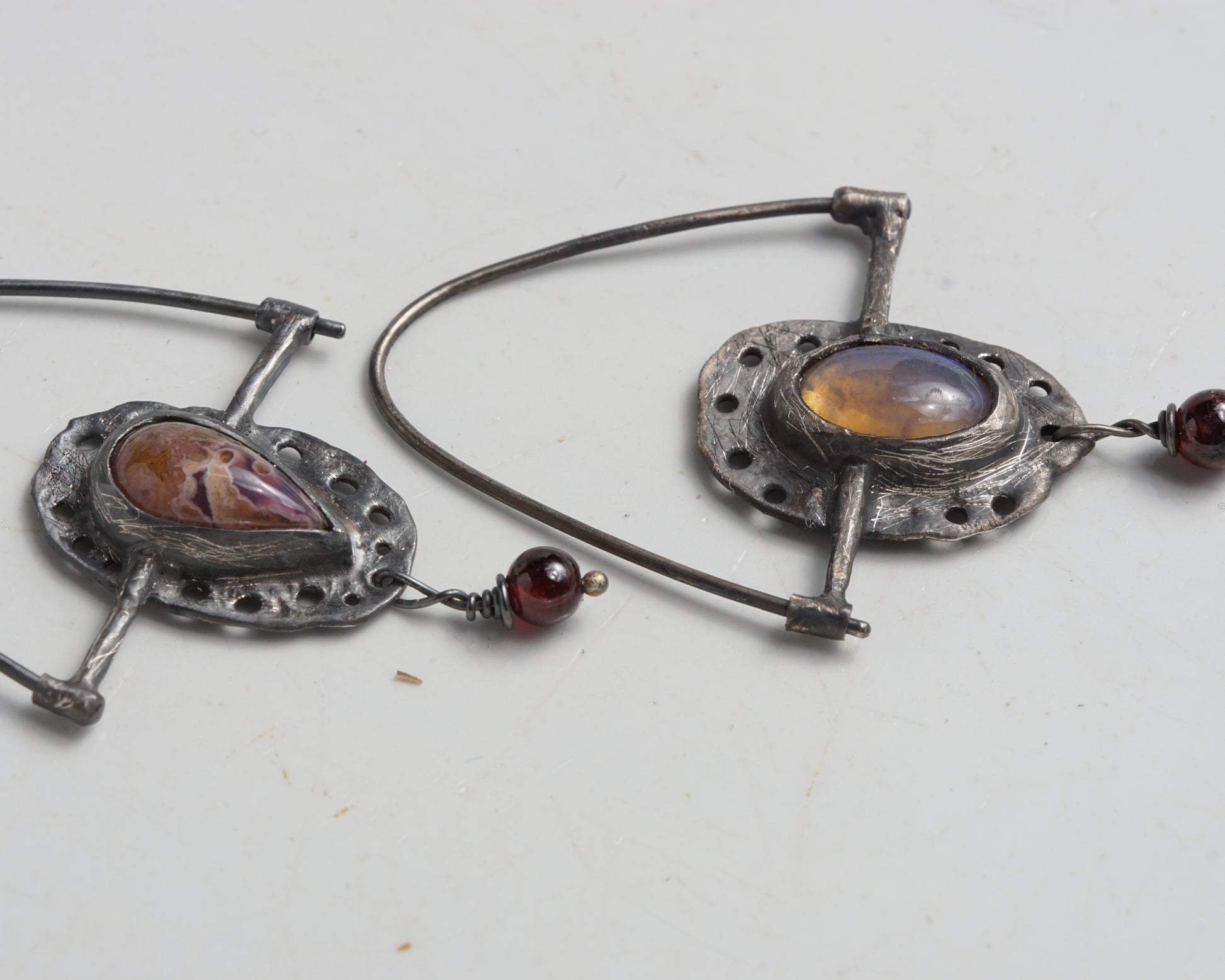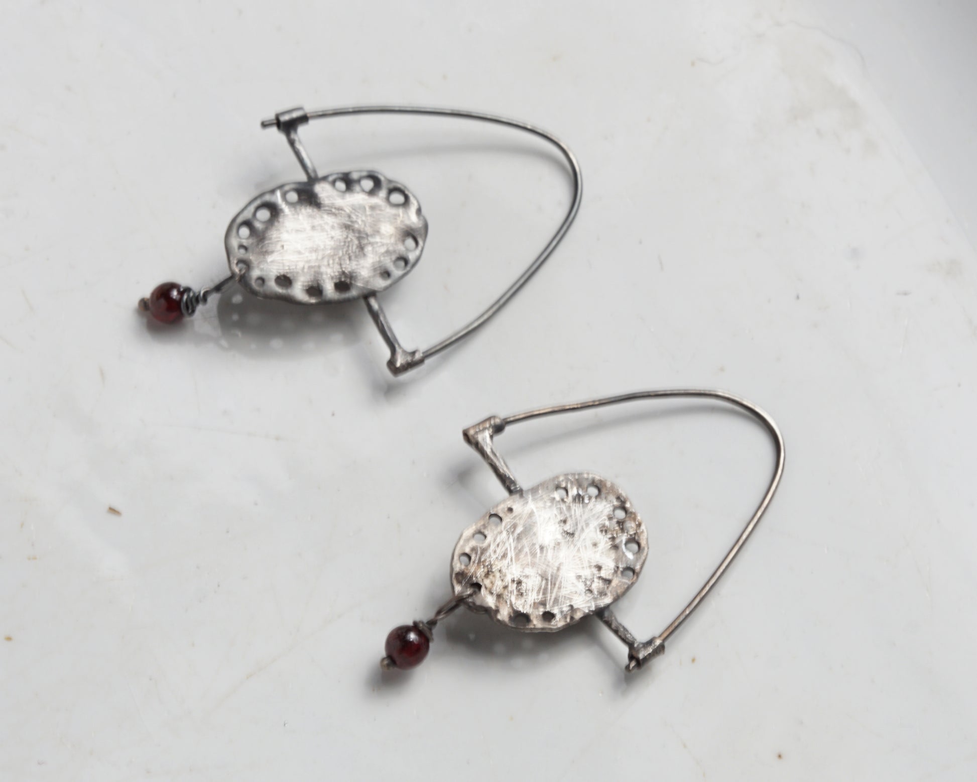 Handmade silver earrings with opal cabochons and garnet bead drops. Oxidized finish with a textured, aged look.