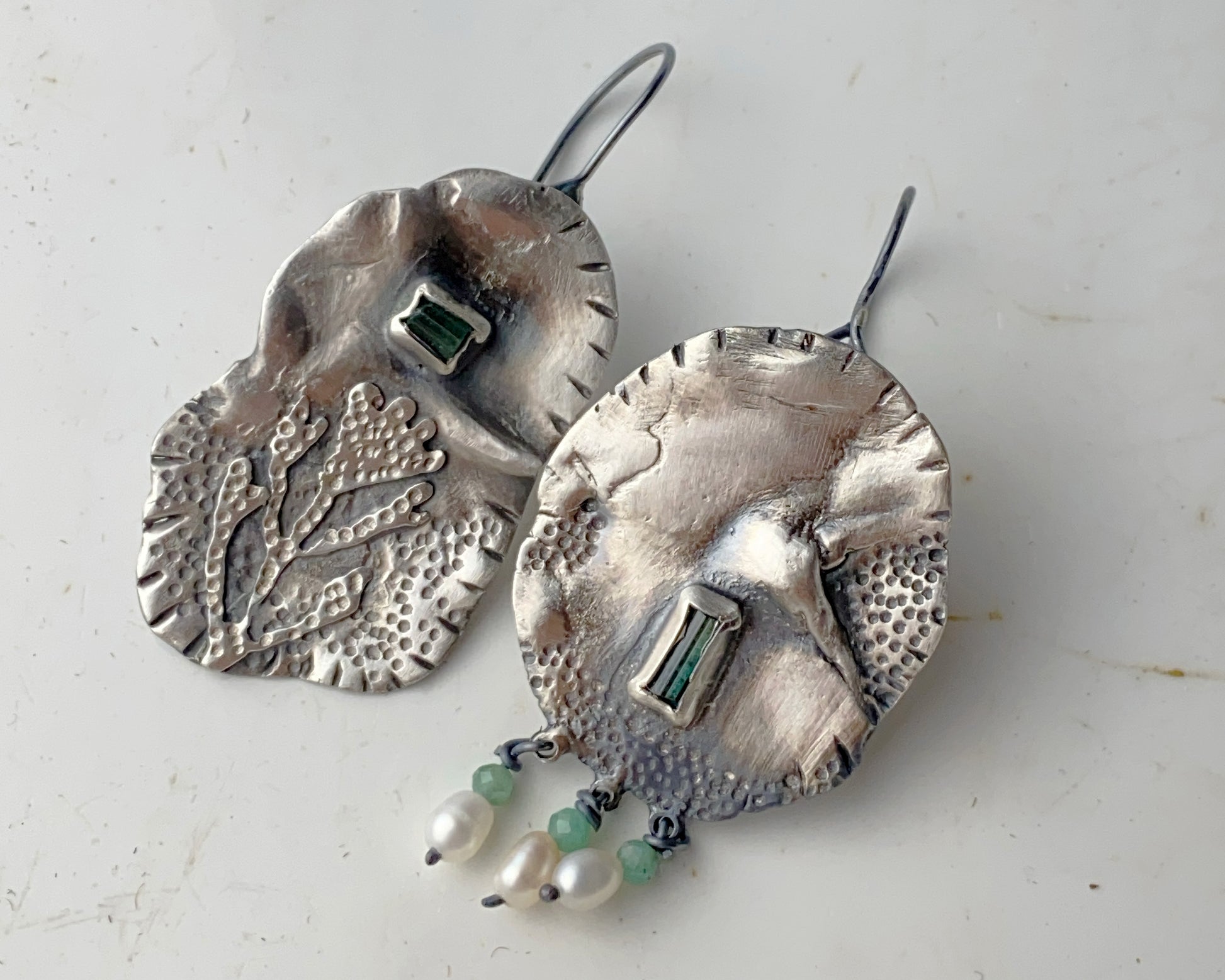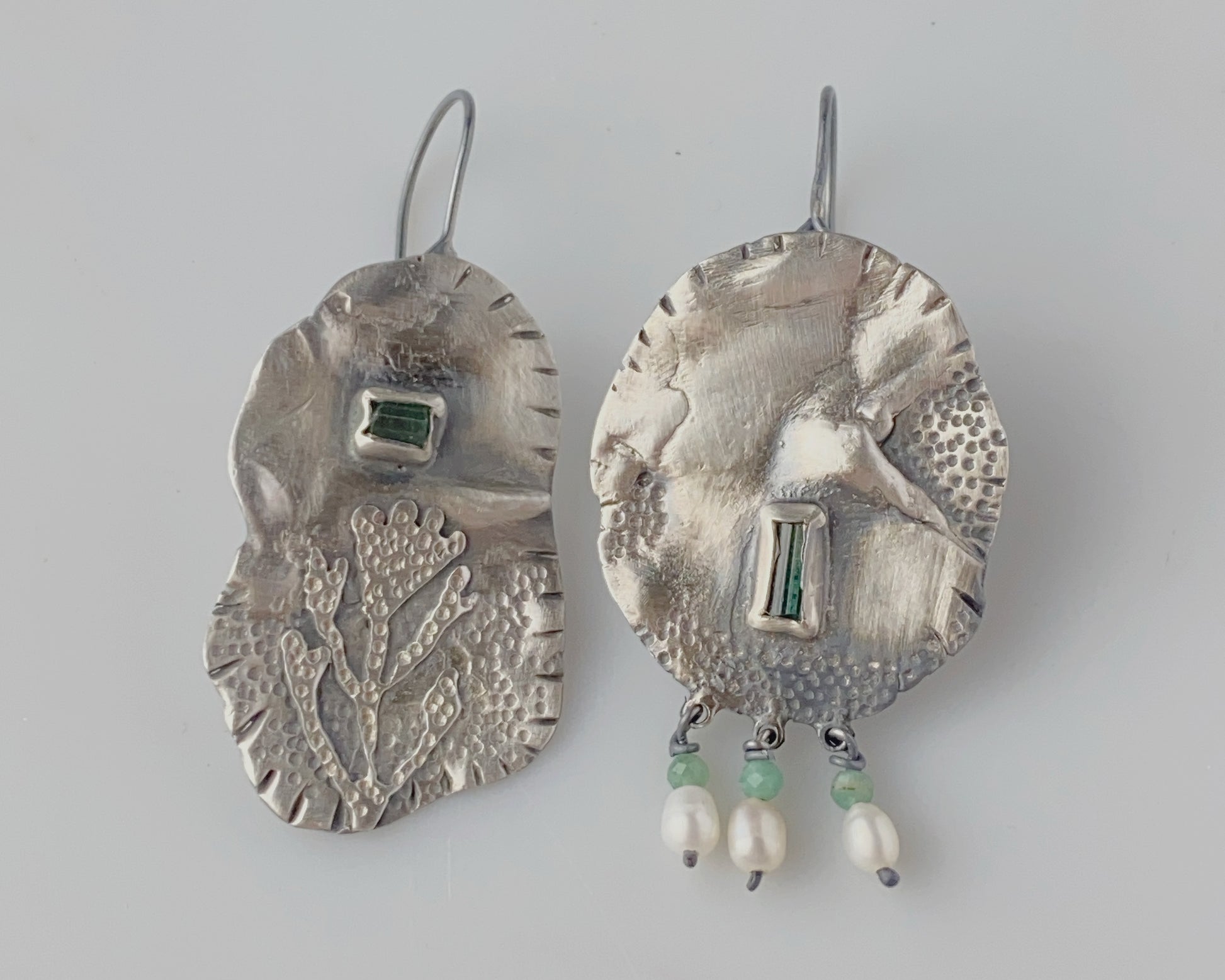 Sterling silver handcrafted earrings featuring green tourmalines and emerald beads set in textured silver frames. One earring is adorned with delicate freshwater pearl drops, while both pieces showcase intricate coral-inspired patterns