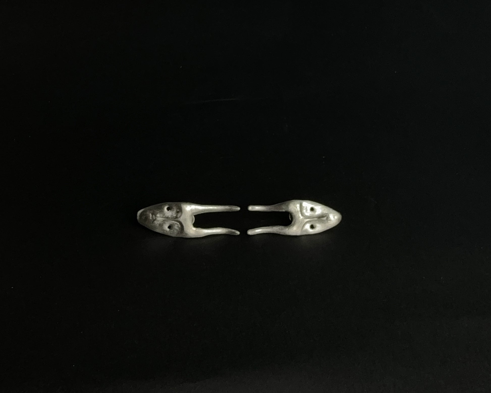 Small, striking handcrafted earrings crafted from 925 sterling silver in the shape of ethnic masks. They feature a toggle clasp and a light matte finish.