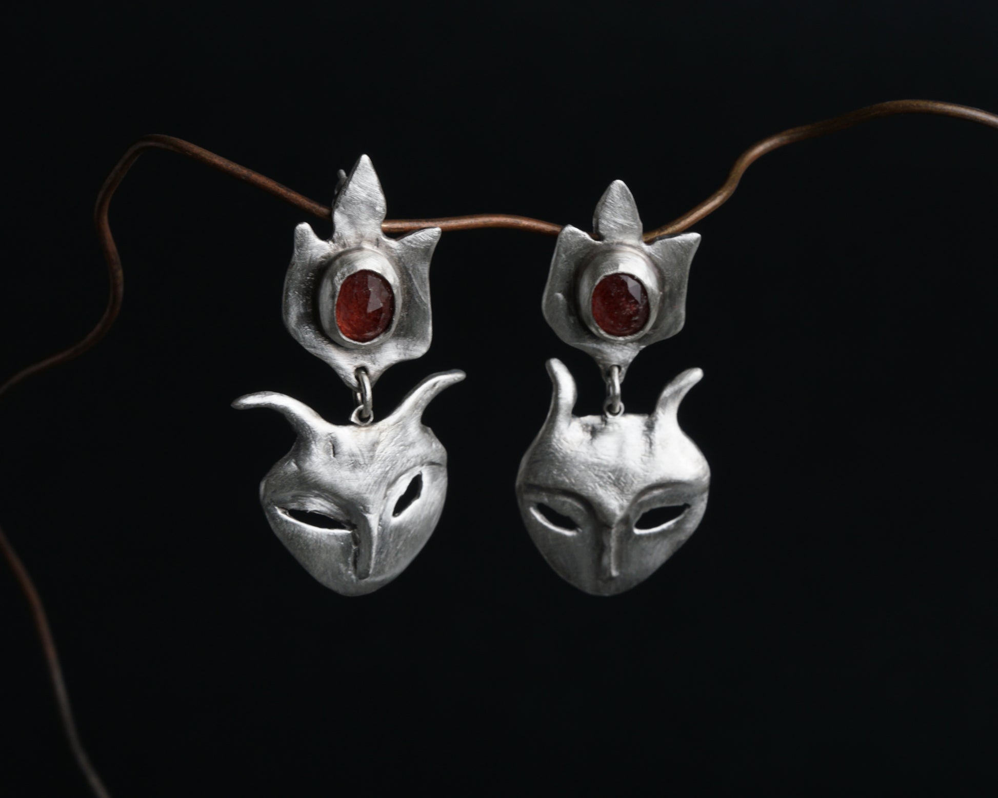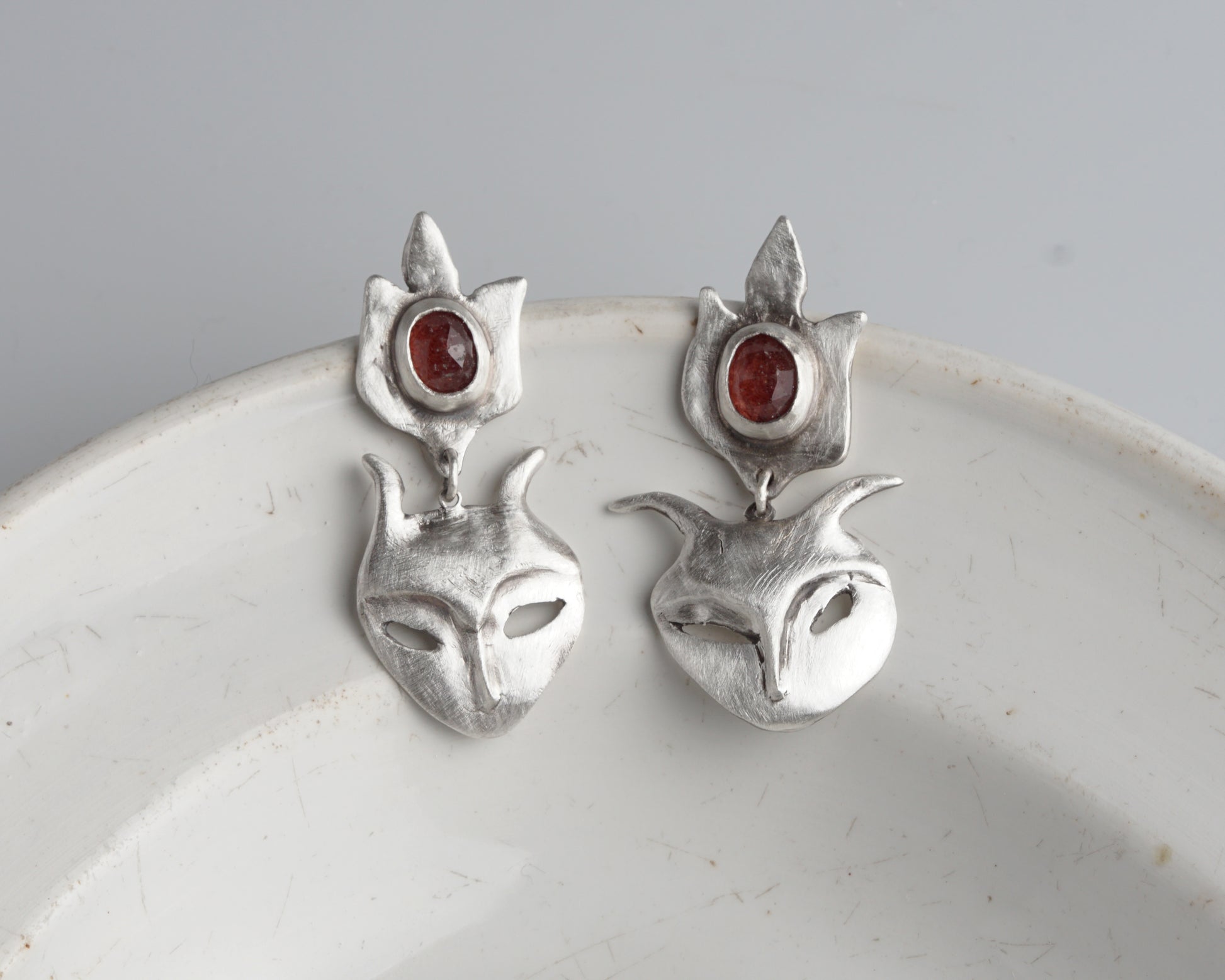 Handcrafted silver earrings with cabochon-cut strawberry quartz stones and dangling mask-shaped charms inspired by ethnic motifs. Secure stud fastening.