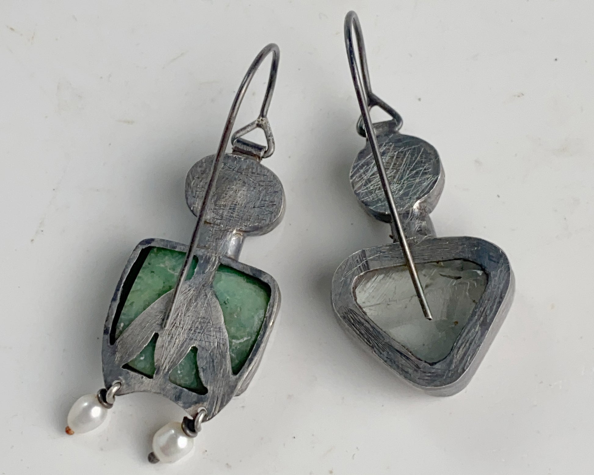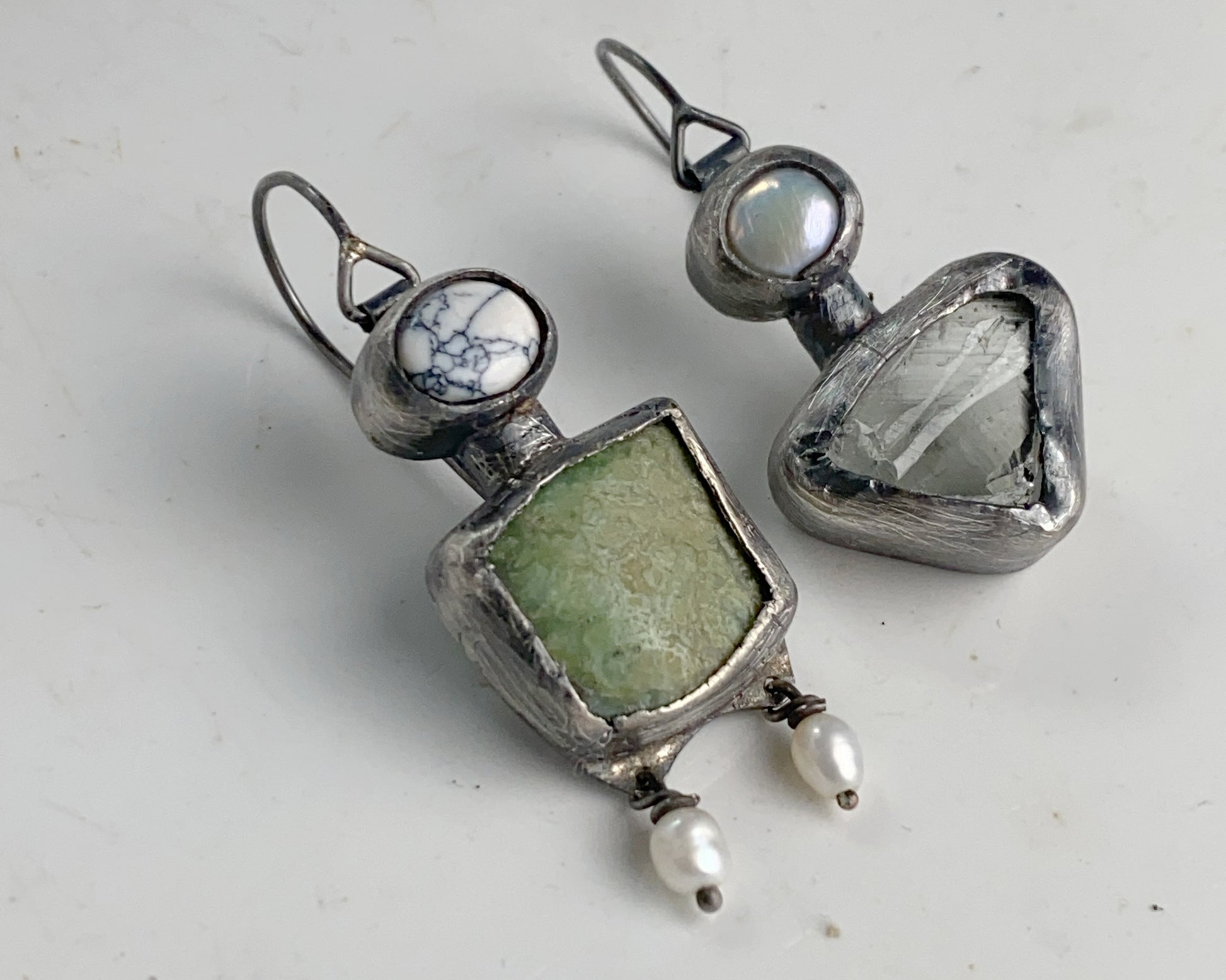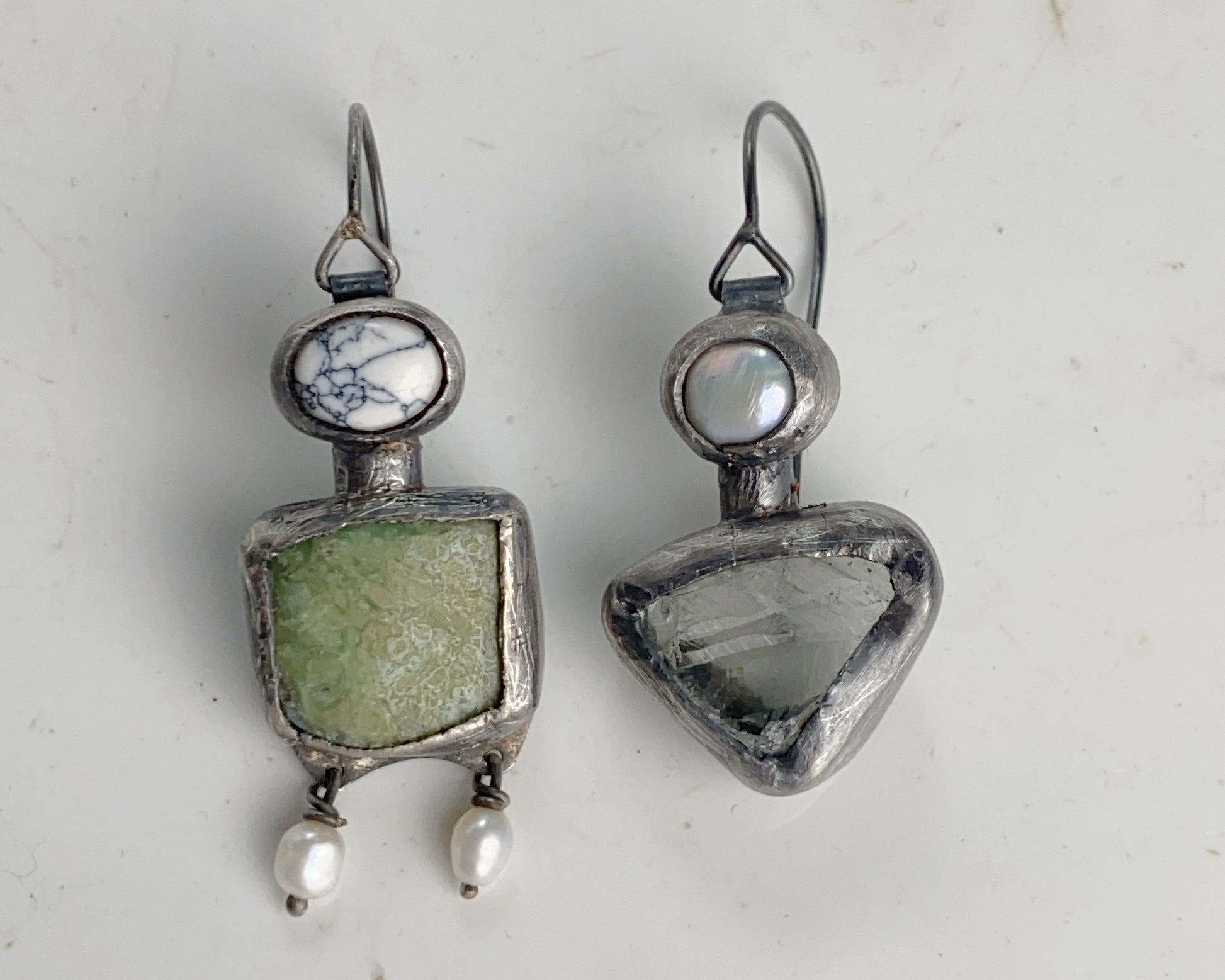 One earring has a gowlite stone and a chrysoprase square-shaped stone in textured settings. It is decorated with two small pearls and a flower on the back. The second earring features a pearl and a rough-cut, transparent prasiolite stone. Both earrings are made of sterling silver. They have varied geometric and organic shapes.