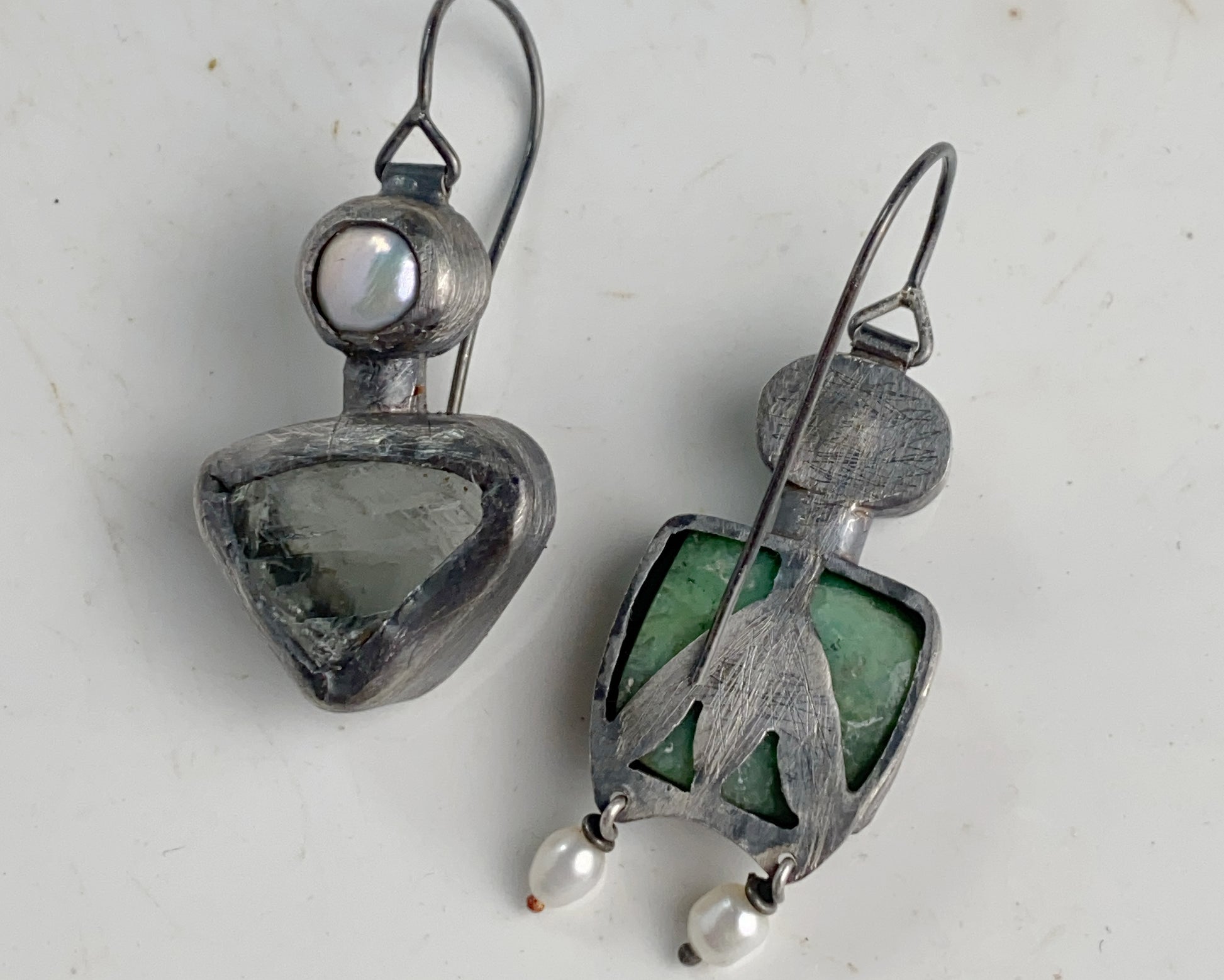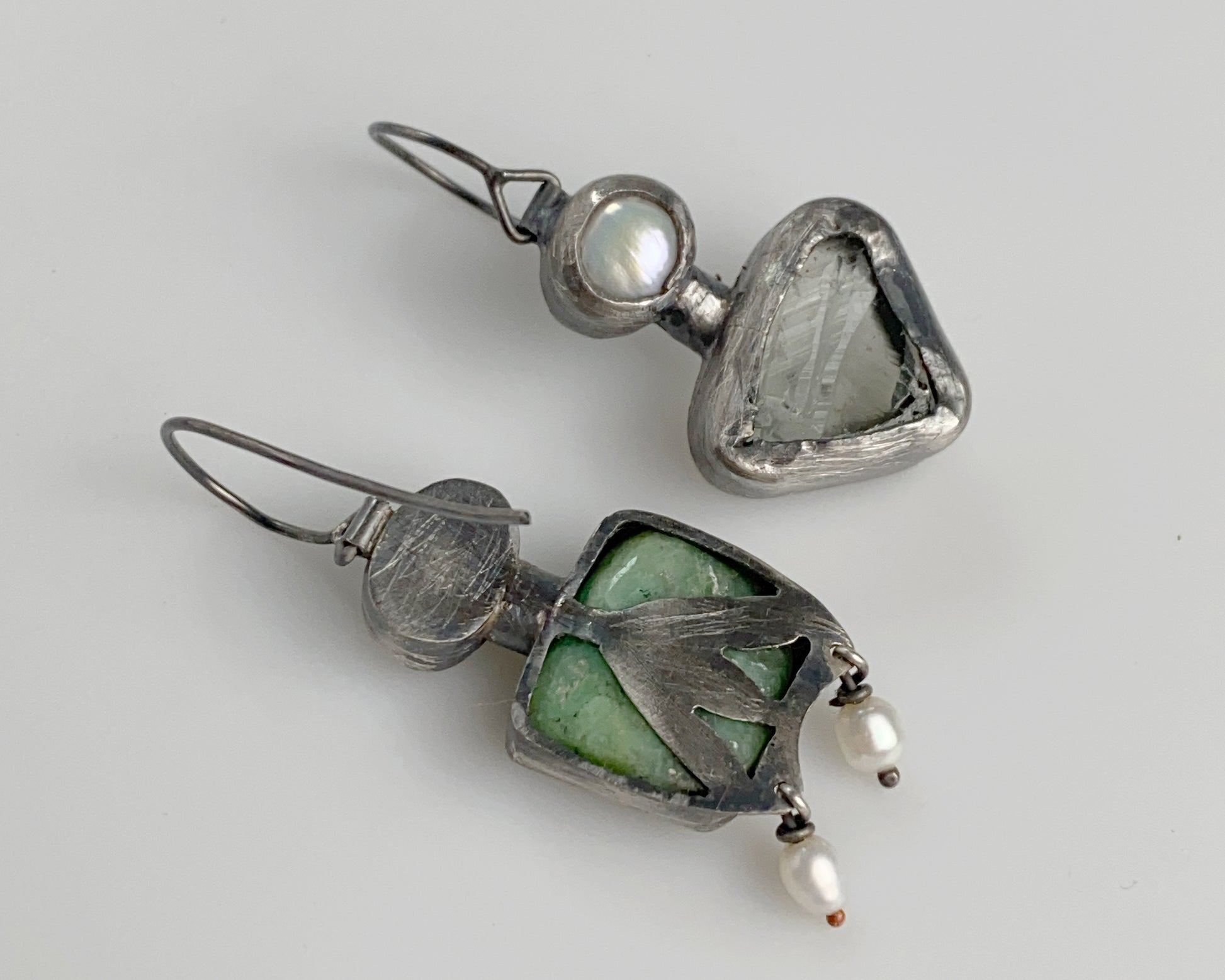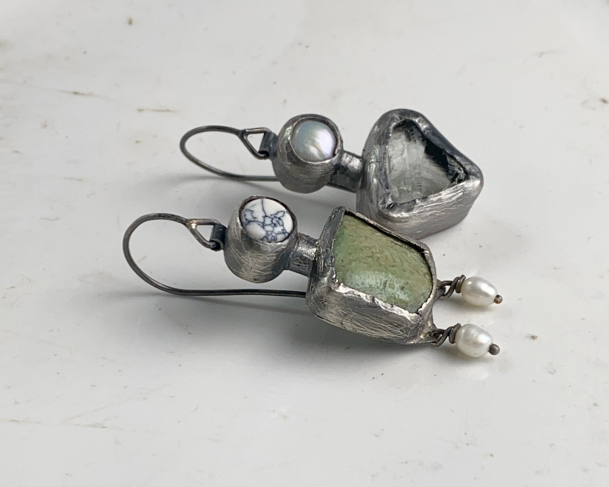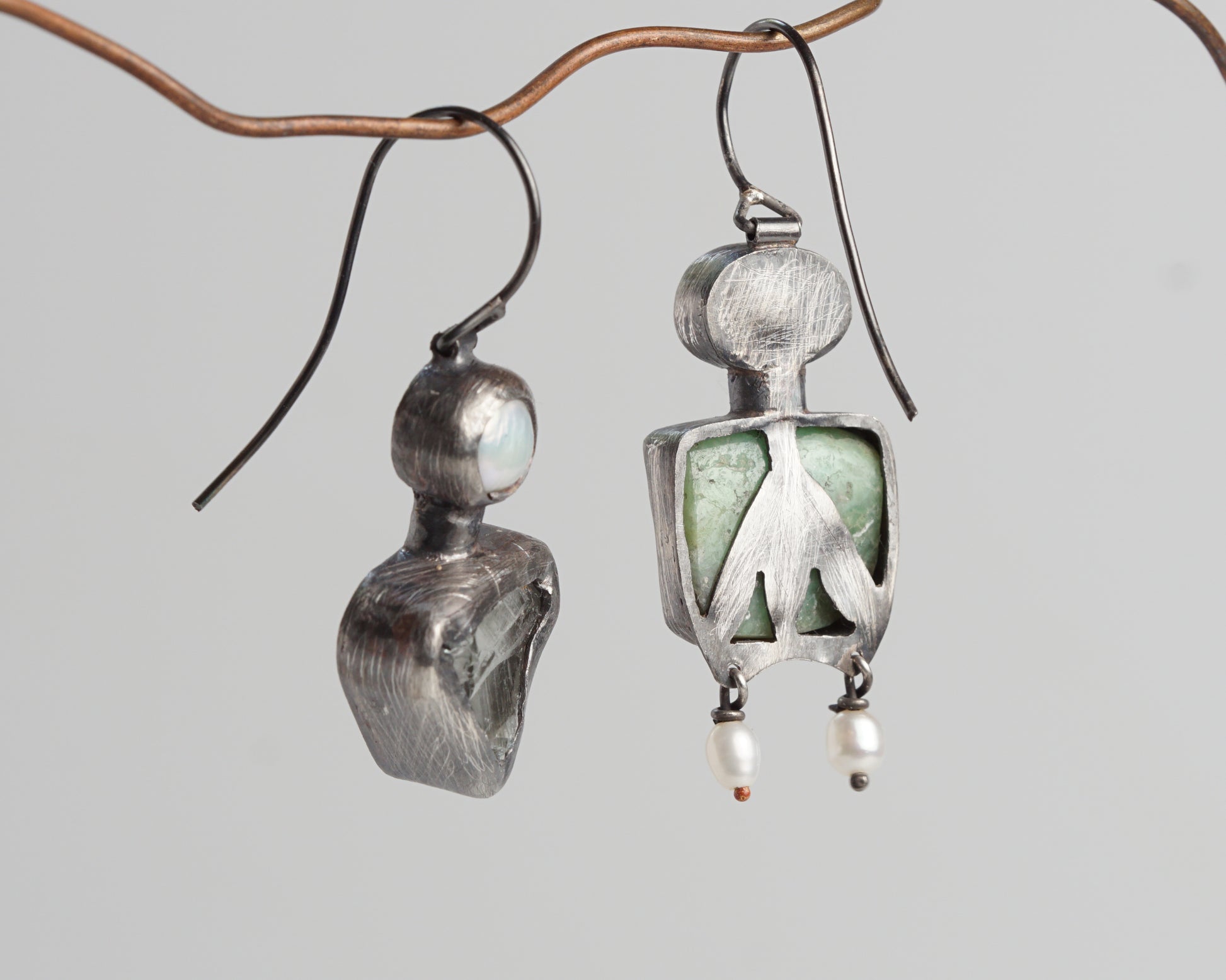 One earring has a gowlite stone and a chrysoprase square-shaped stone in textured settings. It is decorated with two small pearls and a flower on the back. The second earring features a pearl and a rough-cut, transparent prasiolite stone. Both earrings are made of sterling silver. They have varied geometric and organic shapes.