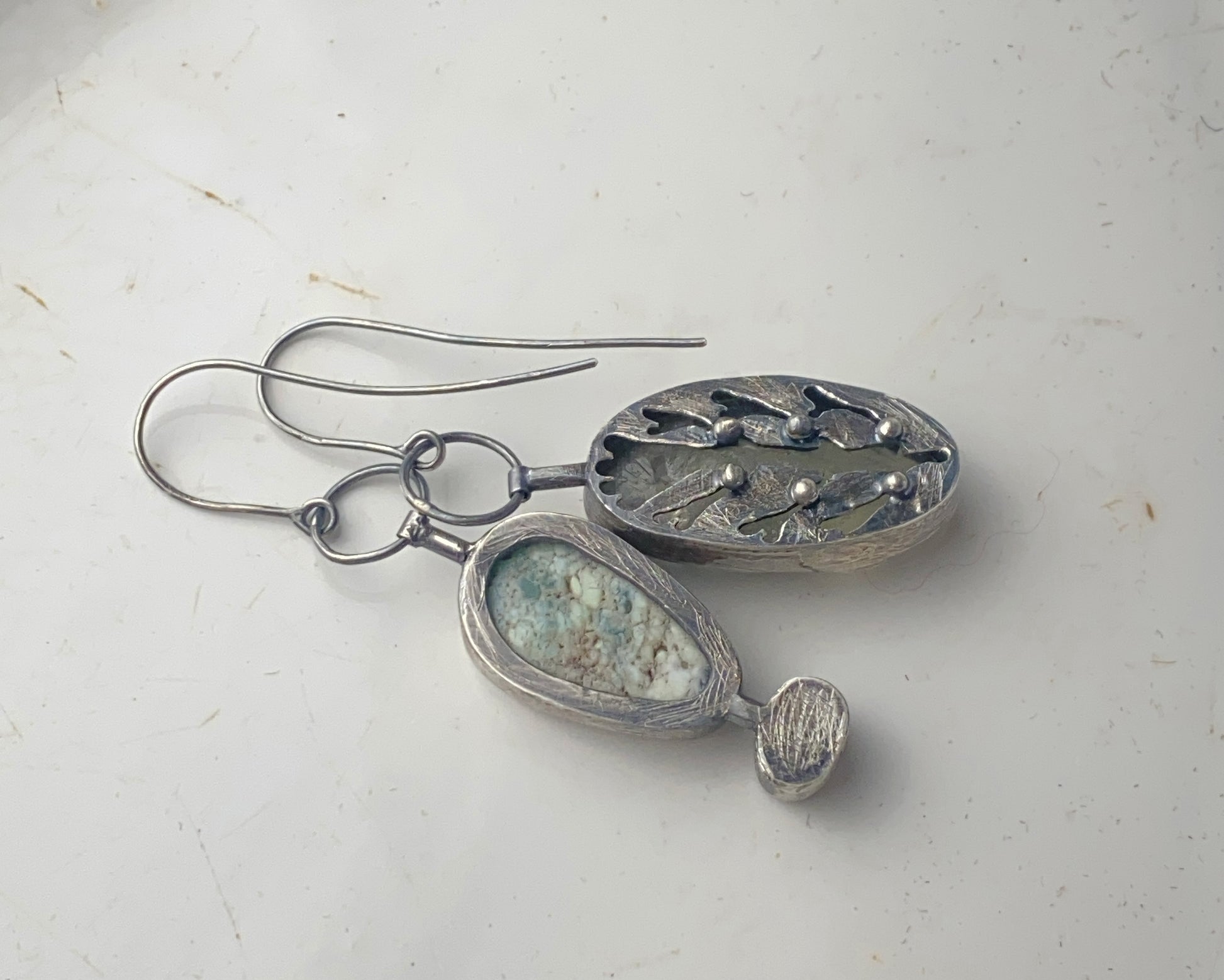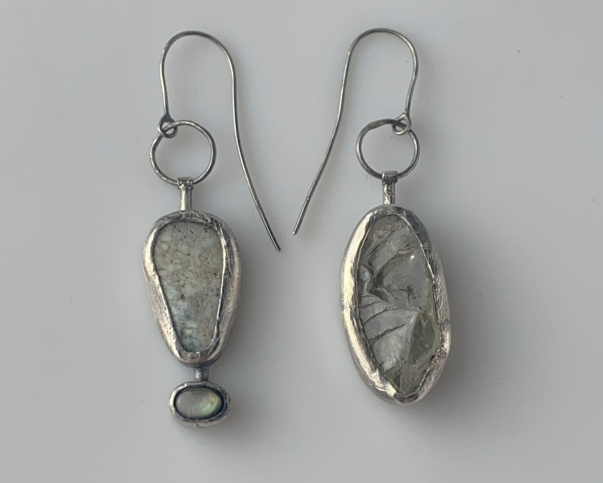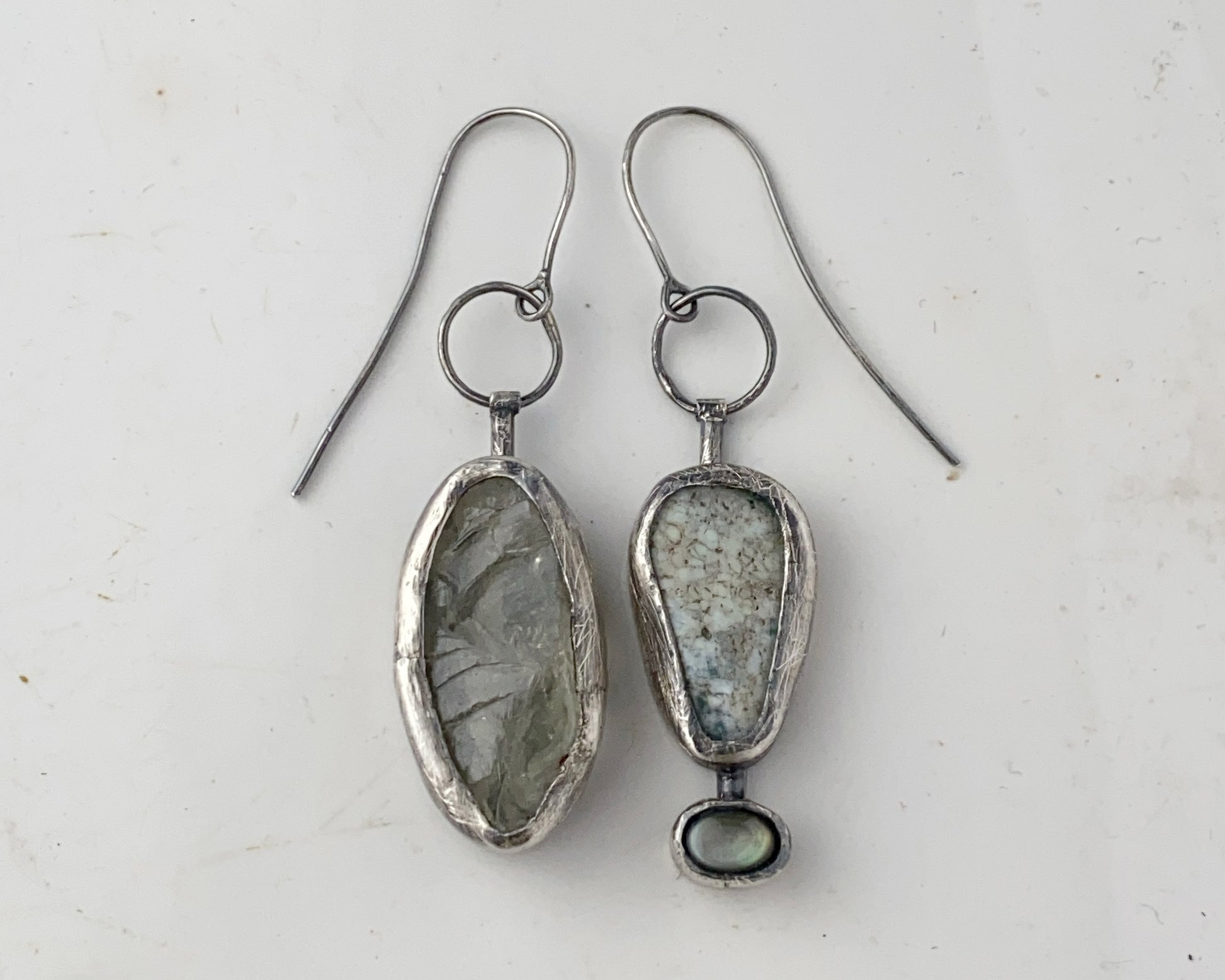 Handcrafted sterling silver earrings featuring a unique asymmetric design. The first earring contains prasiolite with a plant motif on the reverse side. The second earring combines chrysoprase and black abalone shell in a striking composition. Both pieces are set in textured sterling silver bezels with elegant ear hooks for comfortable wear.