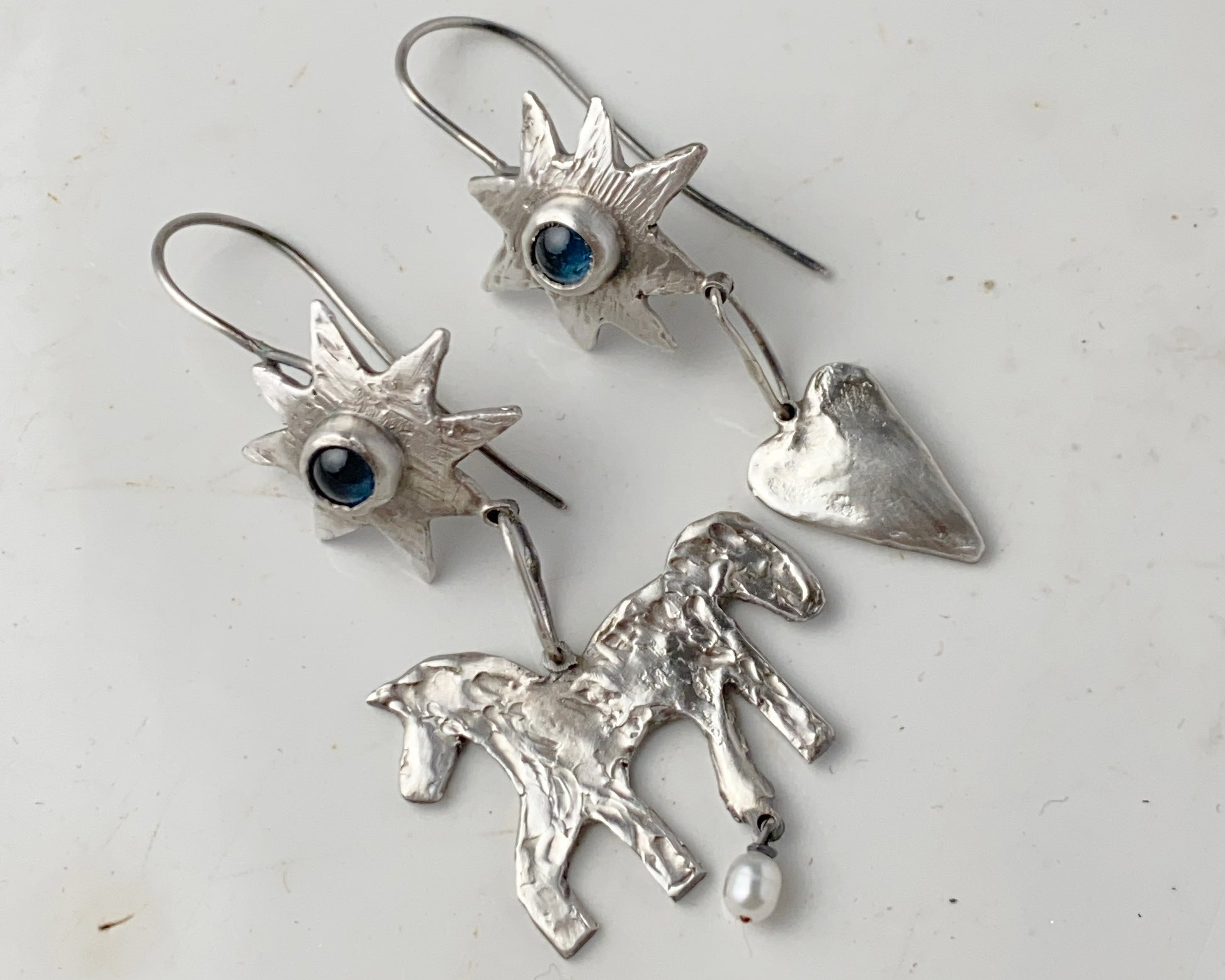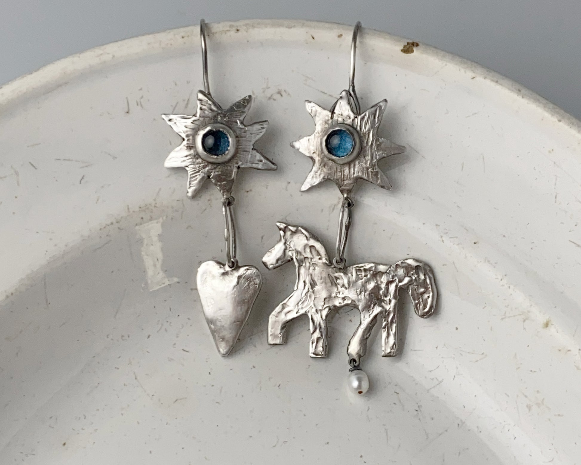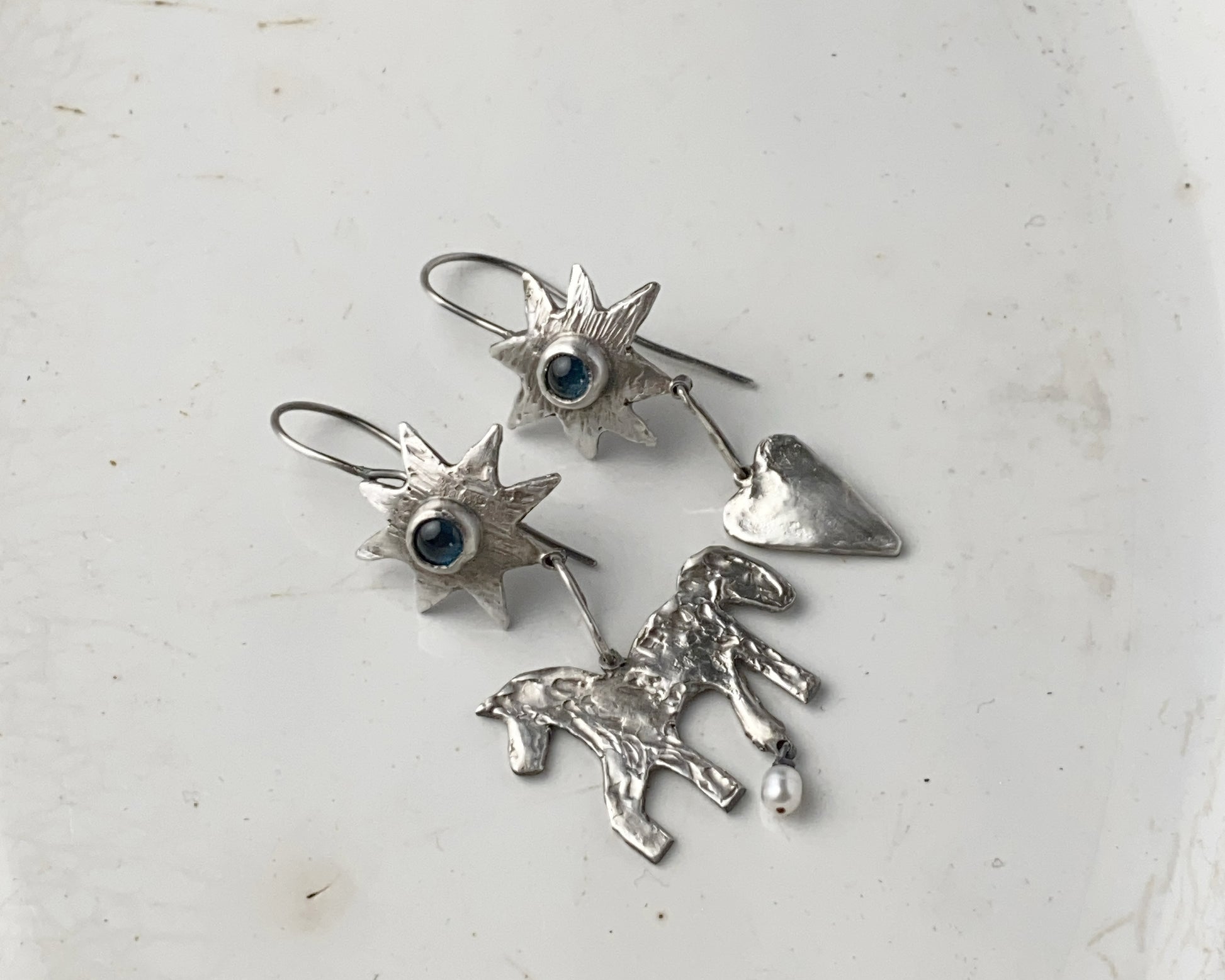 These handcrafted asymmetrical earrings feature sterling silver star studs with vibrant London blue topaz centers. One earring dangles a textured silver horse charm with a delicate pearl drop, while the other showcases a hammered heart pendant. Each piece highlights the natural beauty of the materials with an artisanal hammered finish.