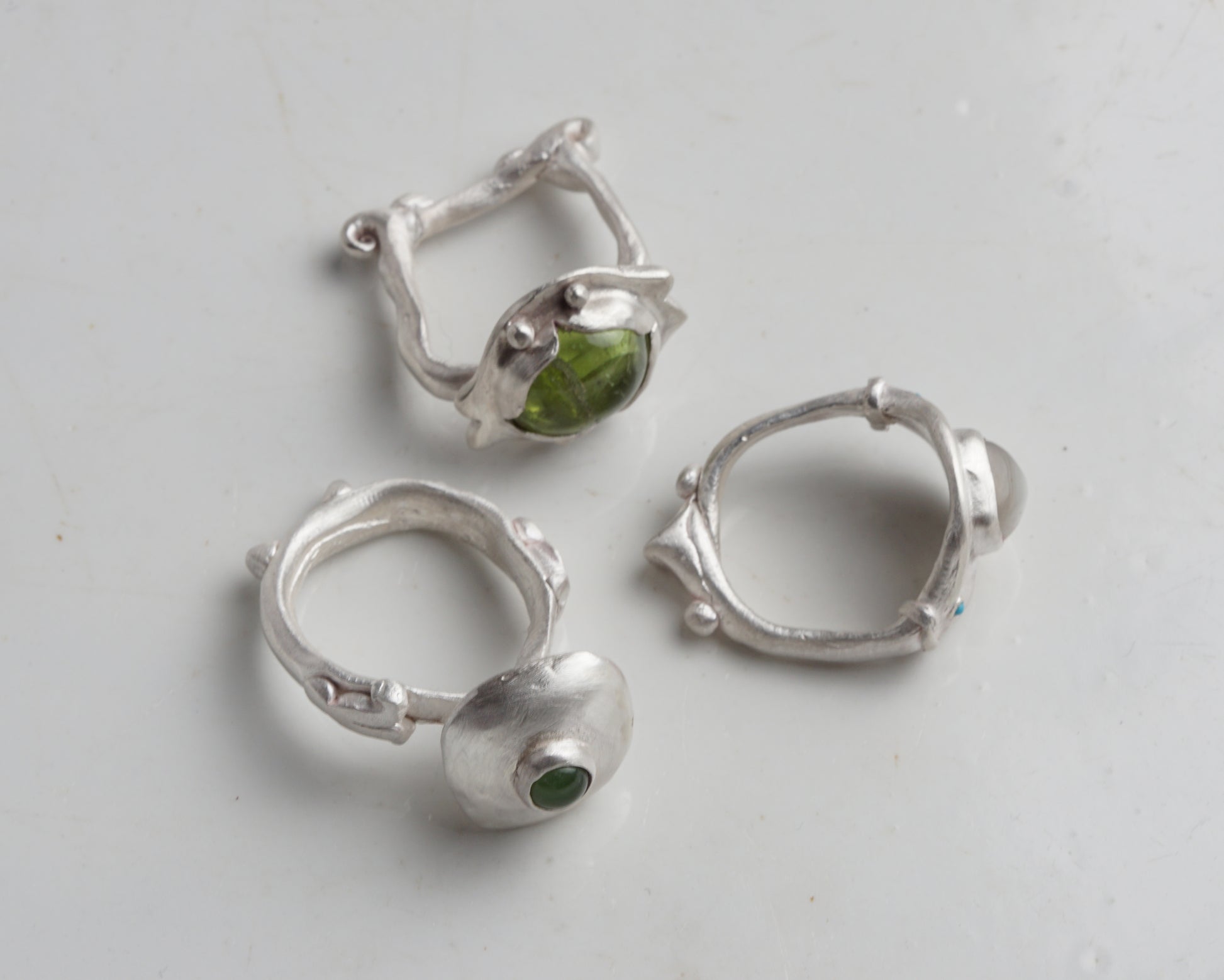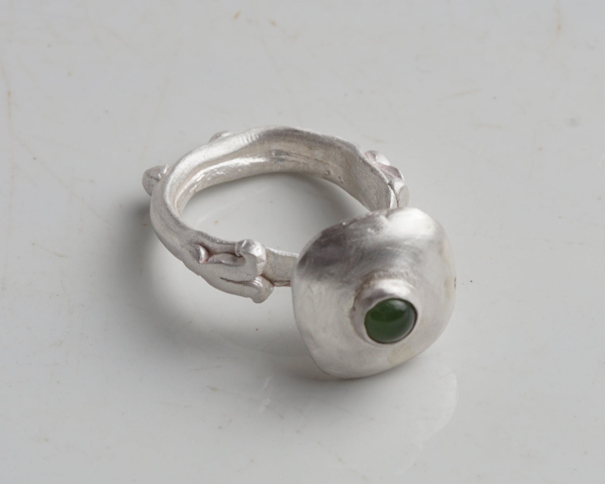 A handcrafted ring featuring an organic, irregular design that emphasizes raw texture and form. The piece is crafted with a matte metallic finish and set with a smooth, deep green jade cabochon.
