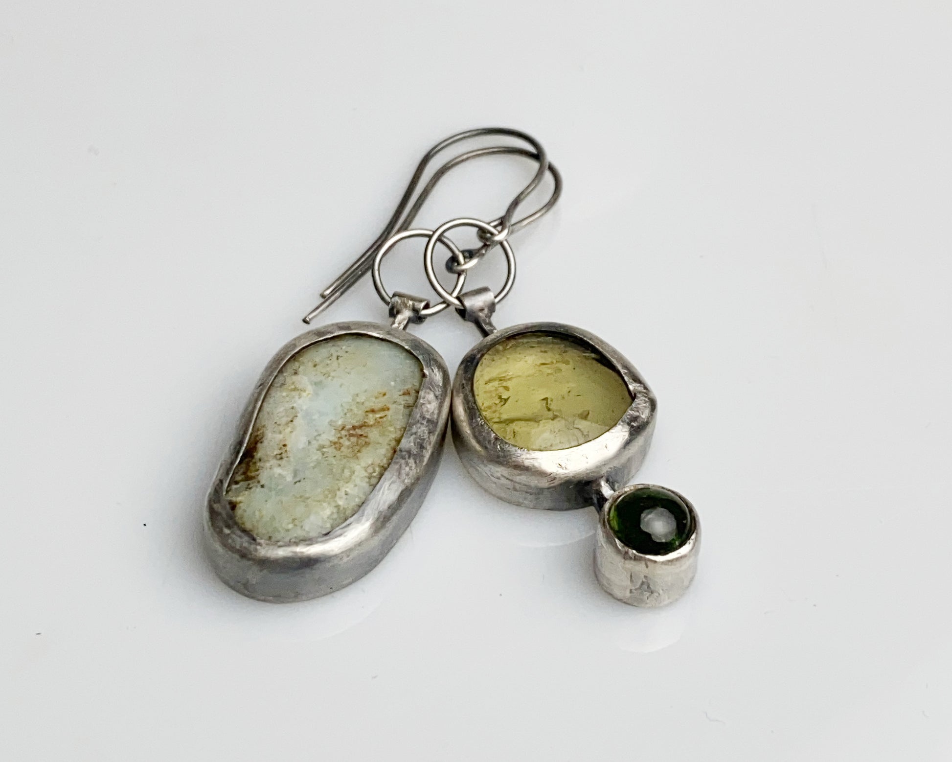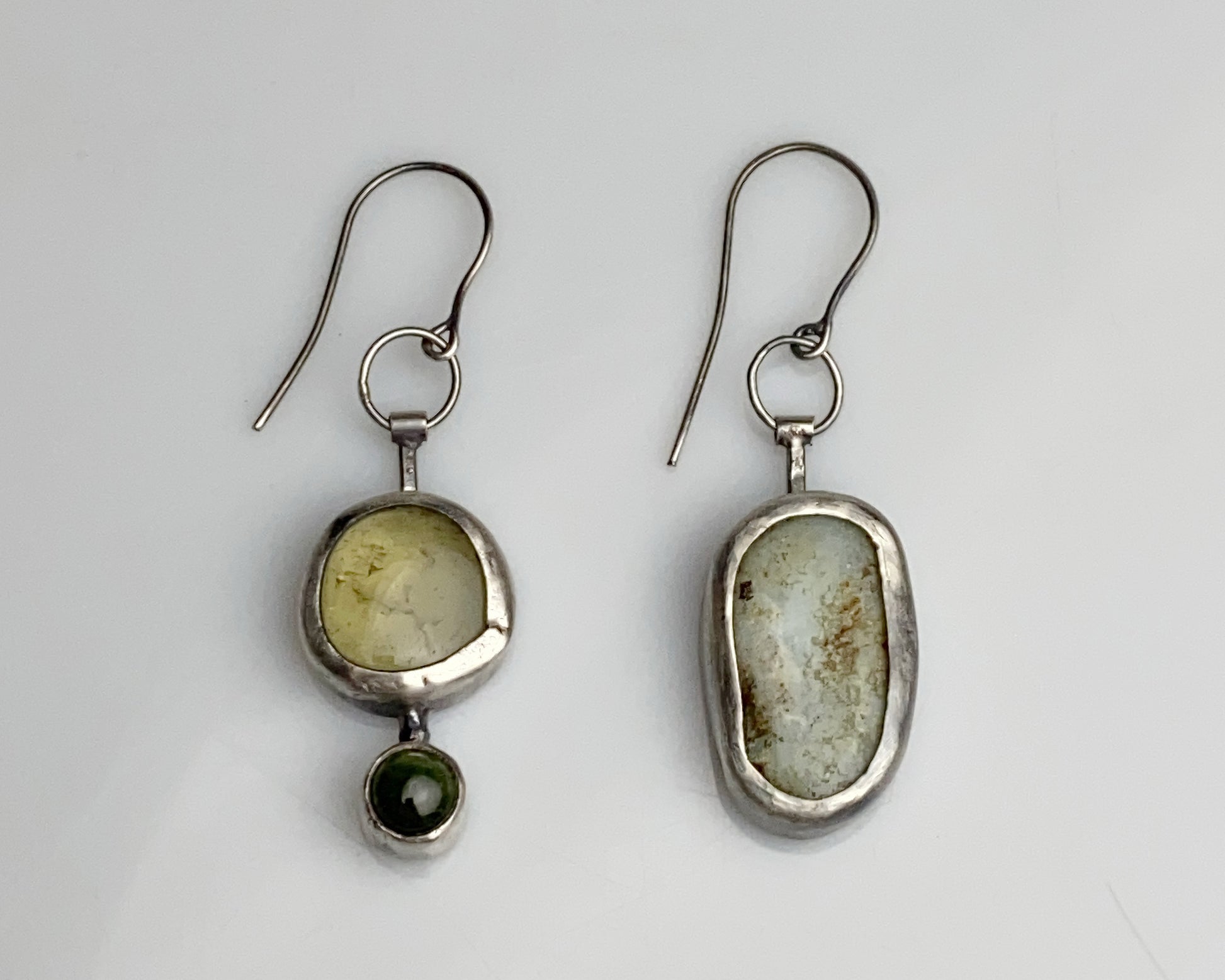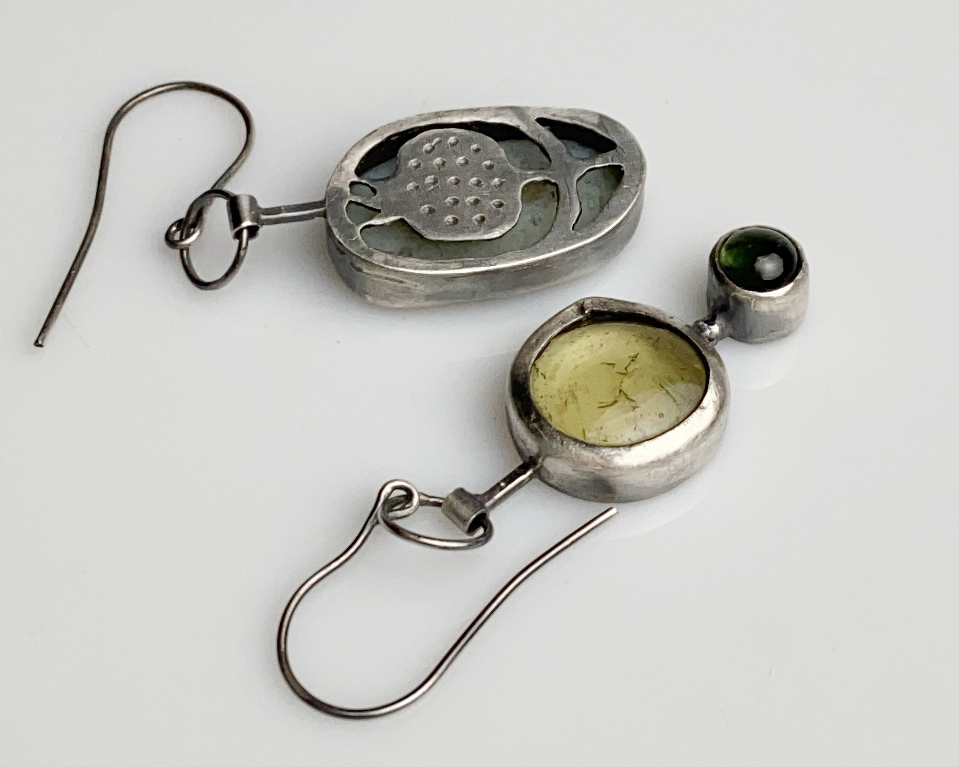 Sterling silver handcrafted earrings featuring green tourmaline, lemon quartz, and chrysoprase stones. One earring showcases a multi-stone design, while its companion reveals an intricate pomegranate pattern on the reverse side, creating an artistically asymmetrical pair.