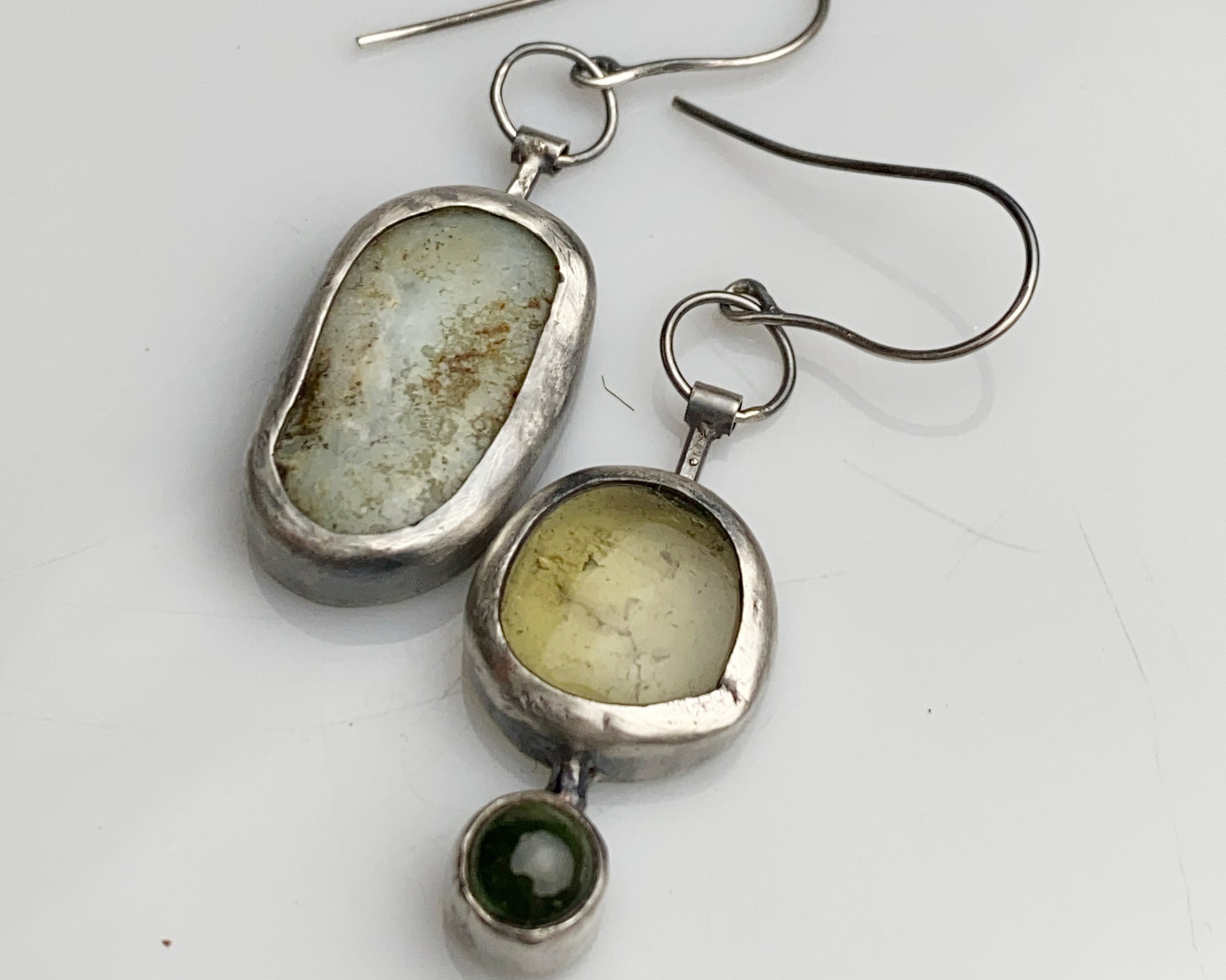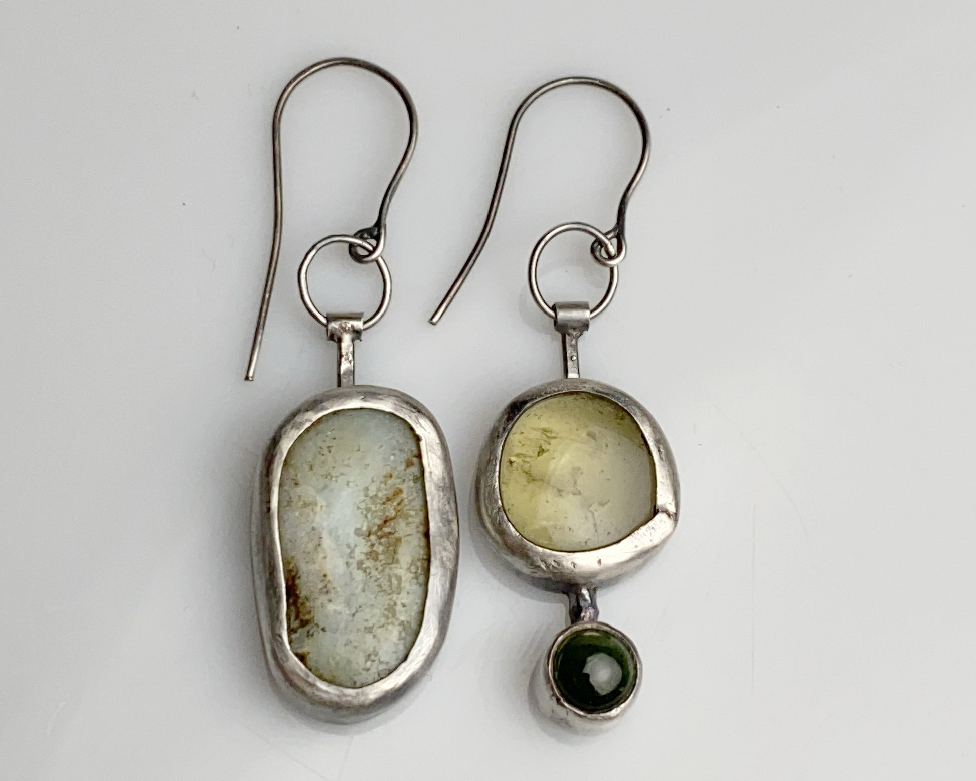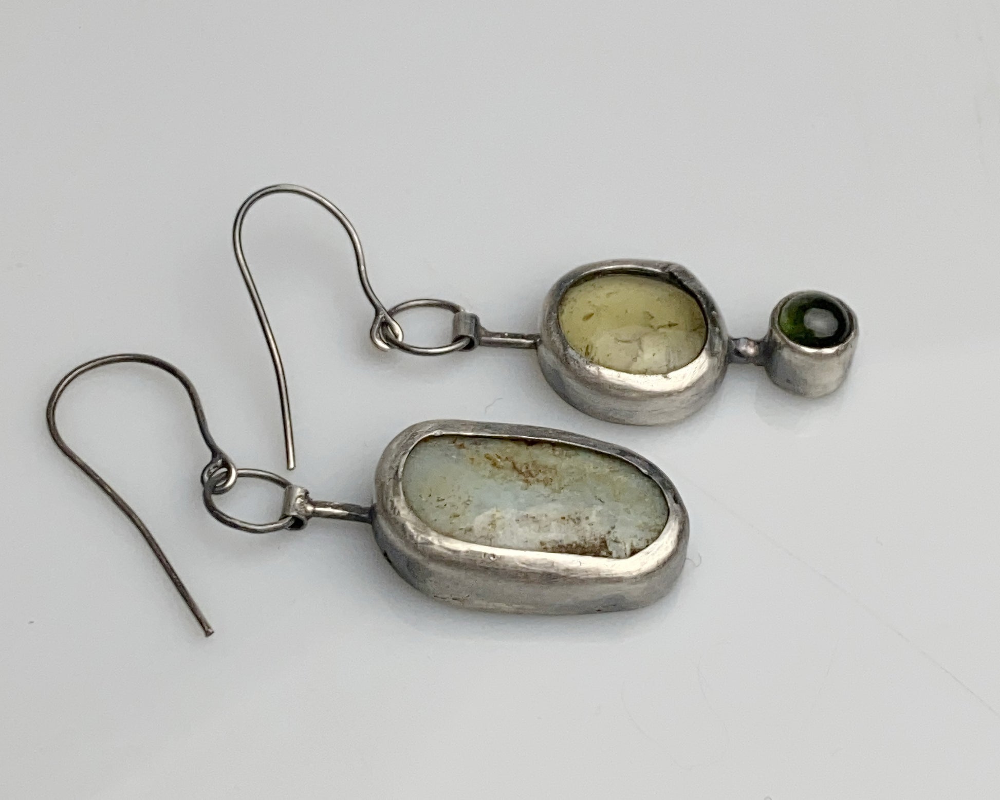 Sterling silver handcrafted earrings featuring green tourmaline, lemon quartz, and chrysoprase stones. One earring showcases a multi-stone design, while its companion reveals an intricate pomegranate pattern on the reverse side, creating an artistically asymmetrical pair.