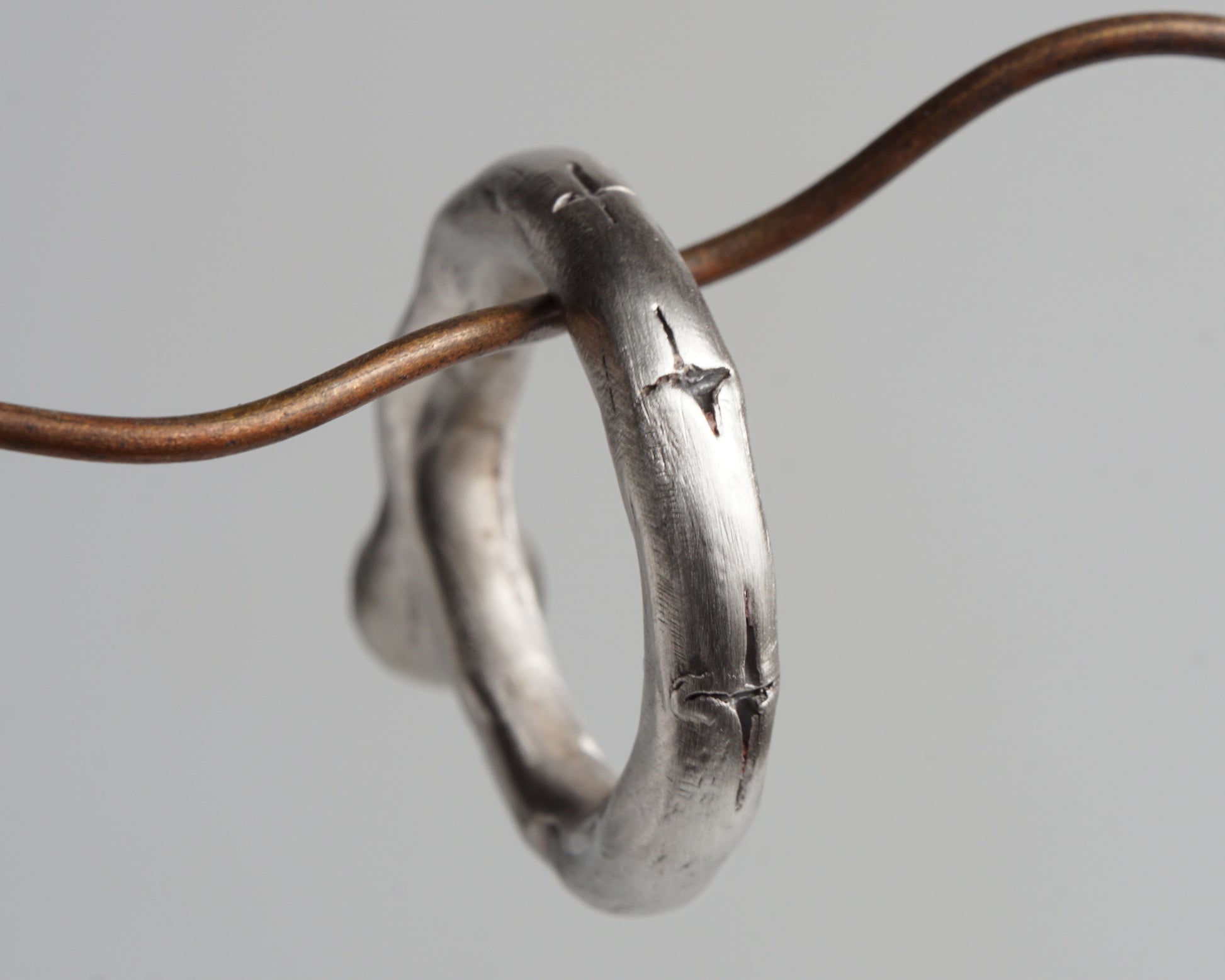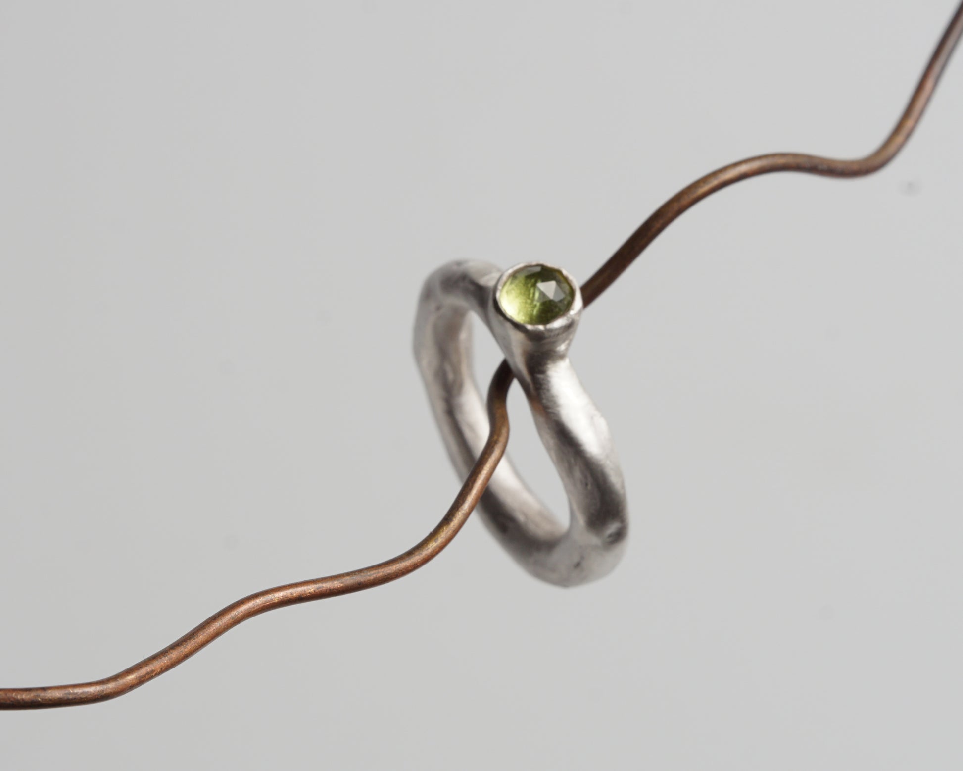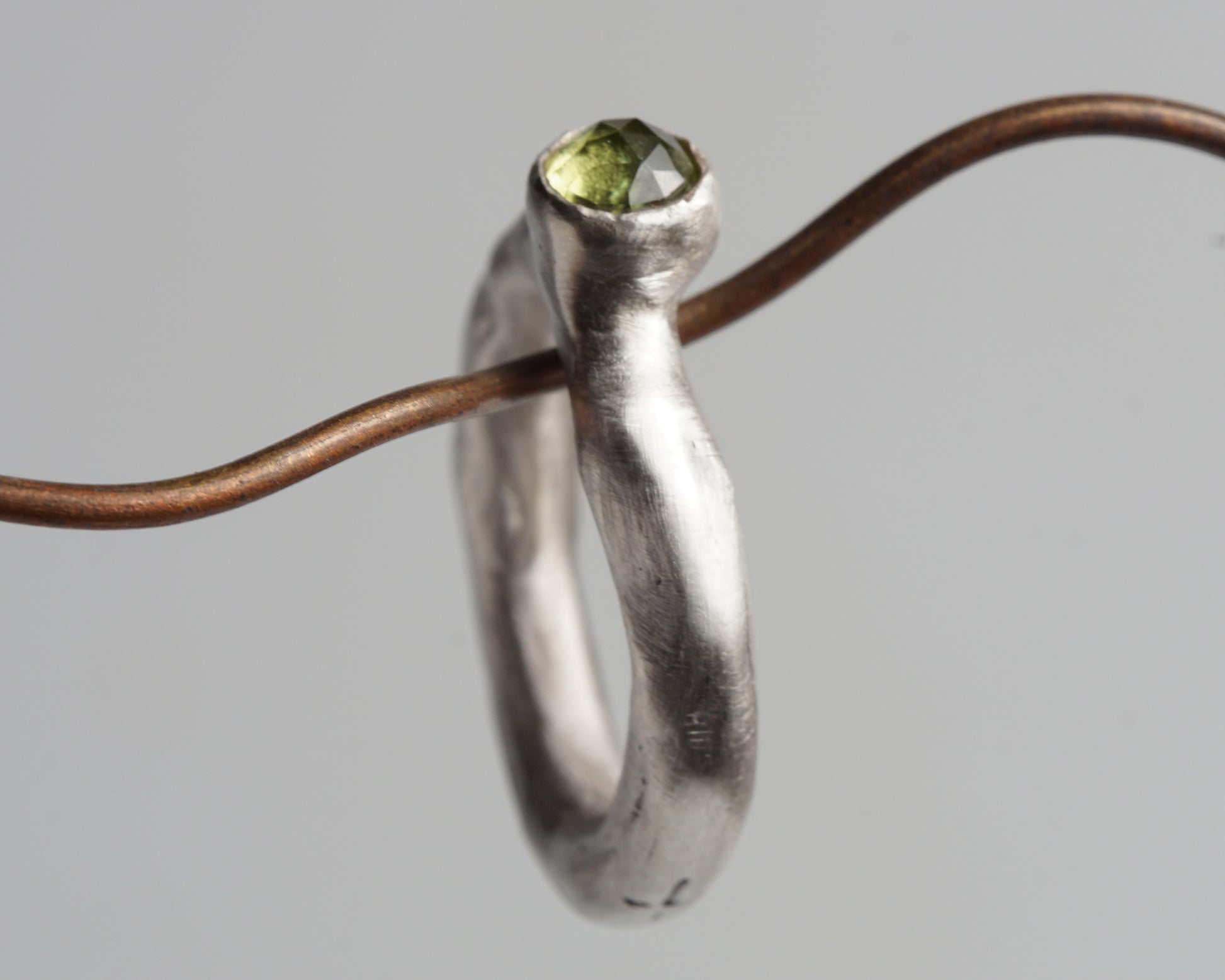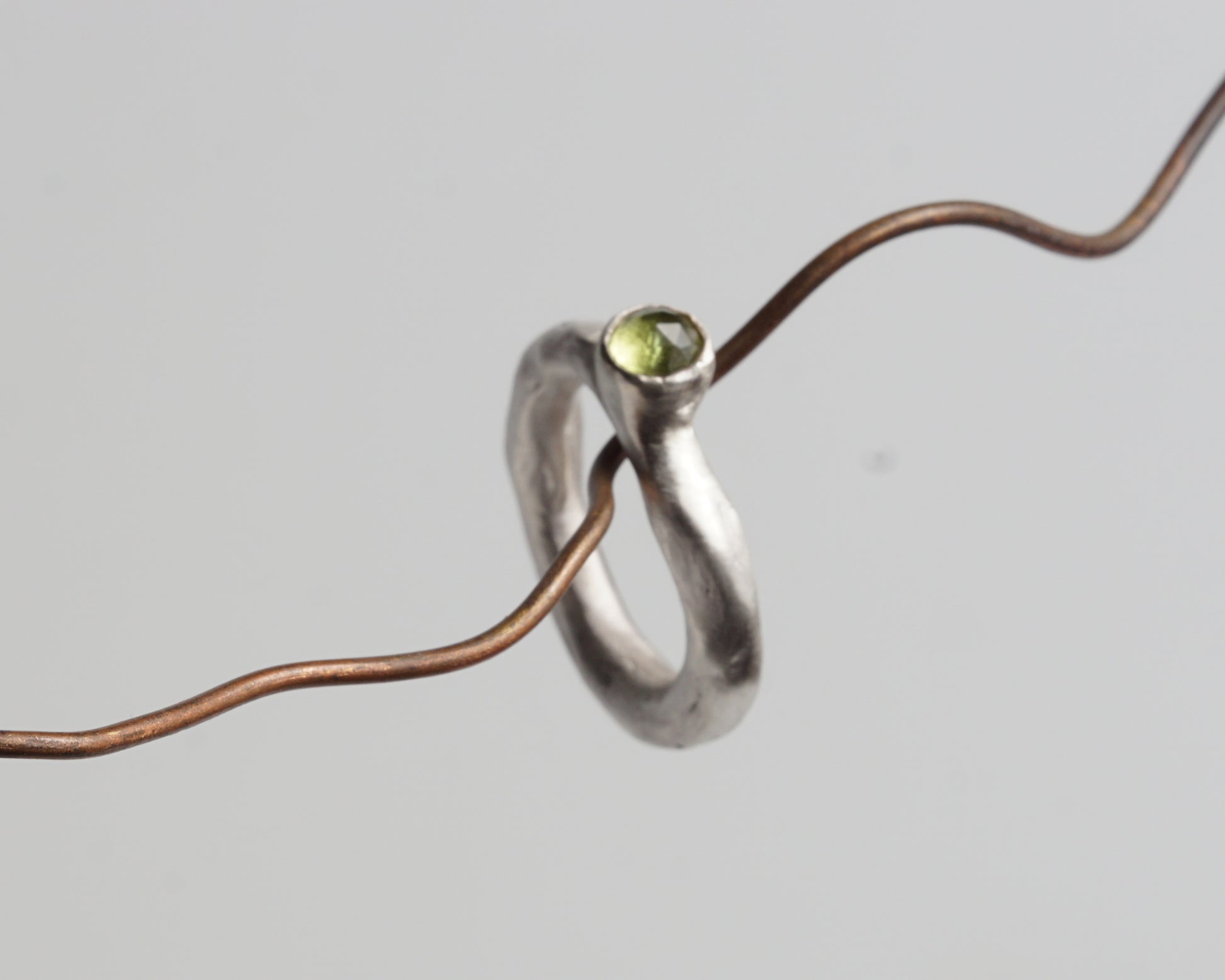 A solid silver ring set with peridot, featuring three star marks on the back side. The ring has a refined matte finish that emphasizes the natural form of the metal and the soft green tone of the stone.